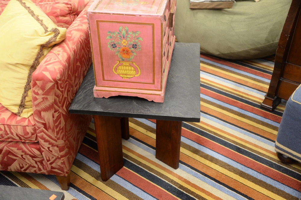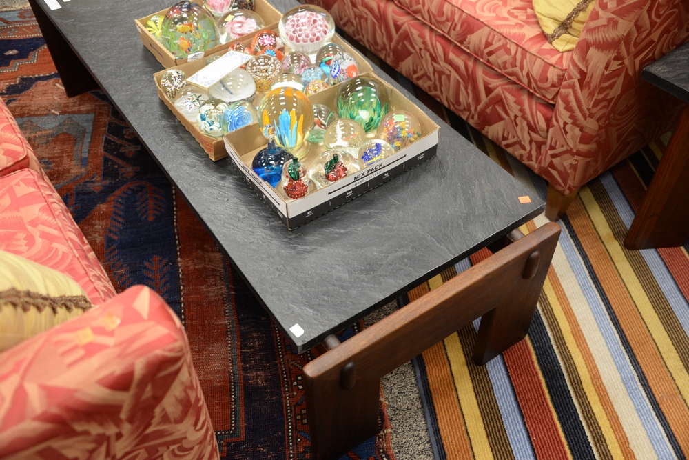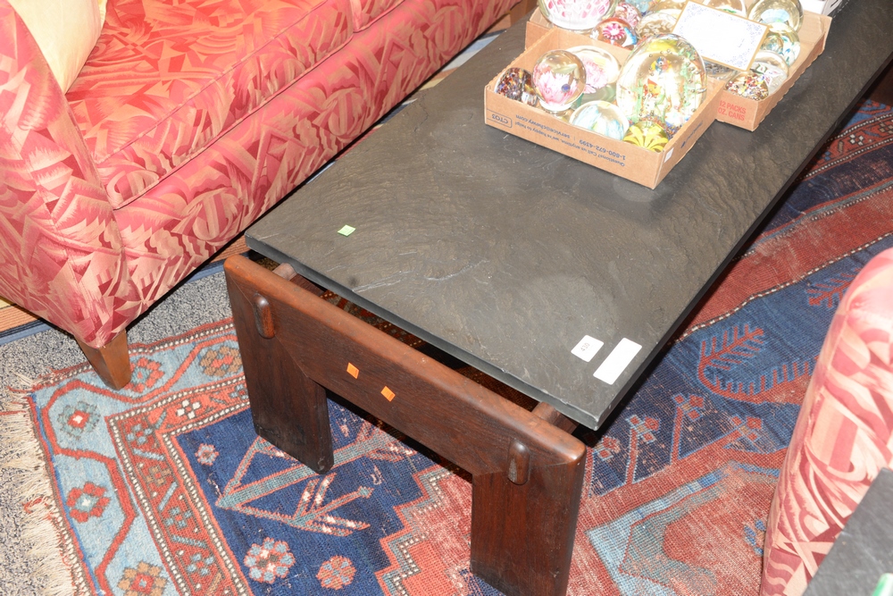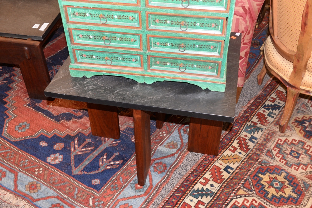 Lot 430: Adrian Pearsall Three Piece Lot, to include a walnut and slate top coffee table along with a pair of matching slate top side tables,…