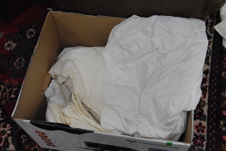 Lot 430: Box of bed linens custom Malabor Grove Limited full / queen bed cover, comforter and matching pillow cover and sets of sheets.