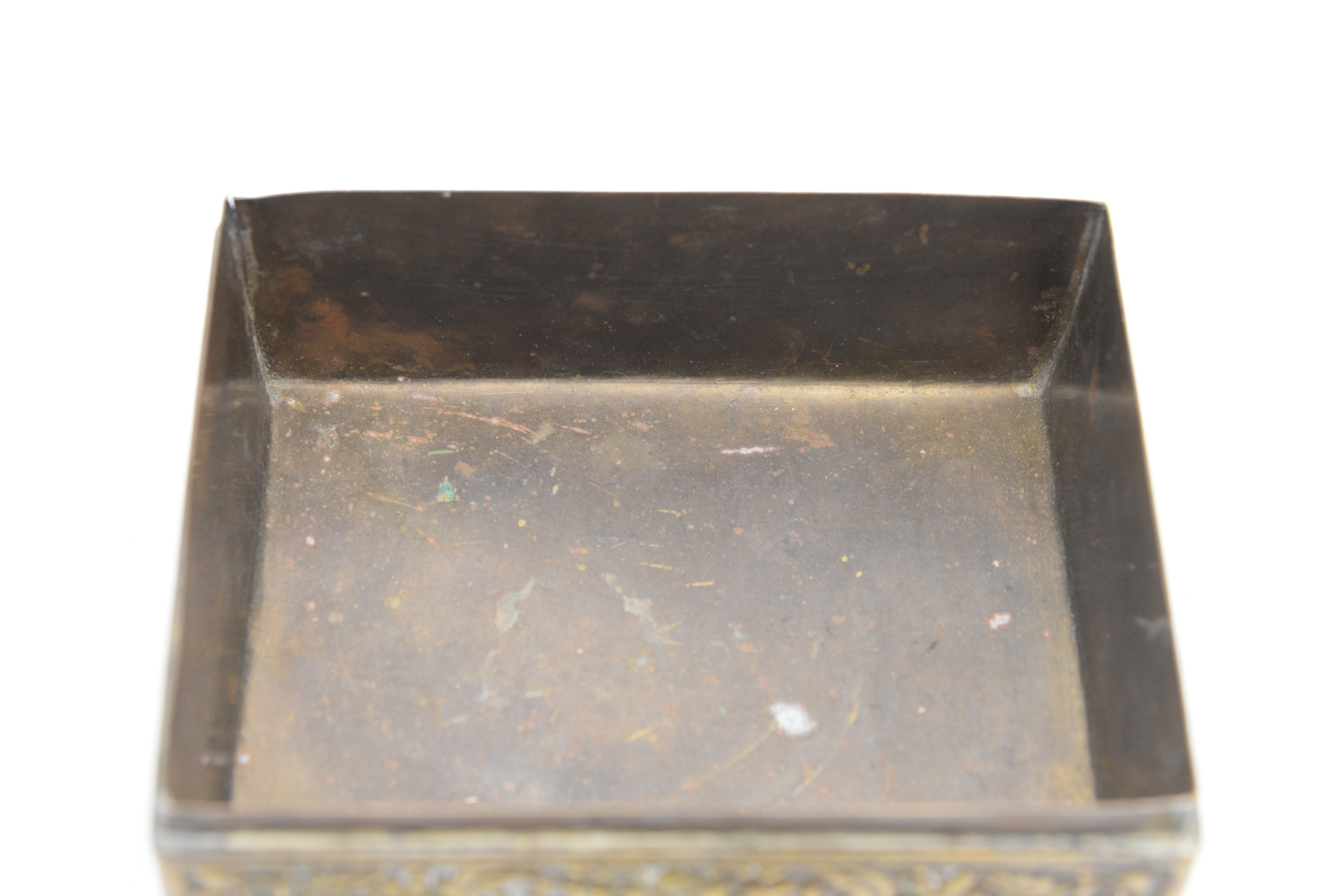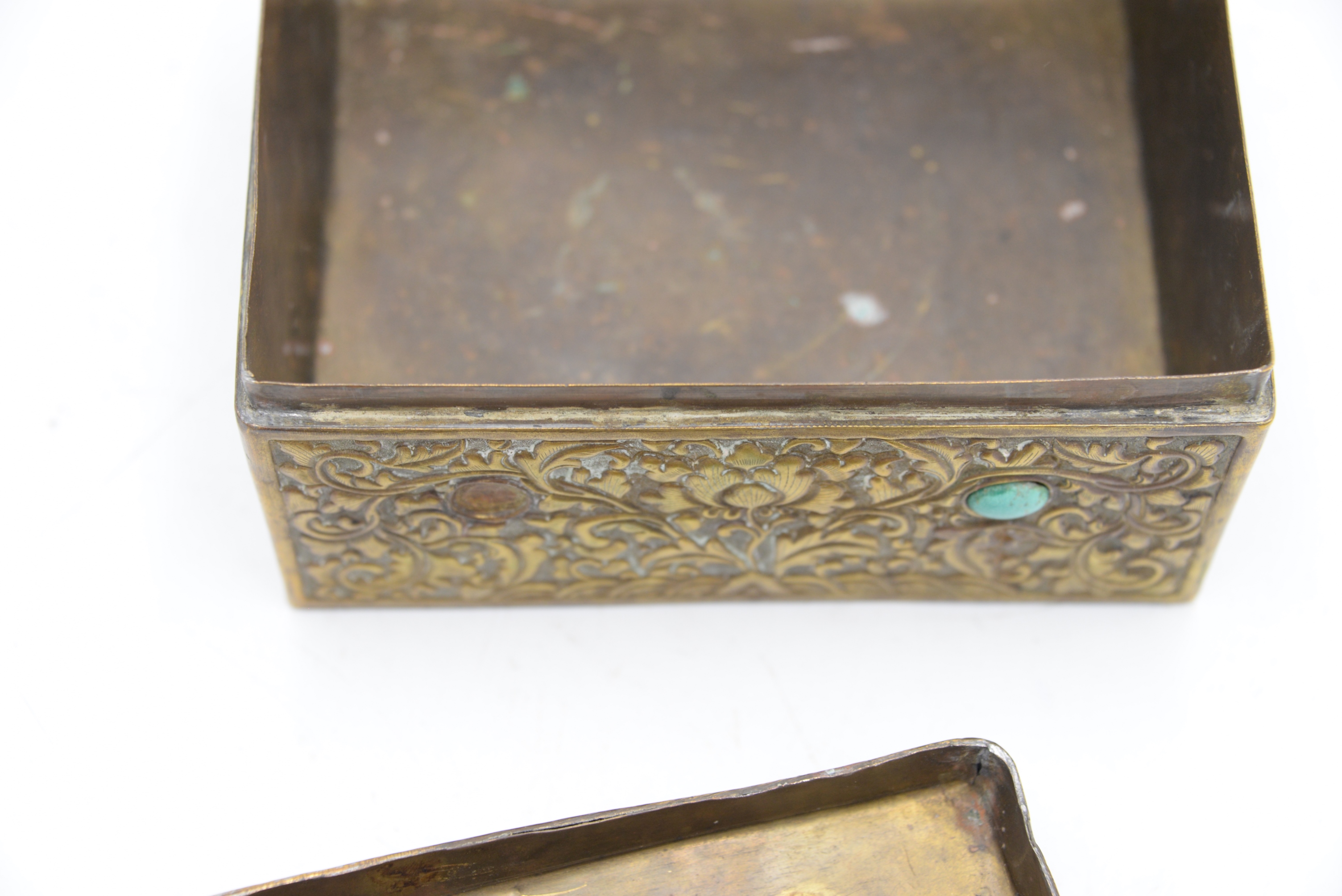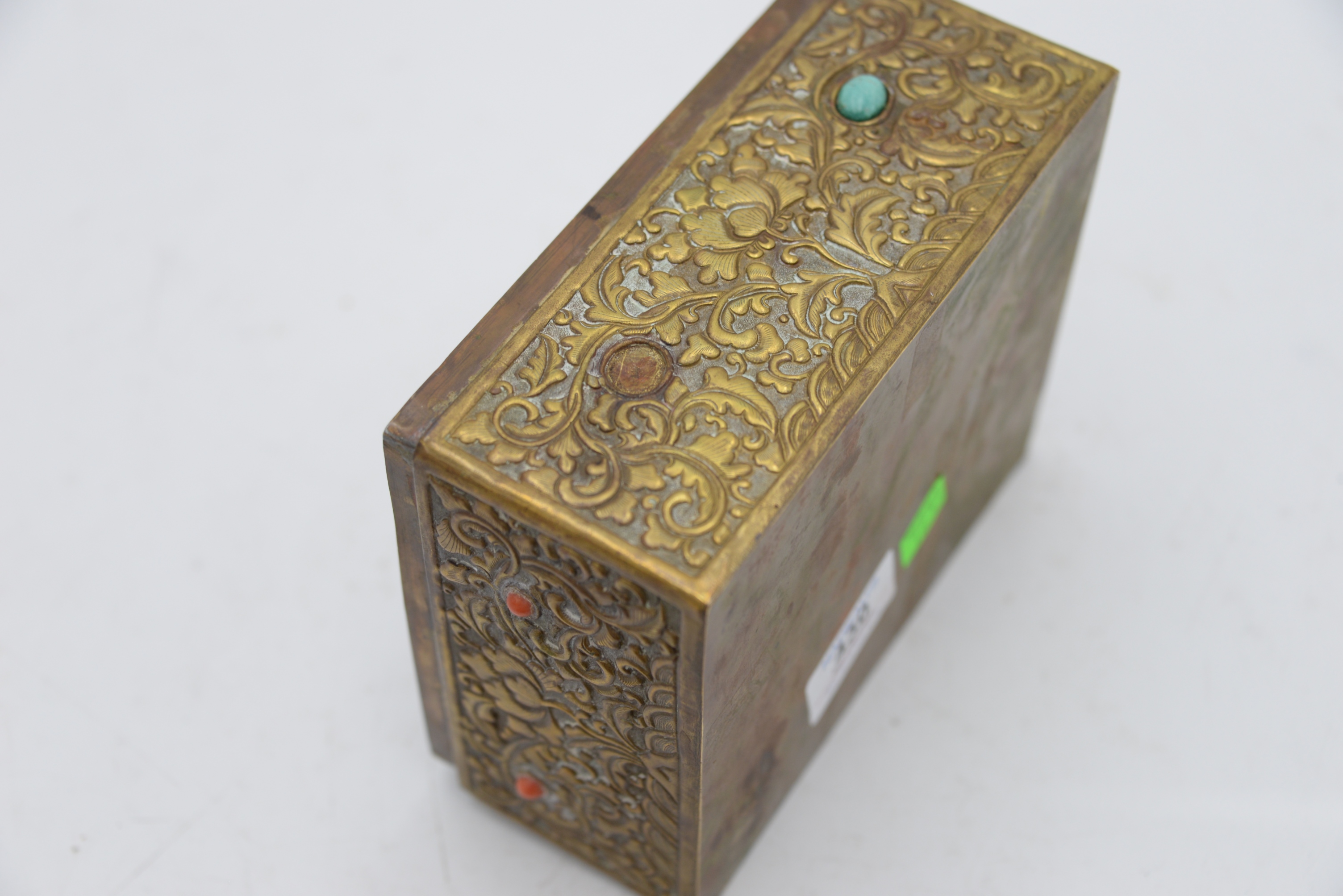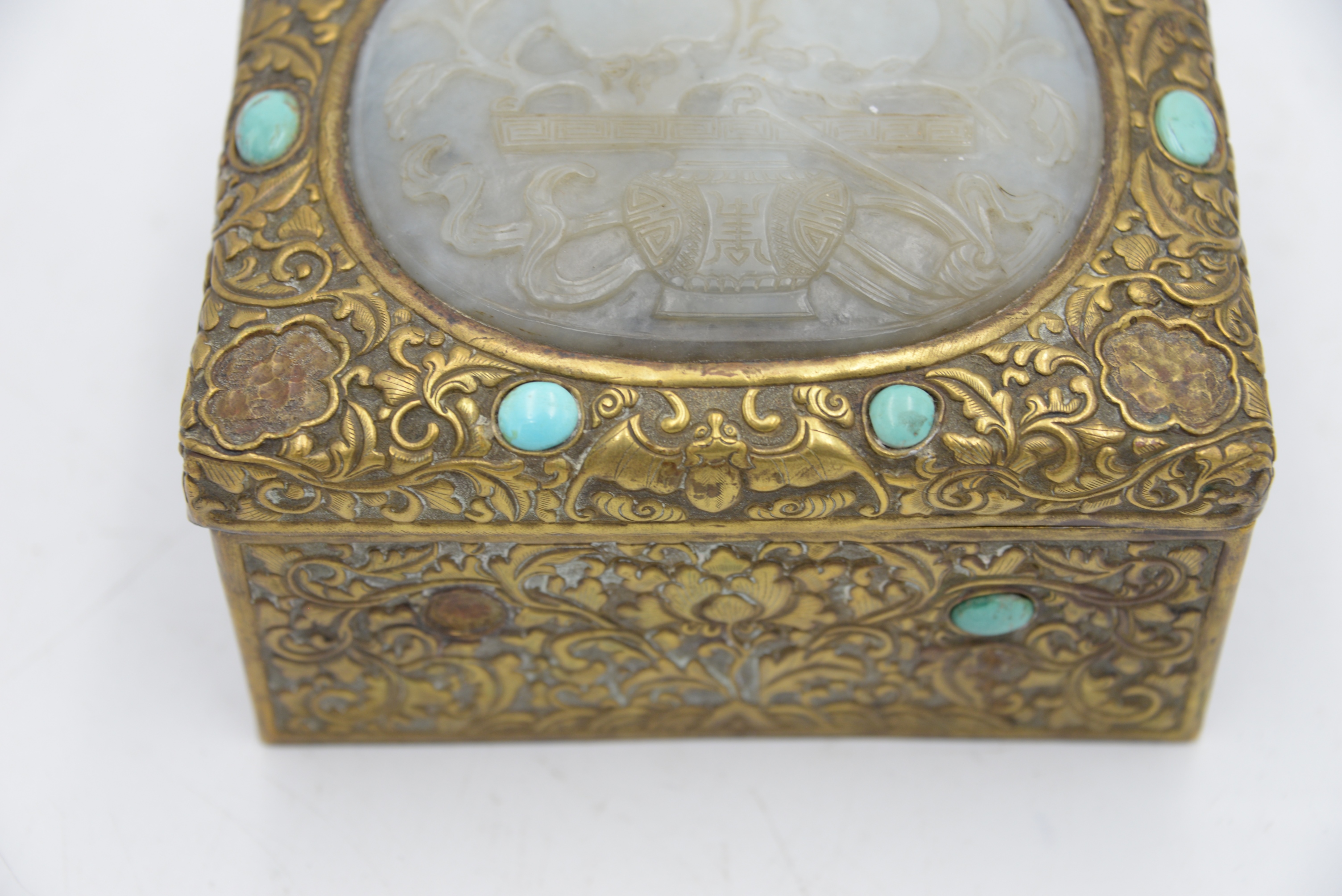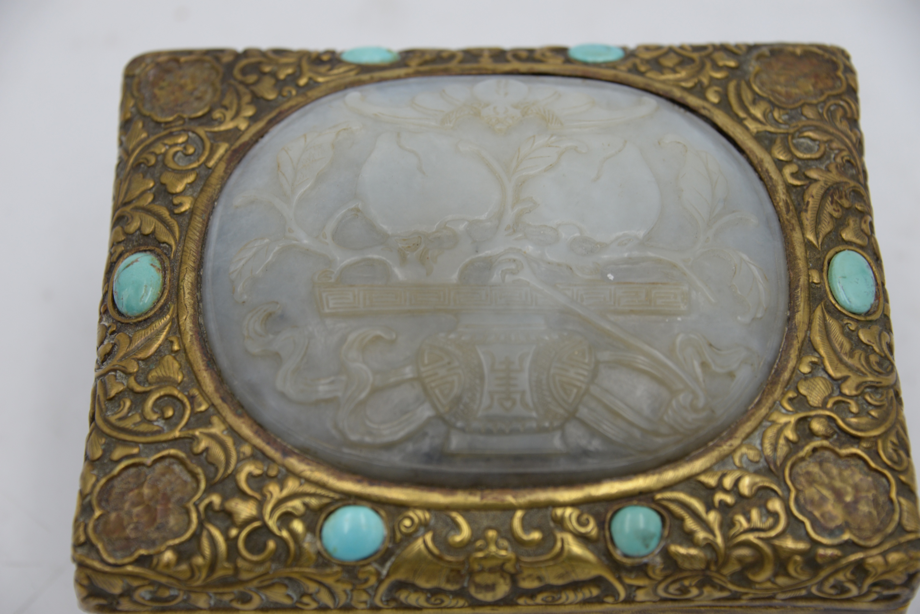 Chinese Brass Box, mounted with center carved white jade, along with turquoise and various stones, some missing, late 19th century box,