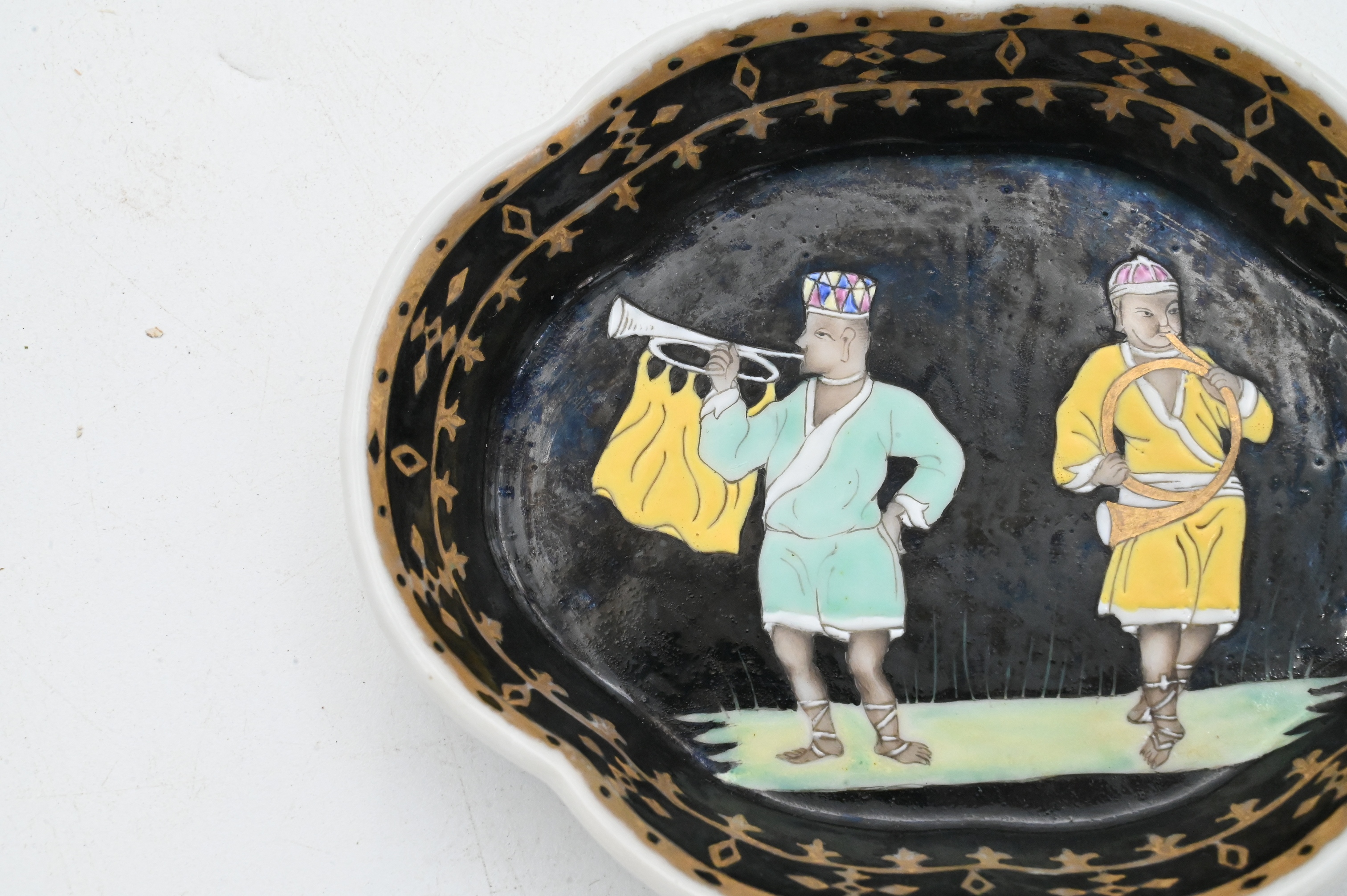 A small porcelain dish with scalloped rim, decorated in famille rose enamels with two European figures,a trumpeter and figure with French horn, against a black ground within a gilt star border. Part of the “Pronk” series of designs made for the Dutch East India Company and continued in later Qing export production