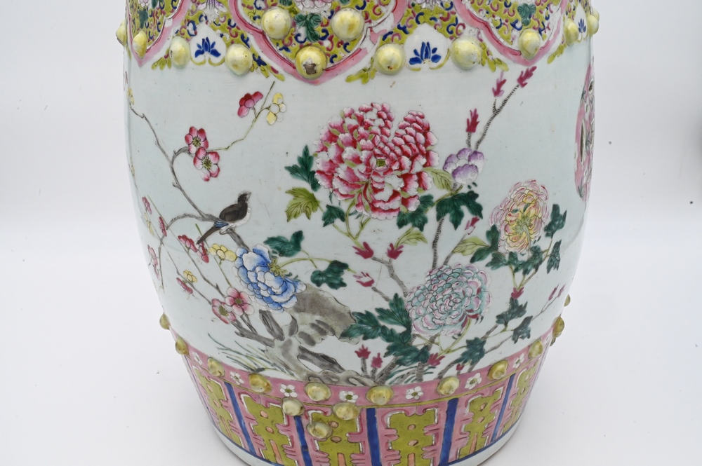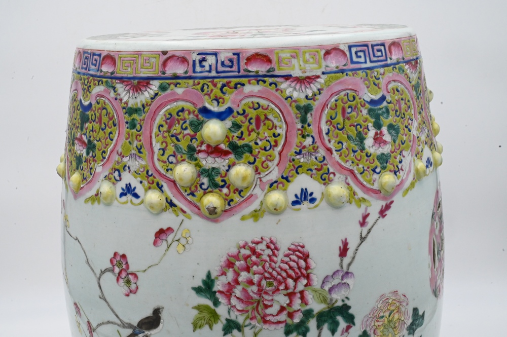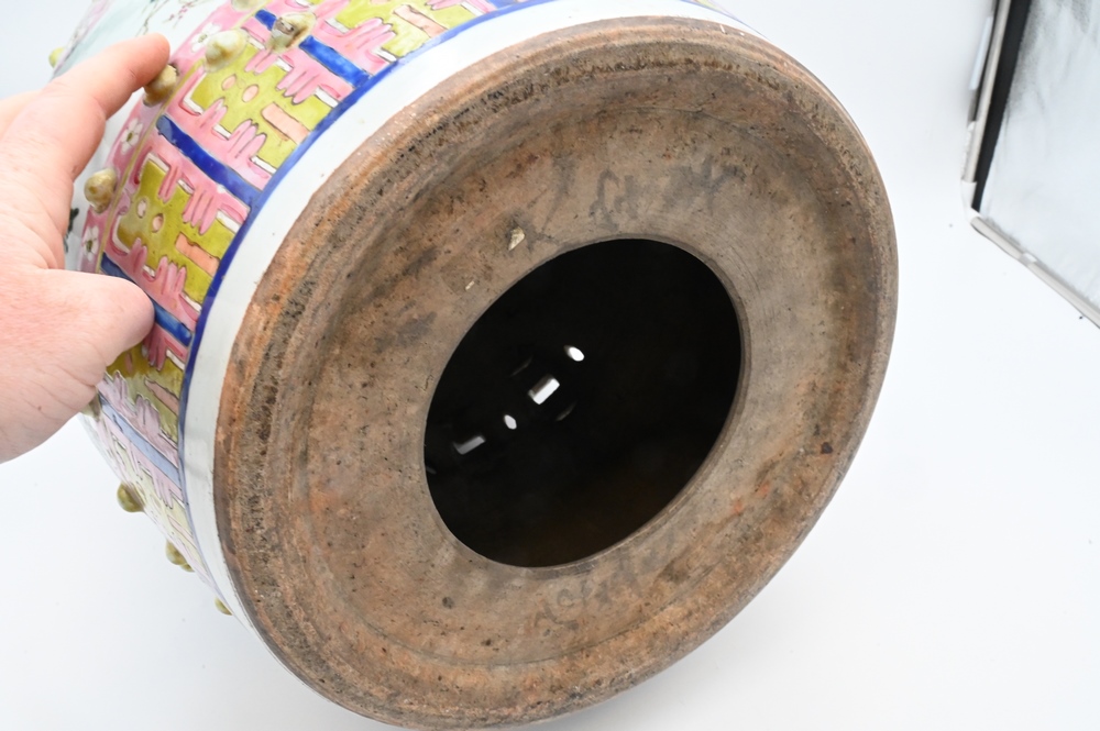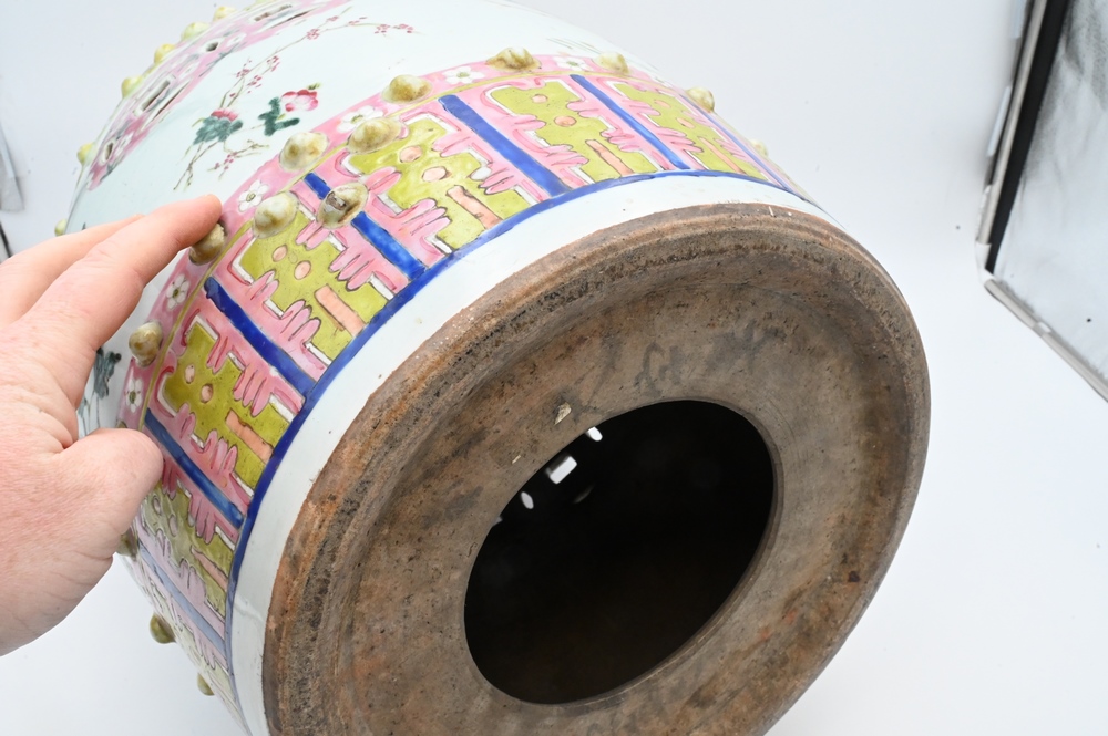 Lot 430: Chinese Famille Rose Barrel Garden Seat, mid 19th century, gadroon decoration on base and large jui-head band, Greek key and peaches around throat, openwork double-coin handles and main body decorated with delicate floral sprays on a white ground, height 18 inches. Provenance: An estate from Redding, CT.
