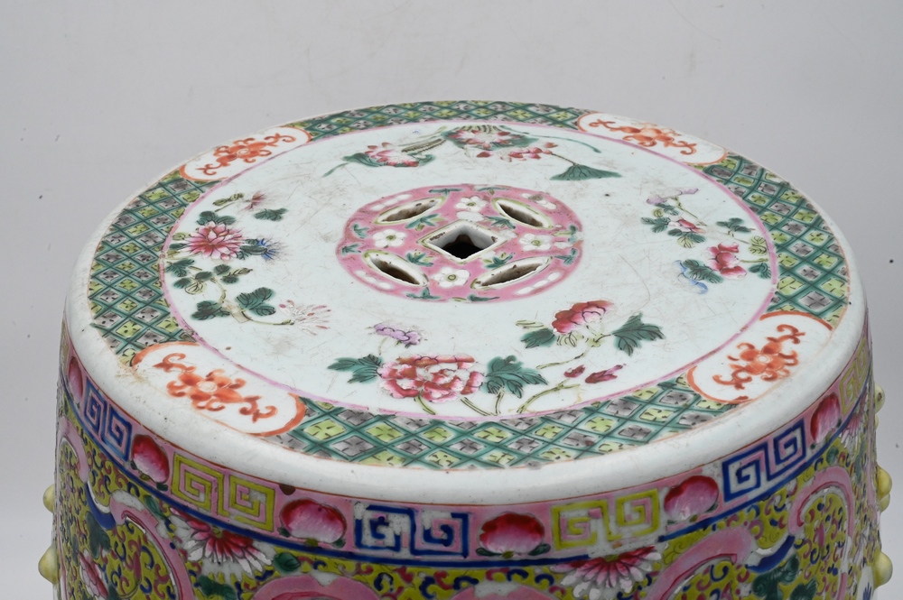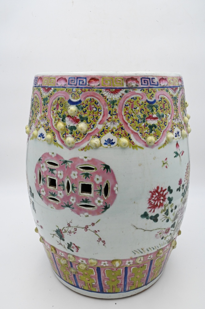 Chinese Famille Rose Barrel Garden Seat, mid 19th century, gadroon decoration on base and large jui-head band, Greek key and peaches around throat, openwork double-coin handles and main body decorated with delicate floral sprays on a white ground, height 18 inches. Provenance: An estate from Redding, CT.