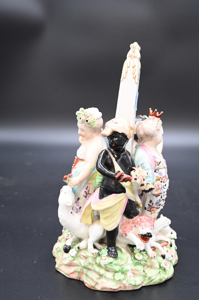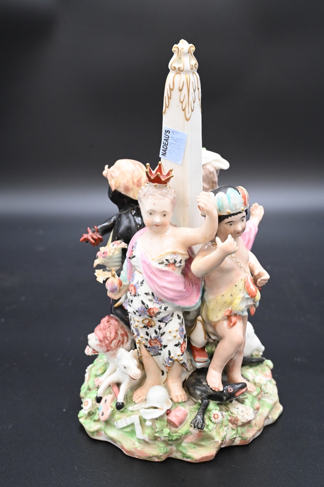 English Porcelain Allegorical Figure, to include four royalty figures representing Asia, Europe, America and Africa, with animals, surrounding obelisk, height 9 3/4 inches.