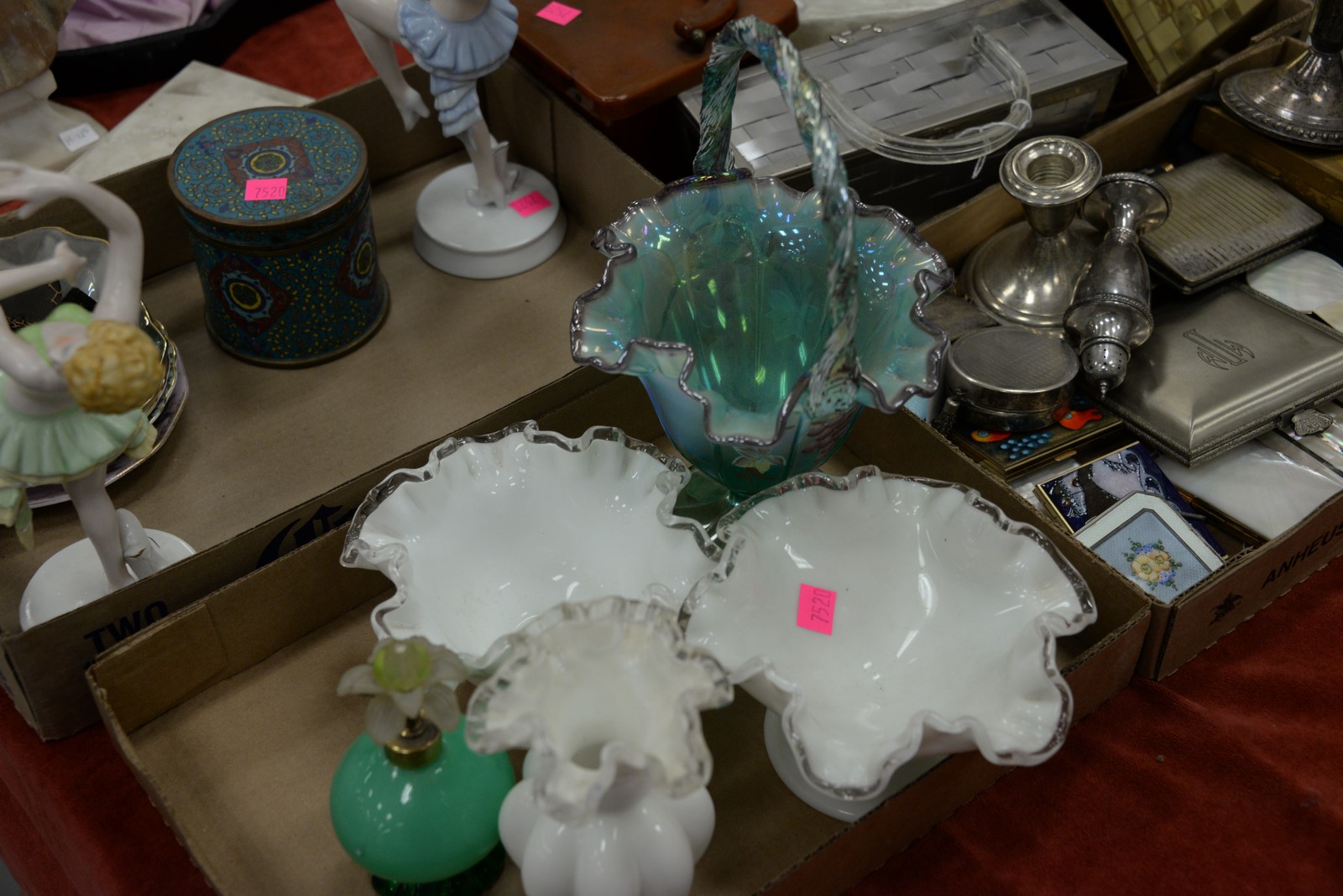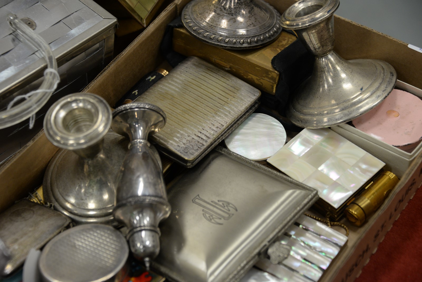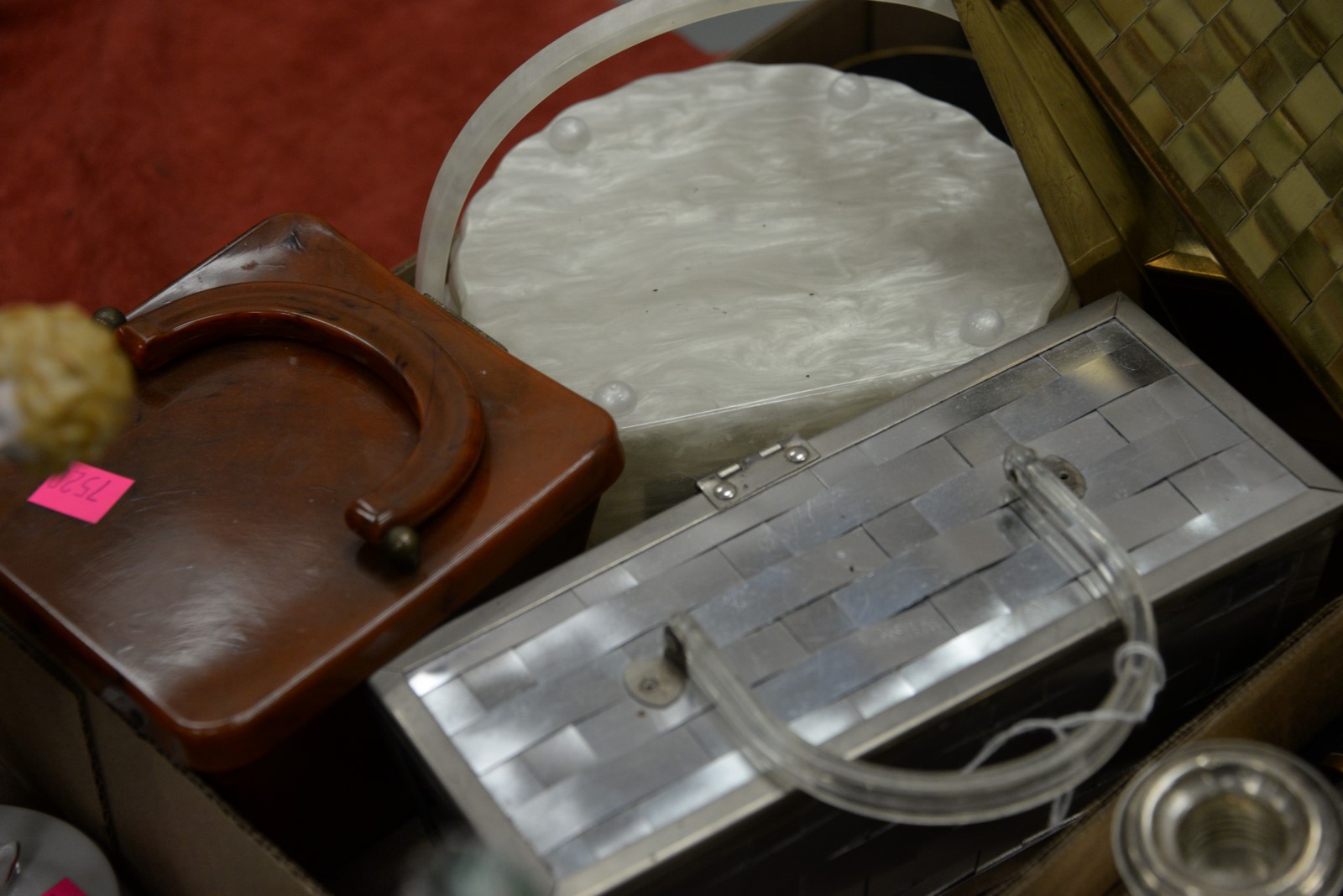 Four box lots including compacts, sterling candlesticks, Fenton basket, pearl tone dresser set, four vintage purses, marble bust, etc.