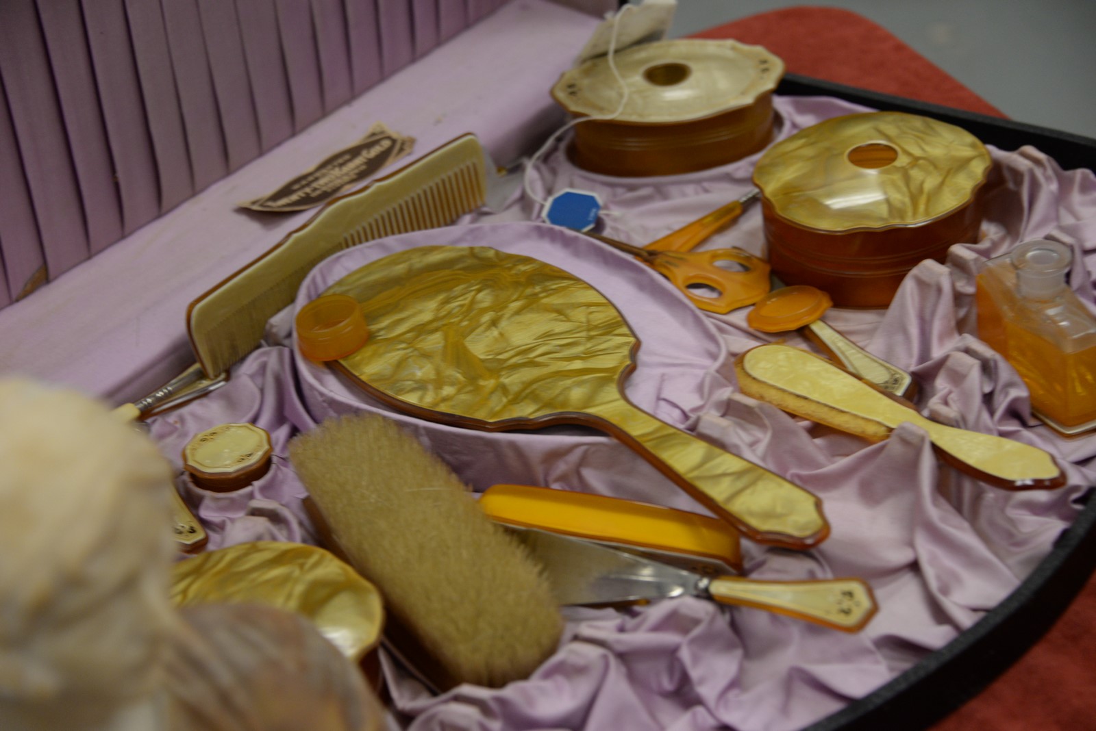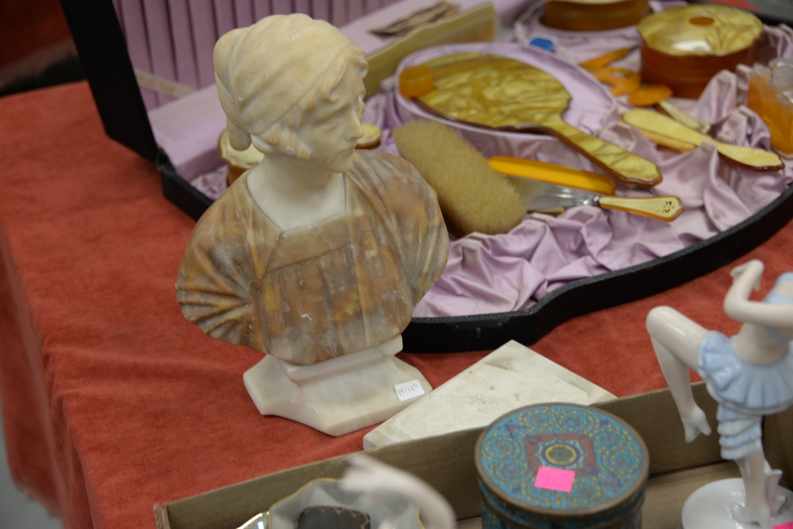 Lot 430: Four box lots including compacts, sterling candlesticks, Fenton basket, pearl tone dresser set, four vintage purses, marble bust, etc.