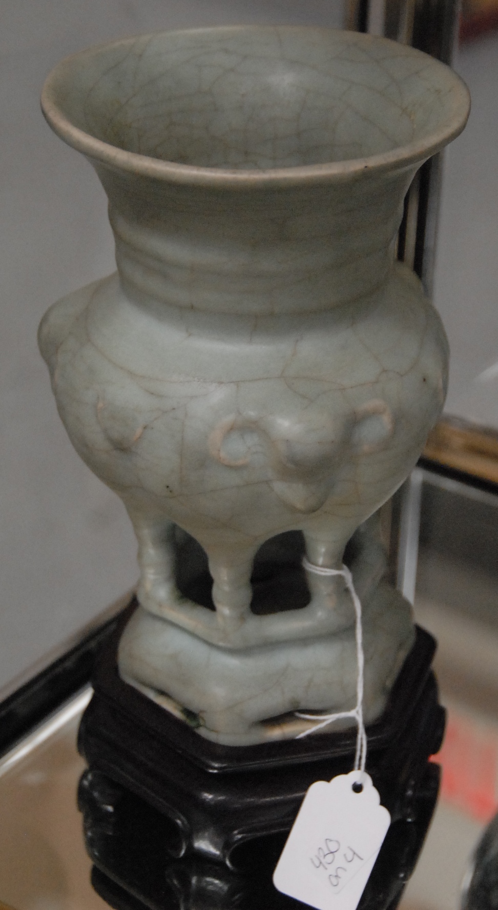 Four piece lot to include a pair of underglaze blue and red Meiping vases decorated with children, spurious Yongzheng marks ht. 9in., a celadon vase in cuspidor shape with orange zoomorphic handles and phoenix medallions, spurious six-character Yongzheng mark ht. 7in. and crackled celadon vase in archaic style of hexapod vessel on stand with applied rams heads, fitted wooden stand 8in., all 19th-20th century.