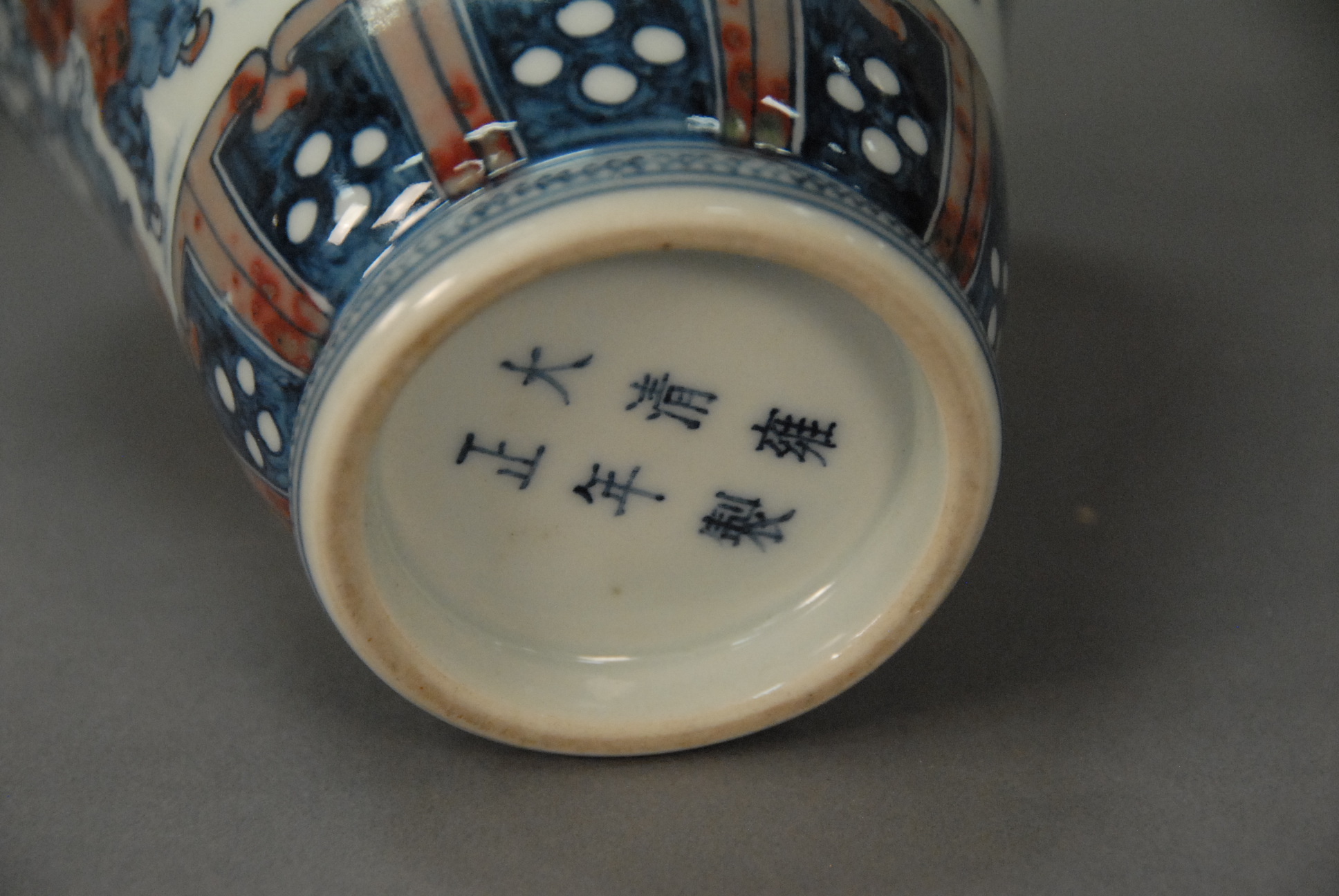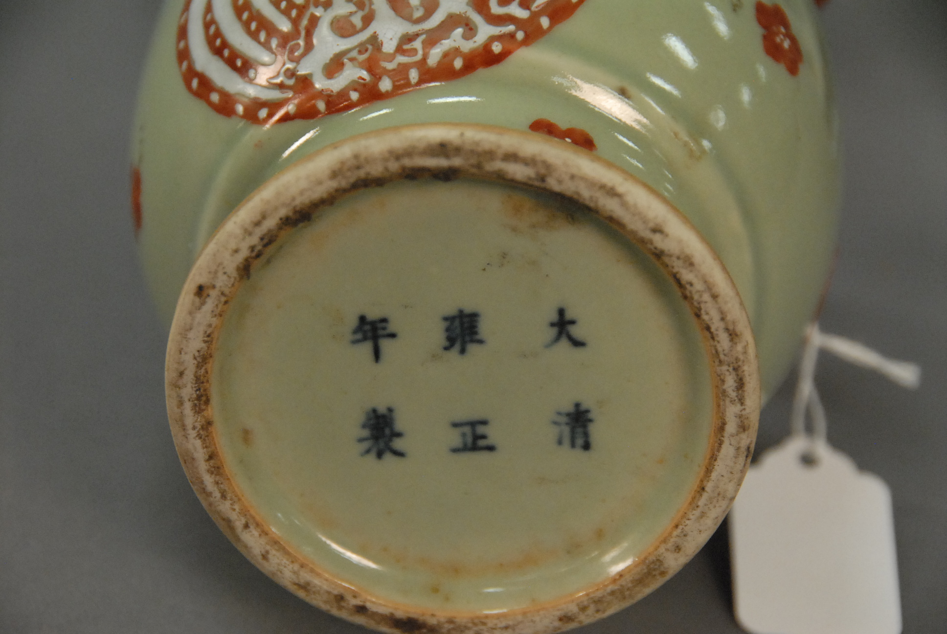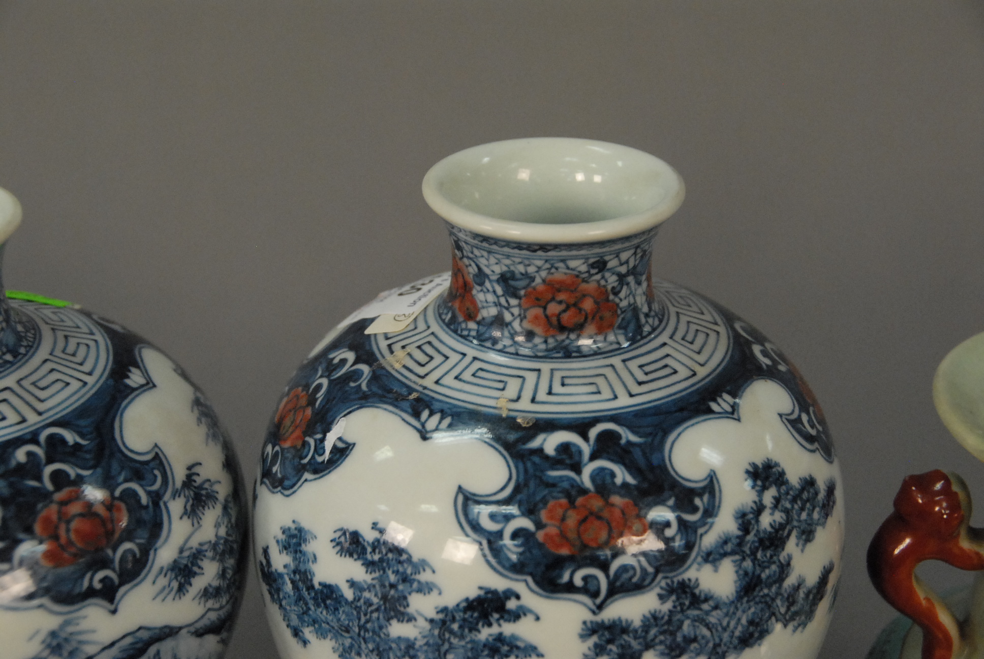 Lot 430: Four piece lot to include a pair of underglaze blue and red Meiping vases decorated with children, spurious Yongzheng marks ht. 9in., a celadon vase in cuspidor shape with orange zoomorphic handles and phoenix medallions, spurious six-character Yongz