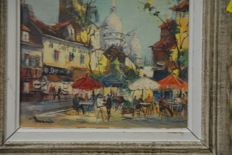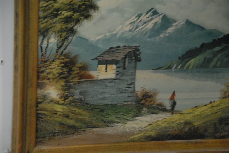 Lot 430: Group of four oil paintings including Paris courtyard scene signed indistinctly, two Italian mountains signed indistinctly, and wint…