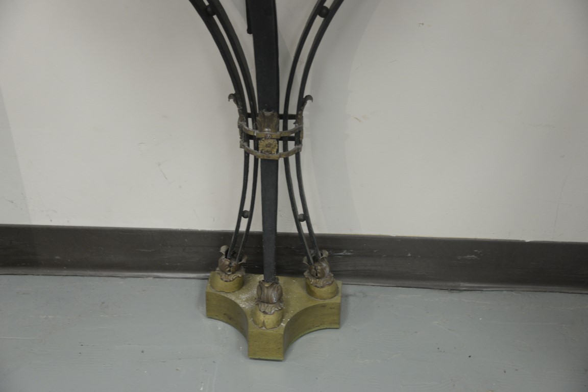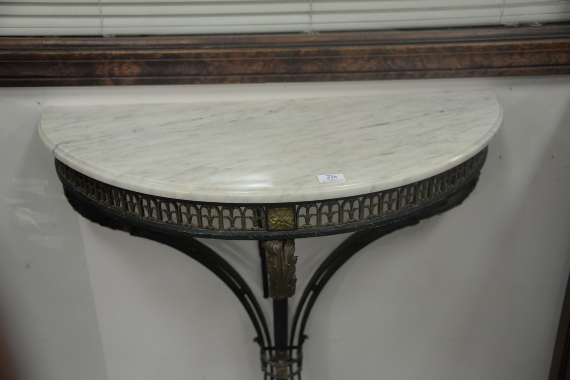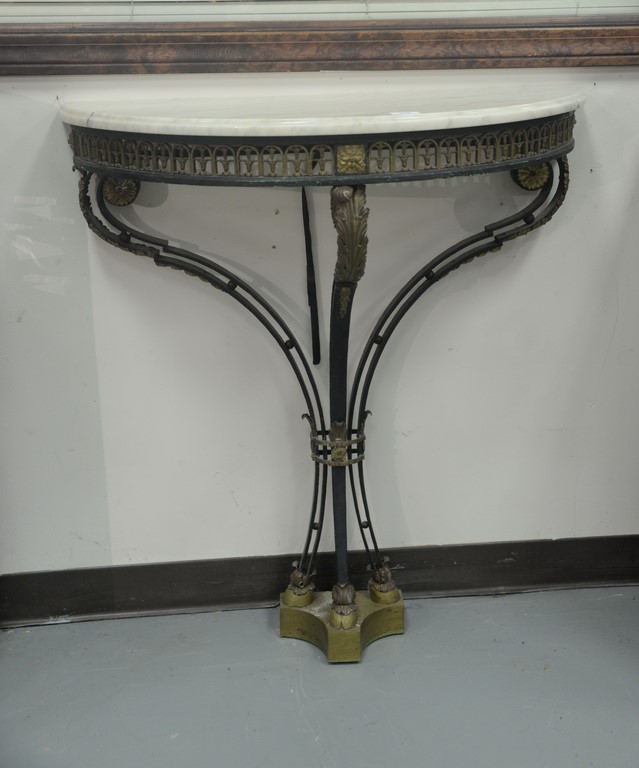 Lot 430: Iron demilune marble top console table with gilt bronze and brass mounts and hoof feet. ht. 38in., wd. 32in., dp. 14in.
