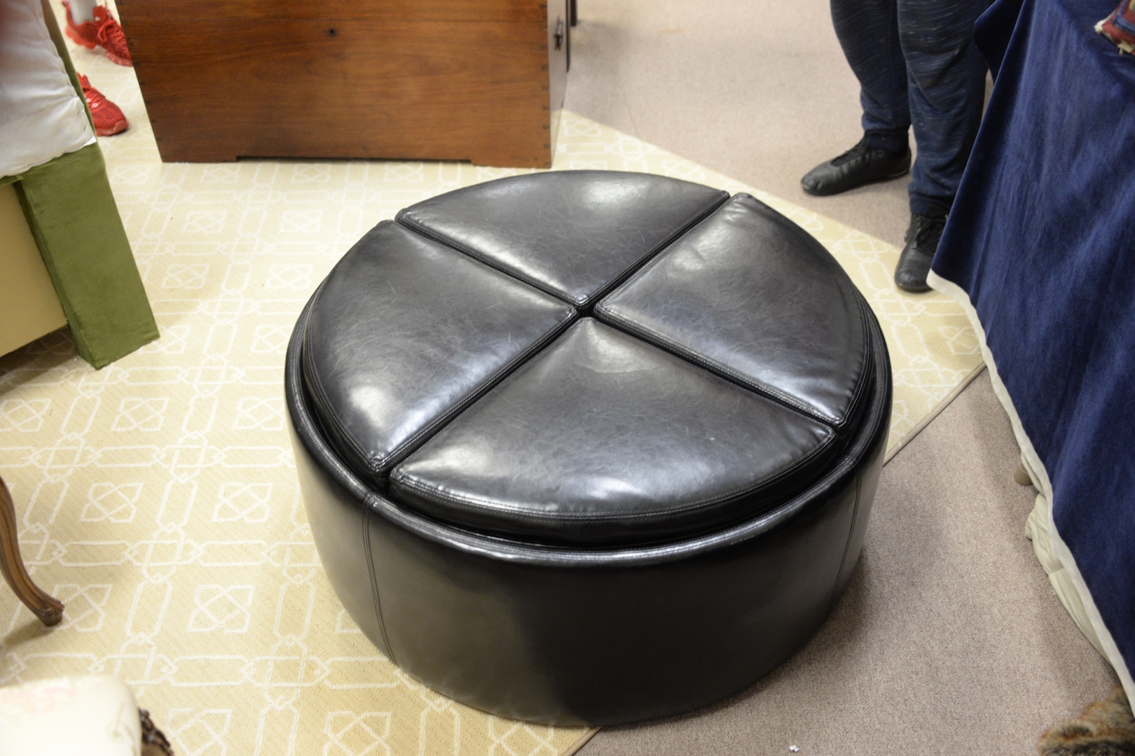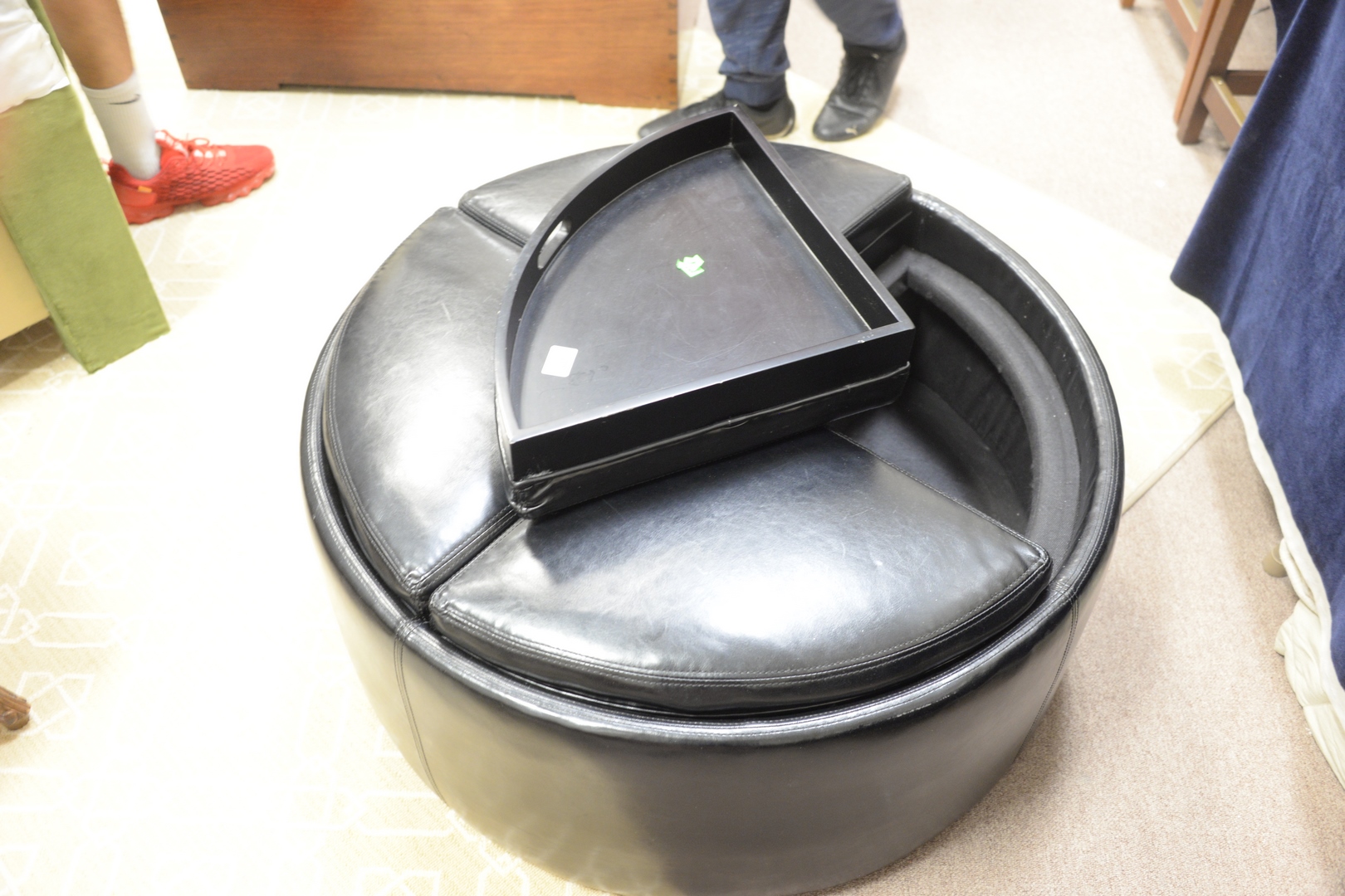 Leather Ottoman, having built in snack tray and storage in base, height 16 inches, diameter 3 inches.