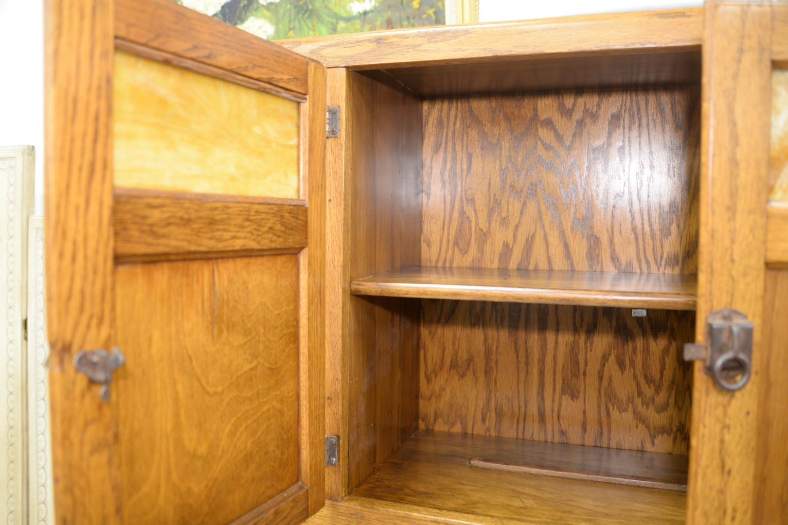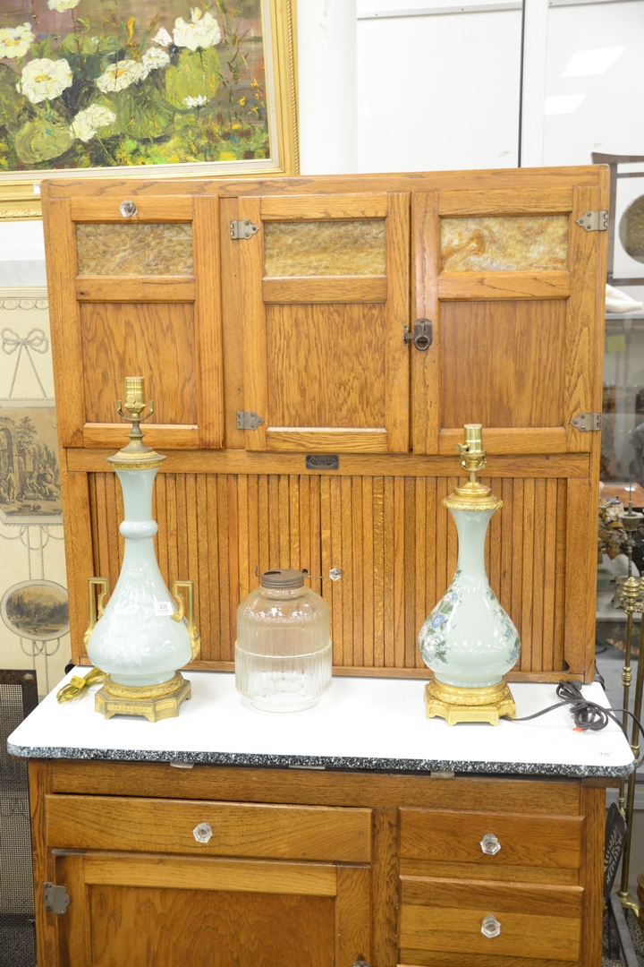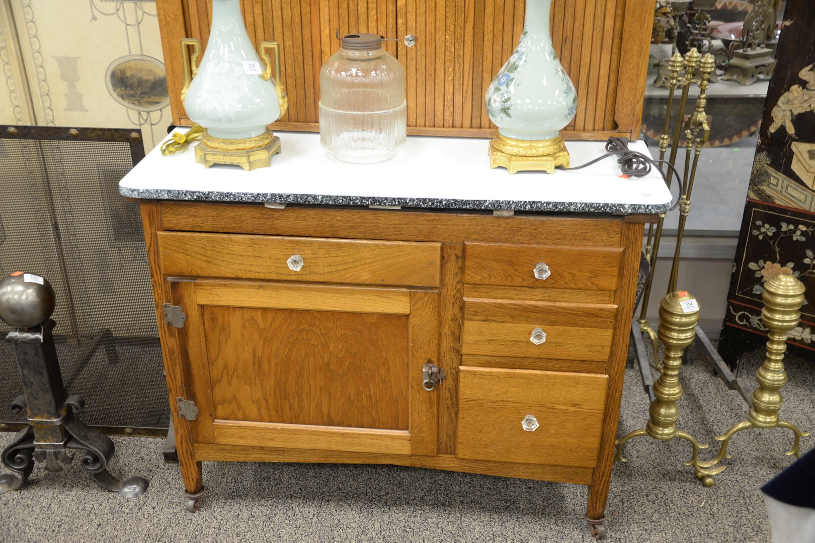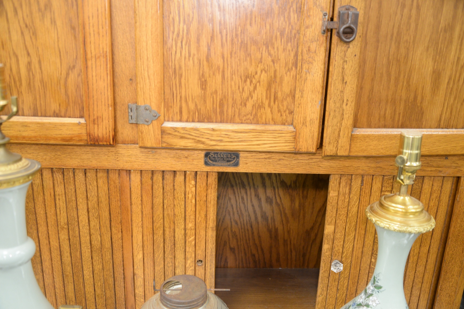 Lot 430: Oak Hoosier Cabinet by Sellers, having tambour doors, in two parts, height 70 inches, width 41 inches, depth 28 inches.
