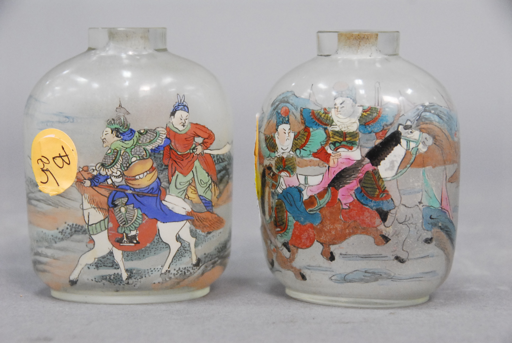 Two reverse painted snuff bottles, painted with scenes of warriors, no too, ht. 3 1/2 ea.