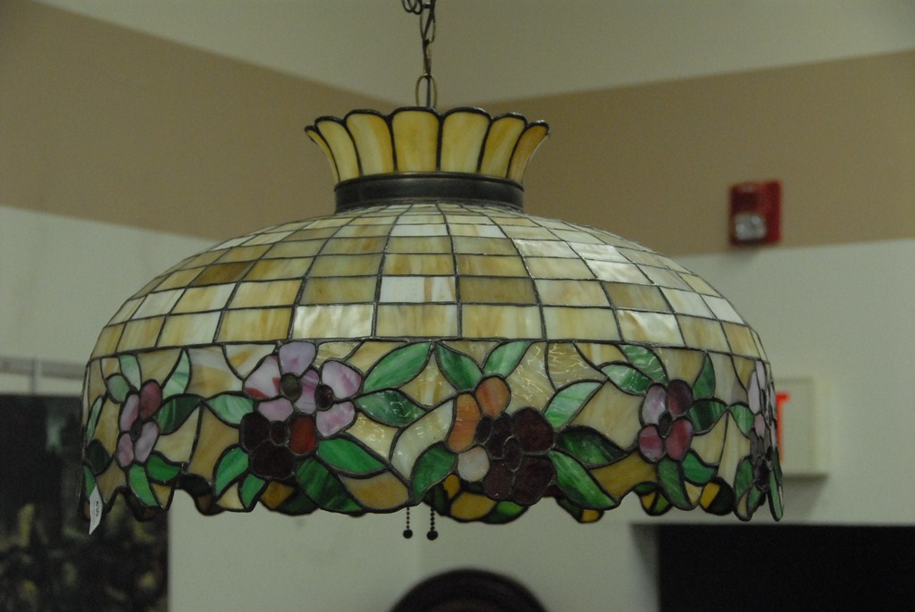 Victorian leaded hanging light, three sockets. dia. 24 3/4in.