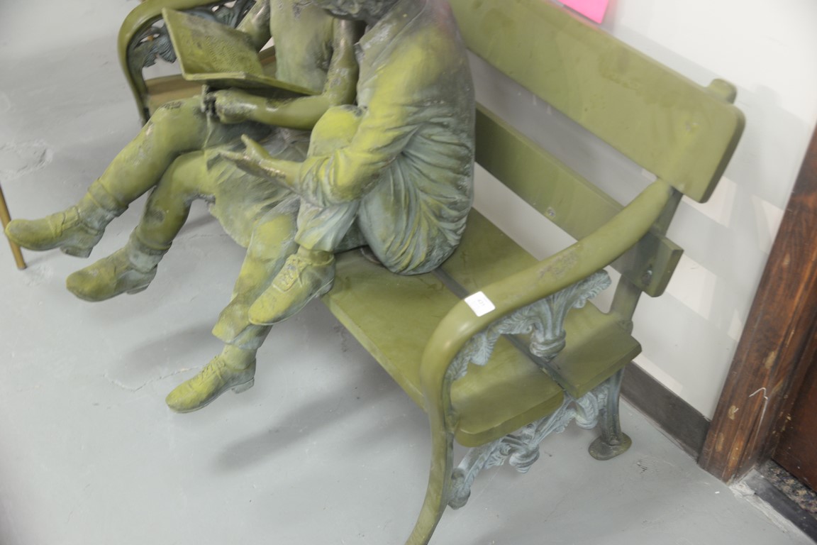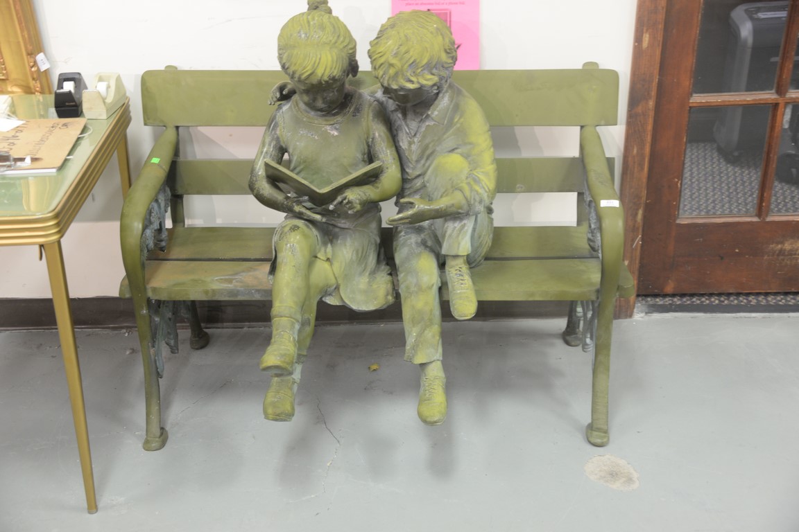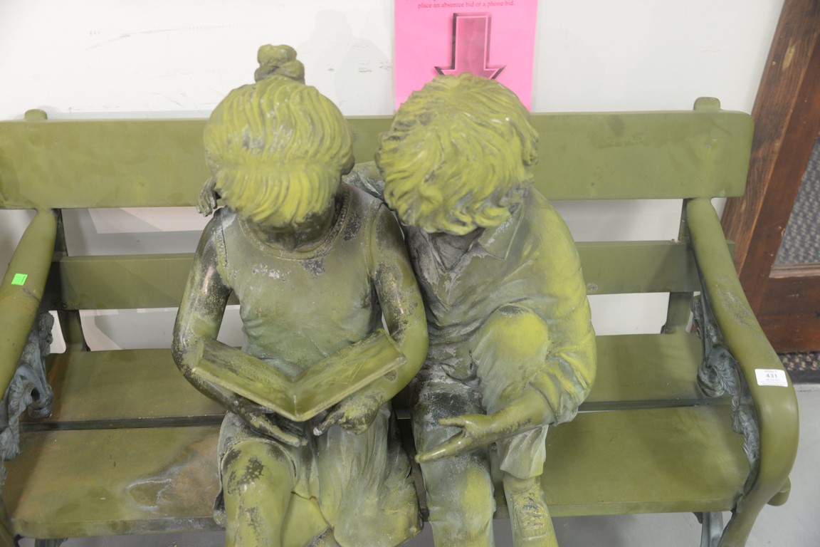 Lot 431: Bronze figural group with a young boy and girl on a park bench reading an alphabet book. ht. 38in., lg. 46in.