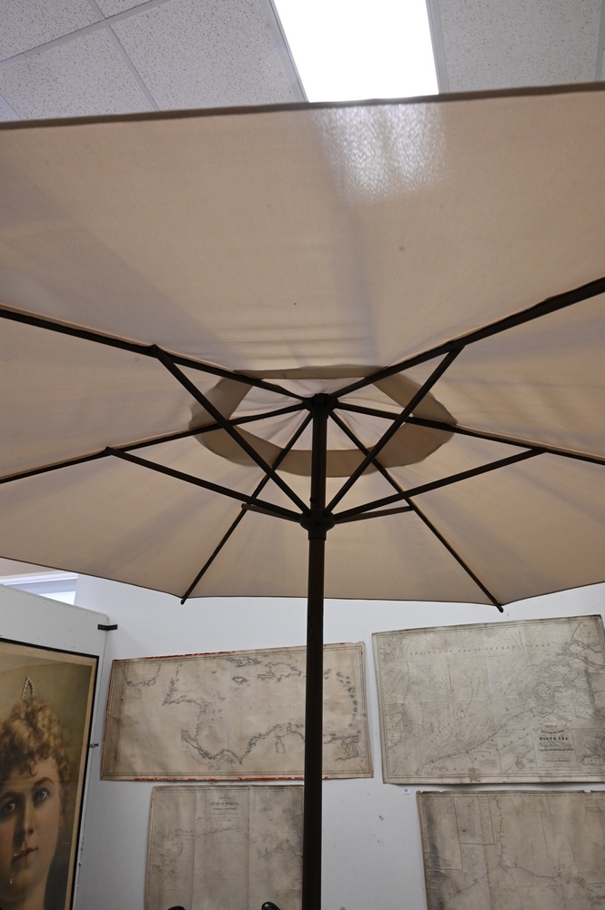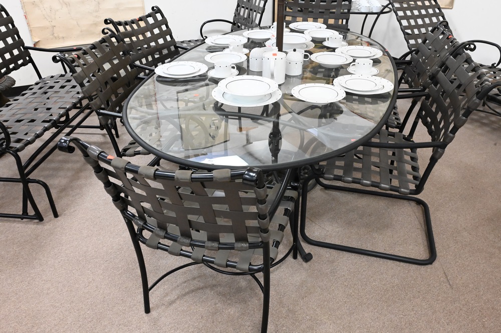 Lot 431: Brown & Jordan Eight Piece Outdoor Dining Set, to include oval glass top table, 6 armchairs, and an umbrella; top 49″ x 86″.