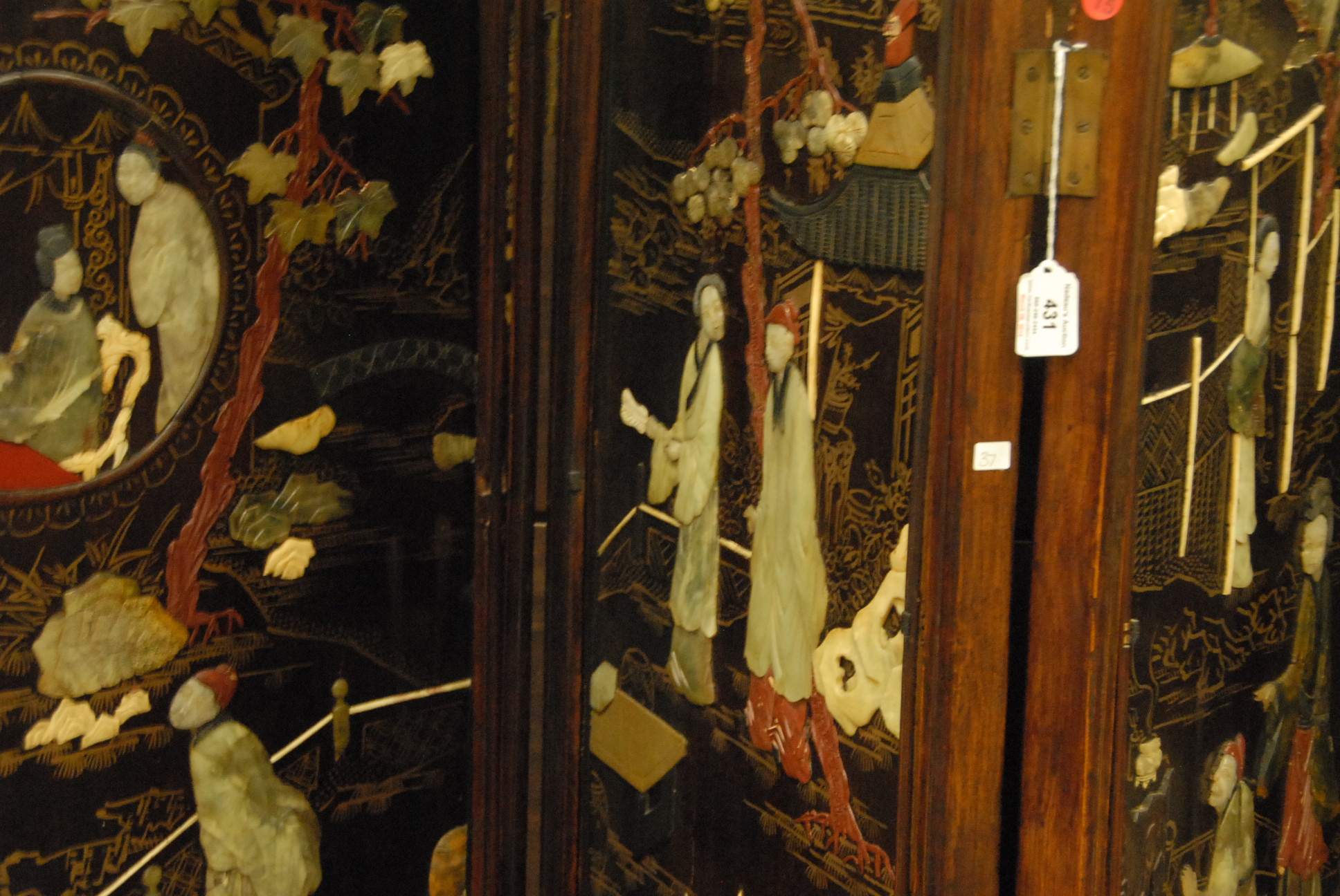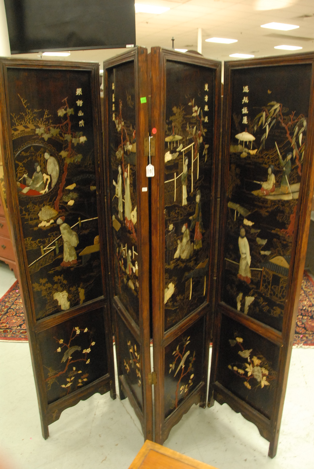 Lot 431: Four-panel standing screen, upper panels decorated with hardstone figures in landscapes and lower panels with bird and flower, accented with leaves and calligraphy back painted with foliage, China, 20th century. Each panel: wd. 18in. ht. 72in.