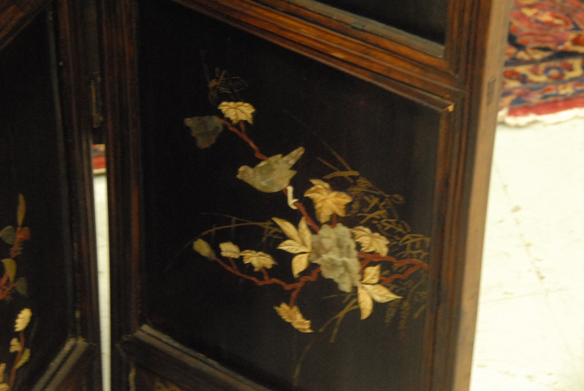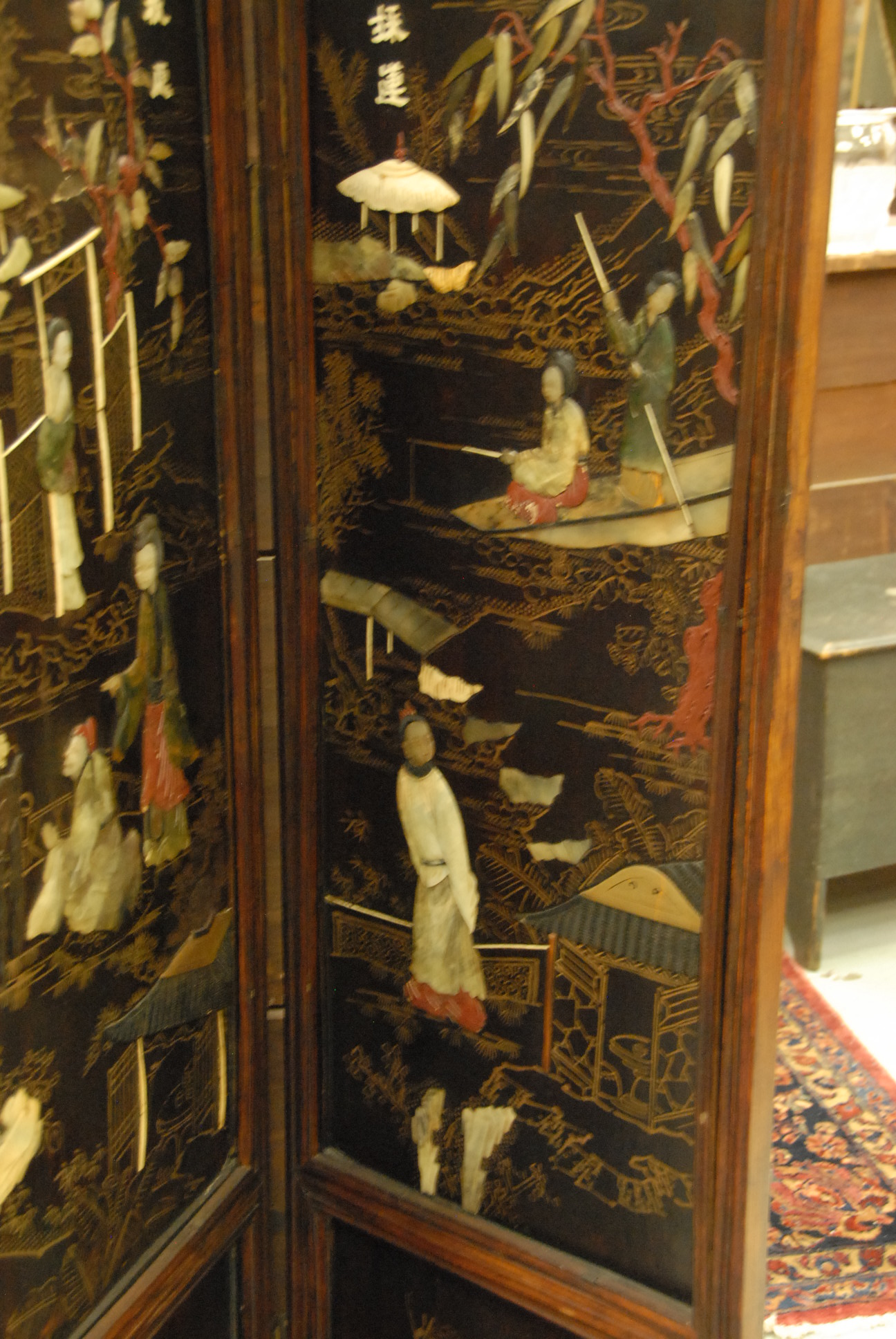 Four-panel standing screen, upper panels decorated with hardstone figures in landscapes and lower panels with bird and flower, accented with leaves and calligraphy back painted with foliage, China, 20th century. Each panel: wd. 18in. ht. 72in.