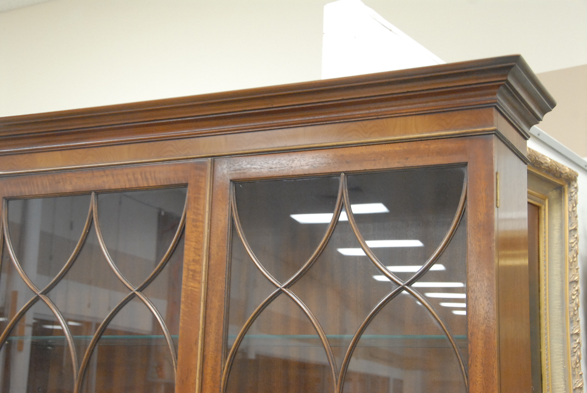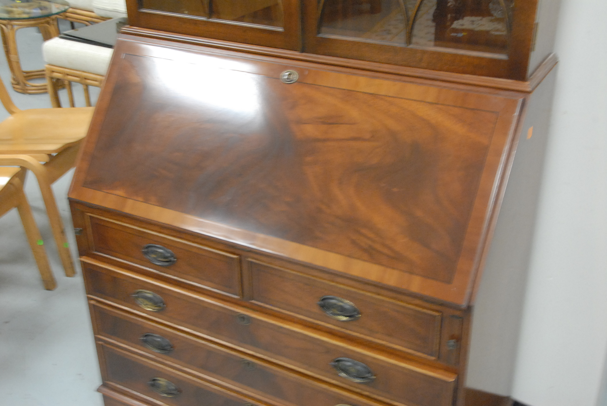 Lot 431: Mahogany inlaid secretary desk with drop front and leather writing surface, marked made in England by Bevan Funnell