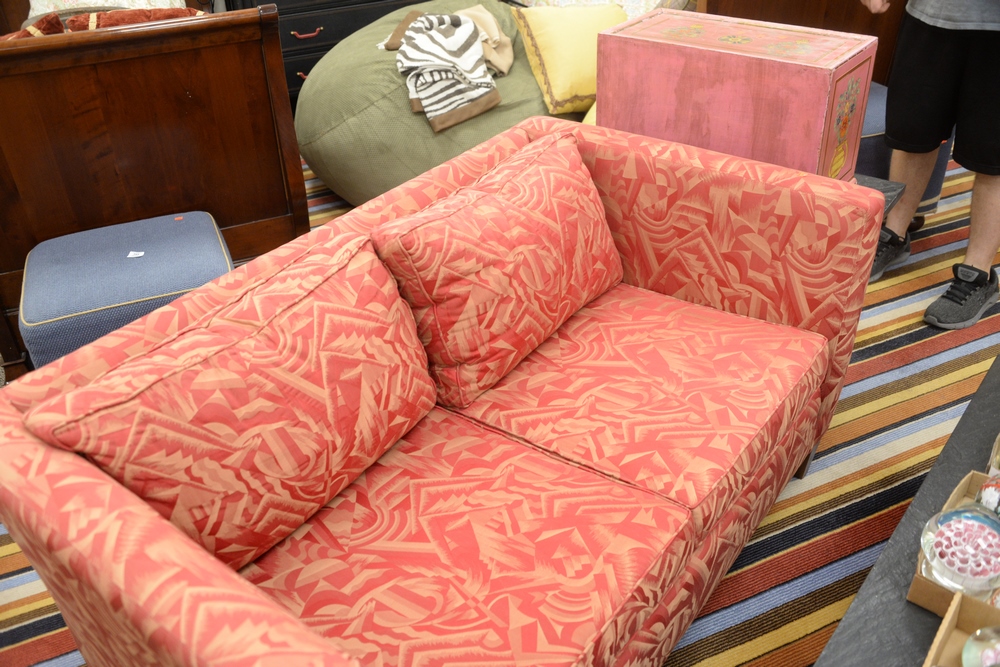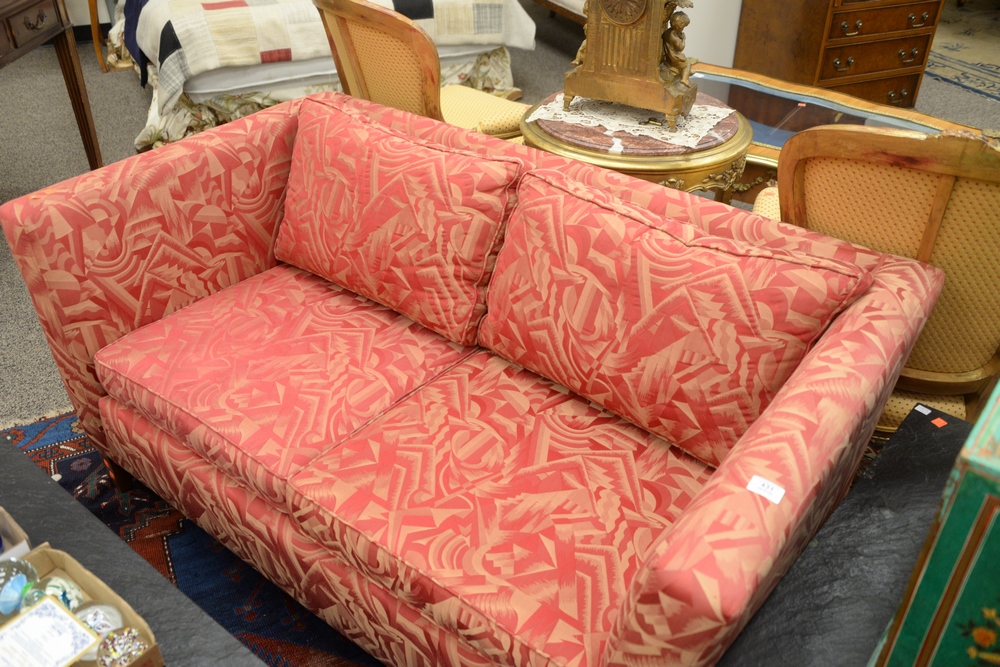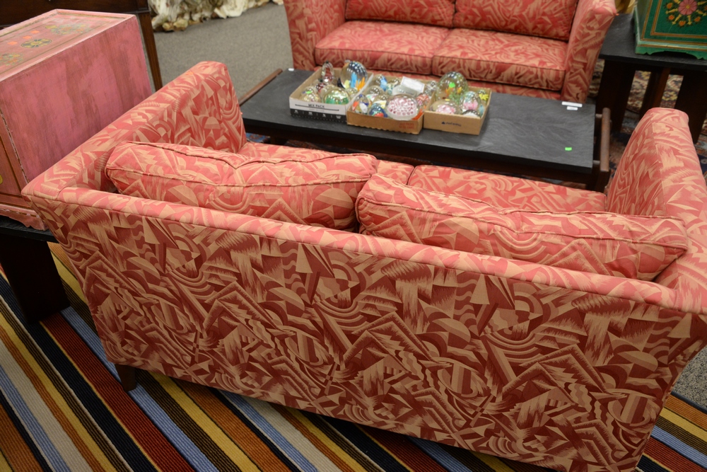 Lot 431: Pair of Ehrlich’s Loveseats, in matching Brunschwig and Fils red upholstery, height 28 inches, length 57 1/2 inches, depth 34 inches.