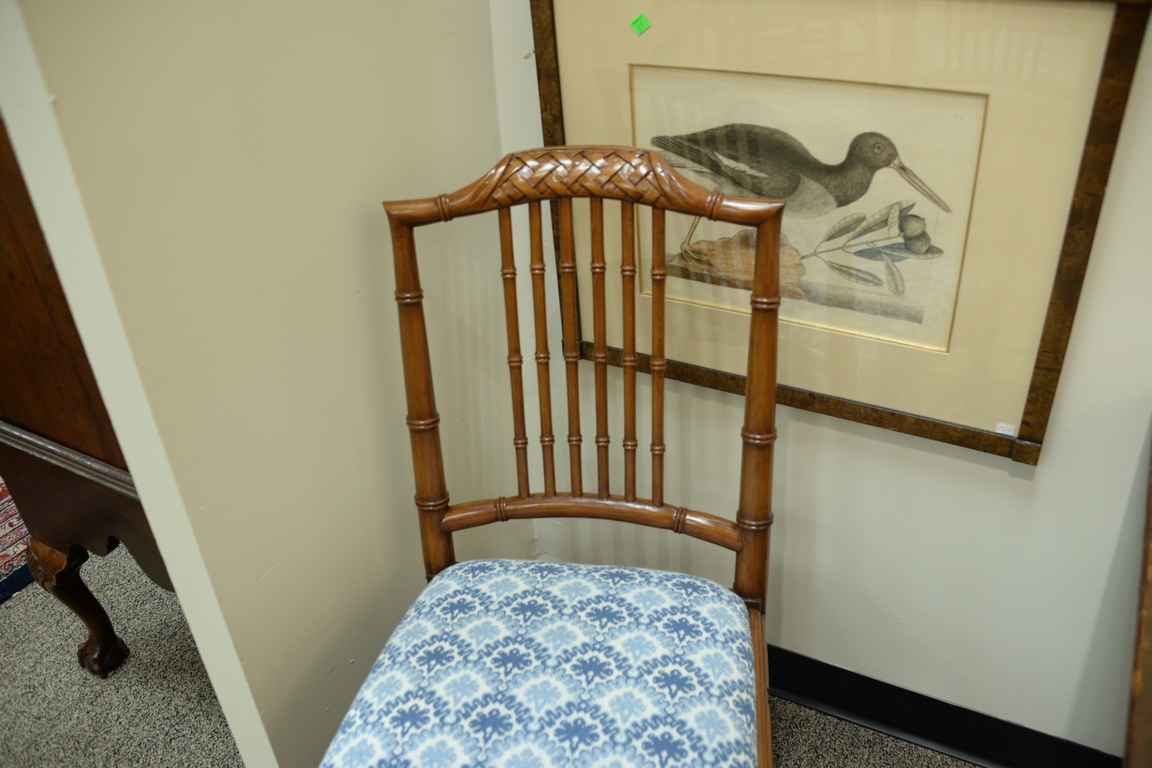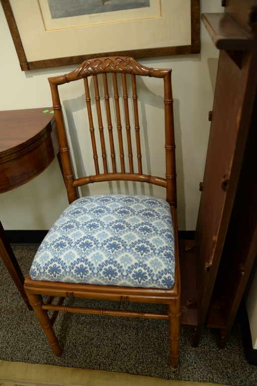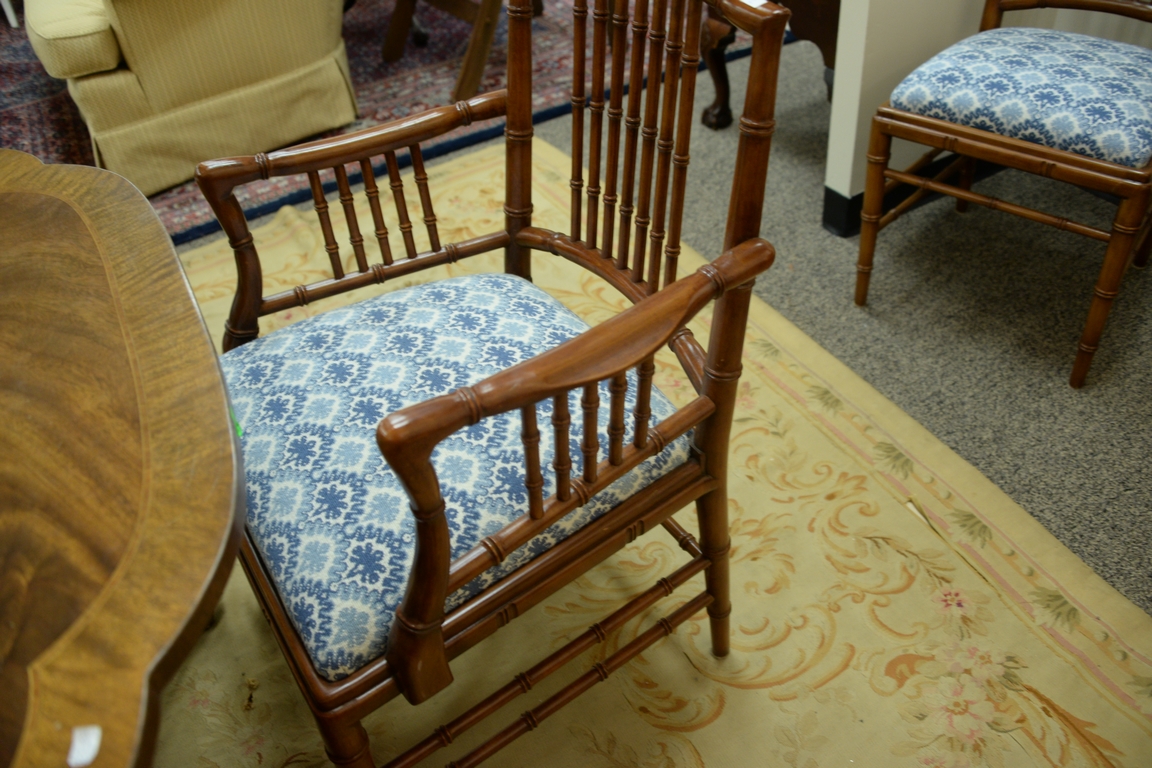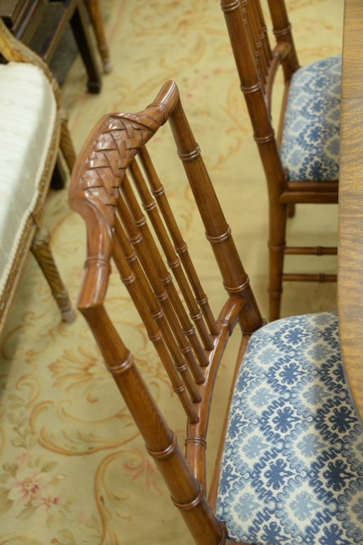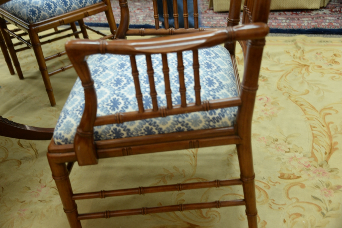 Set of eight faux bamboo dining chairs, each with lattice top rail, bamboo style turnings and blue and white upholstered slip seats on faux bamboo turned legs one arm and seven side ht. 36in.