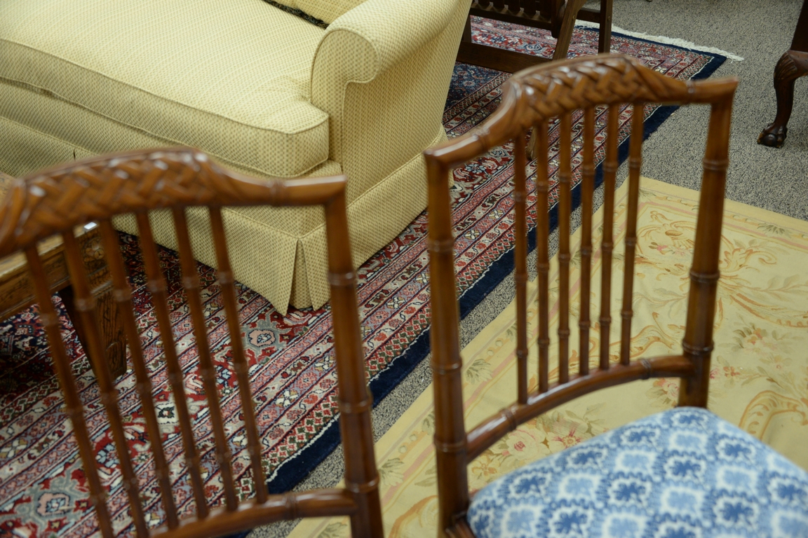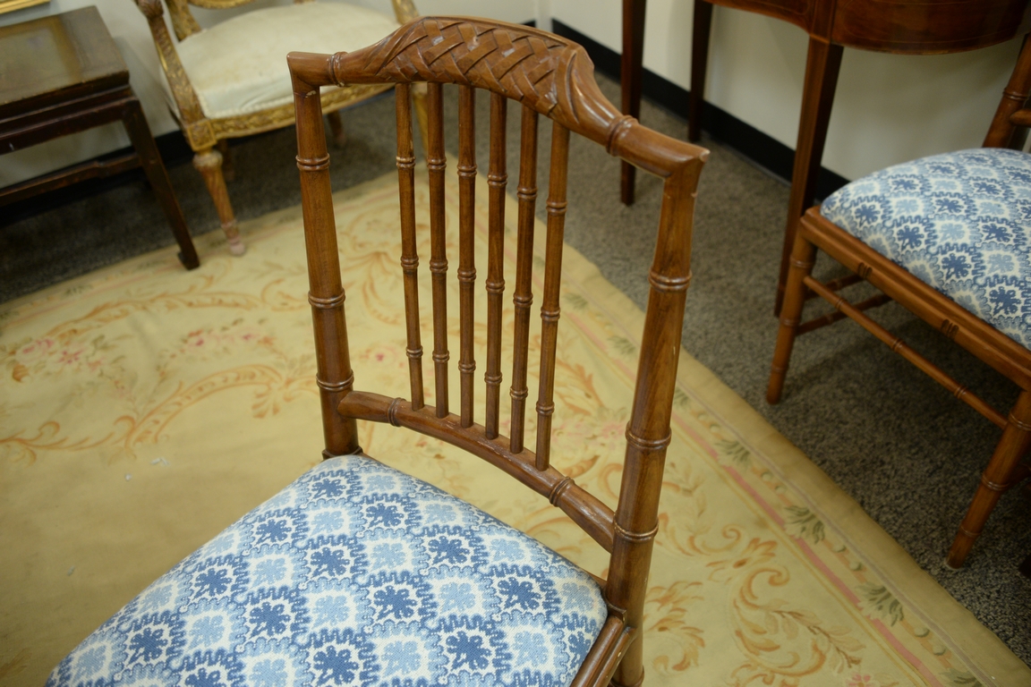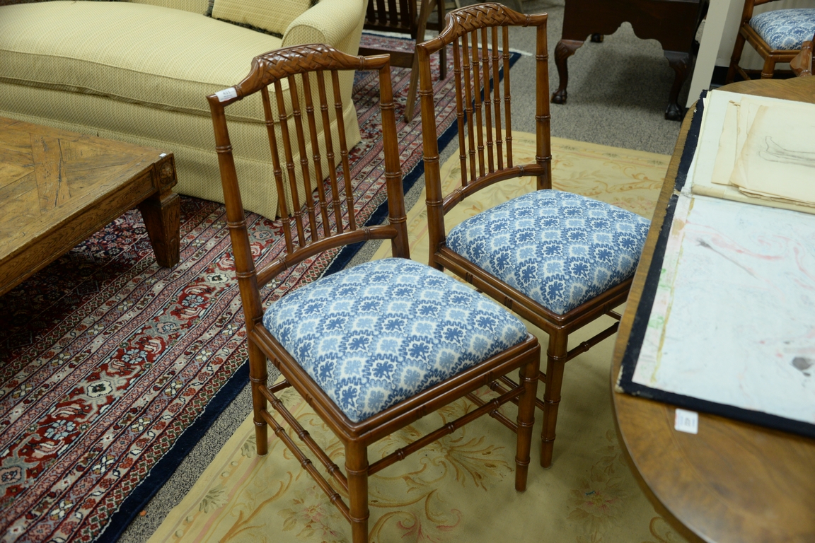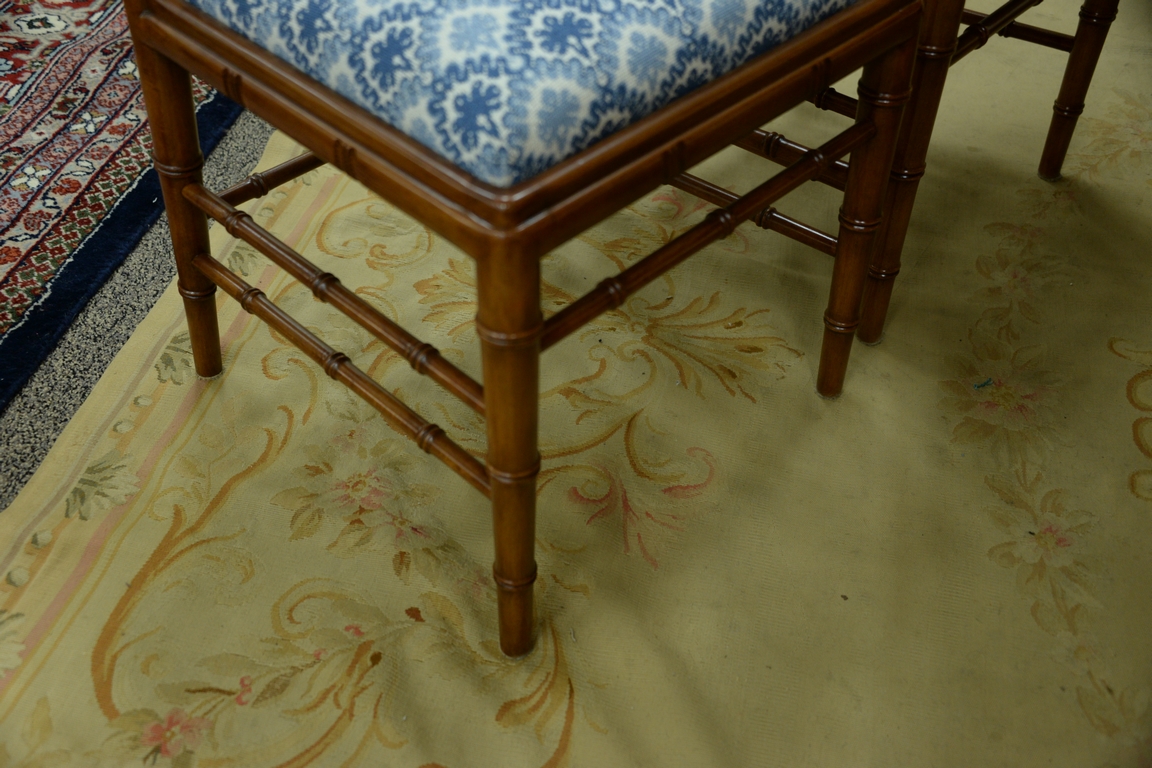 Lot 431: Set of eight faux bamboo dining chairs, each with lattice top rail, bamboo style turnings and blue and white upholstered slip seats …