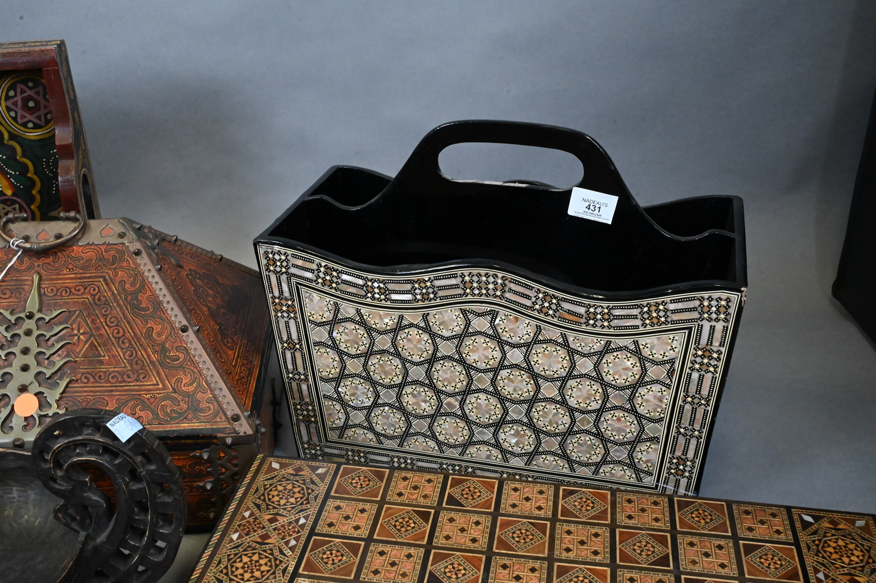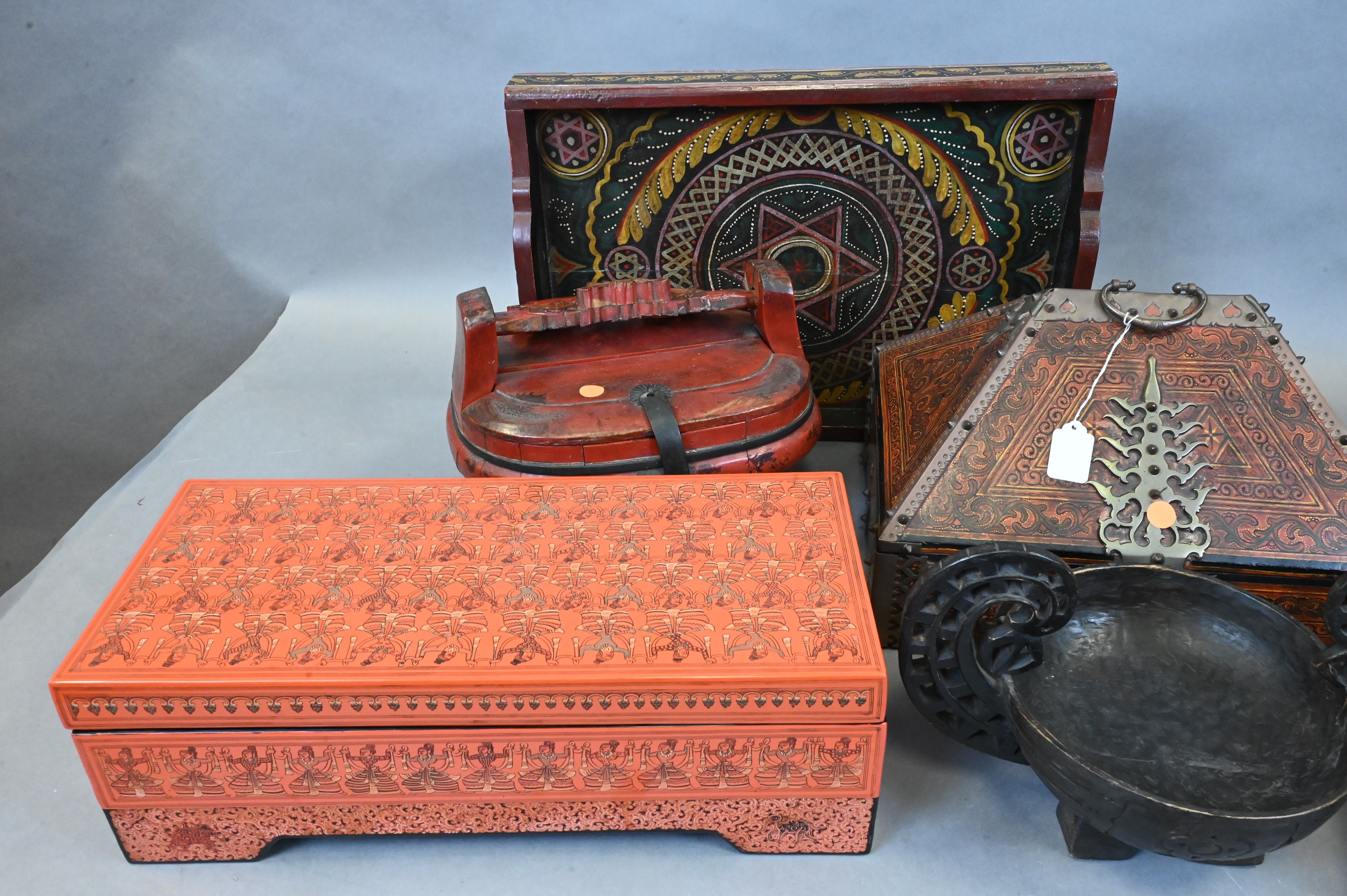 to include lacquered orange box with trays, mother of pearl inlaid magazine rack, Moroccan inlaid lift top games box (no game pieces), 19th red Chinese wedding basket, hand painted tray, Indian dowry box, carved bowl