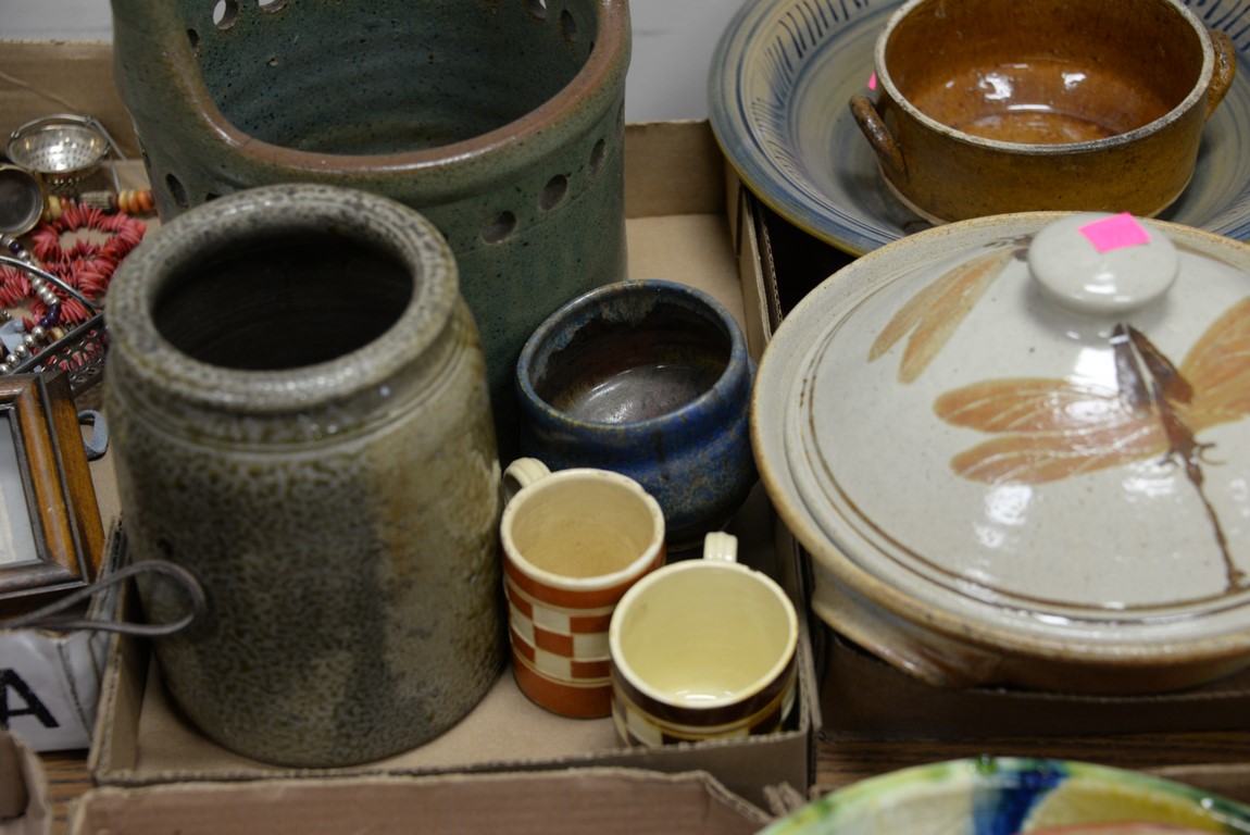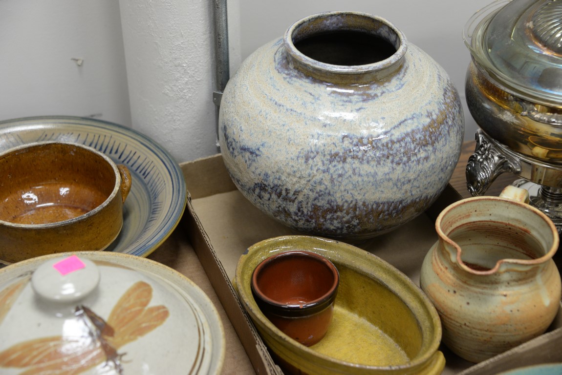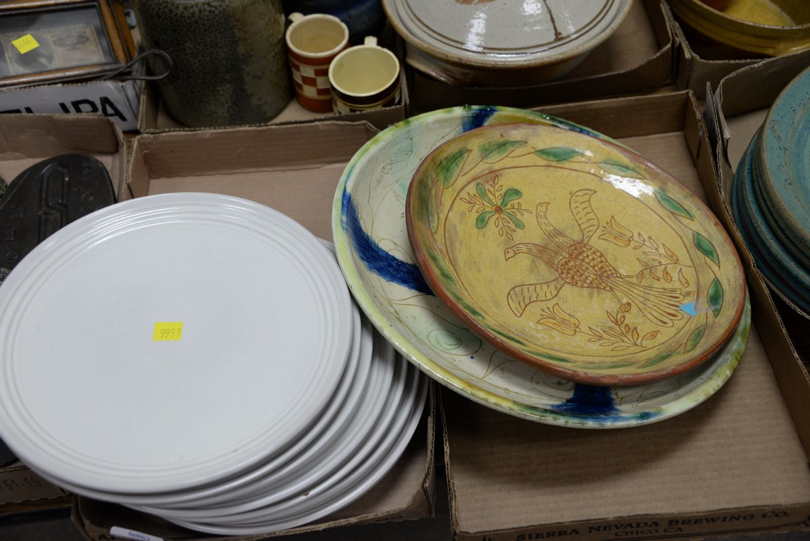 Lot 431: Six box lots of glazed stoneware Majolica items including set of six large Carla Ward blue glazed plates, redware plates, stoneware …