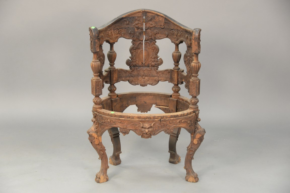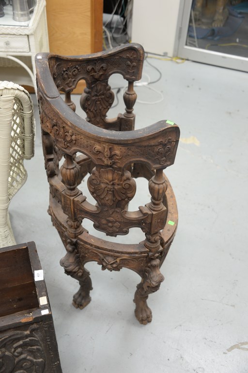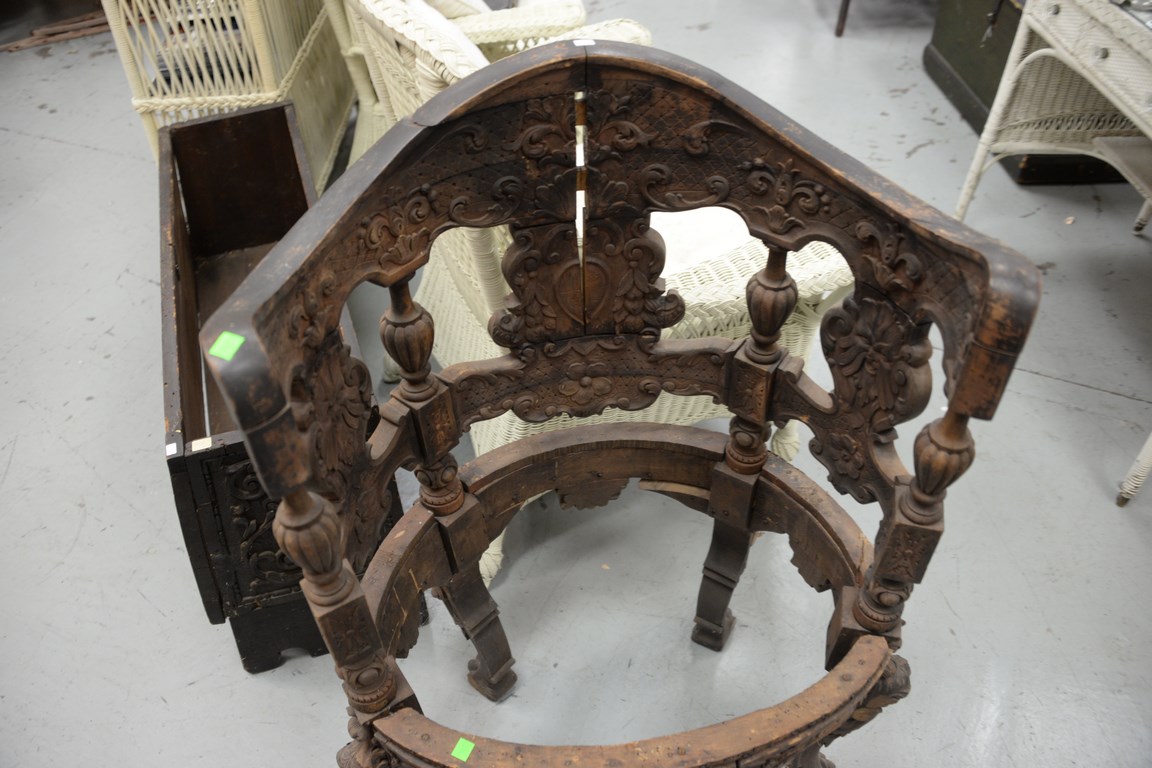 Two piece lot to include Continental carved chest, some parts are 17th-18th century no top restored as is and a carved Oriental style chair.
