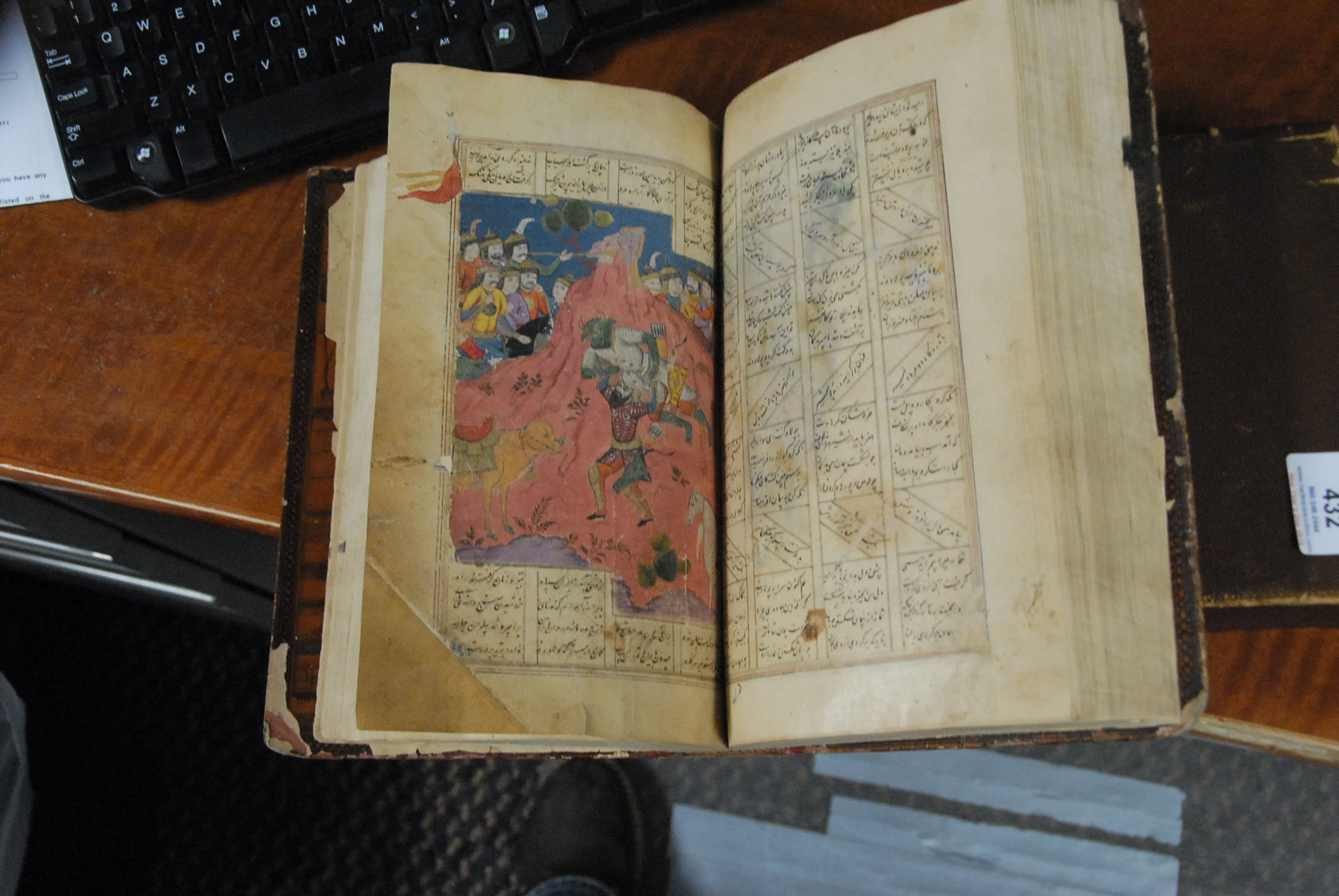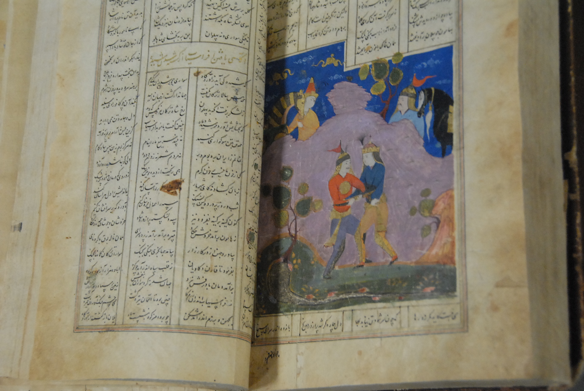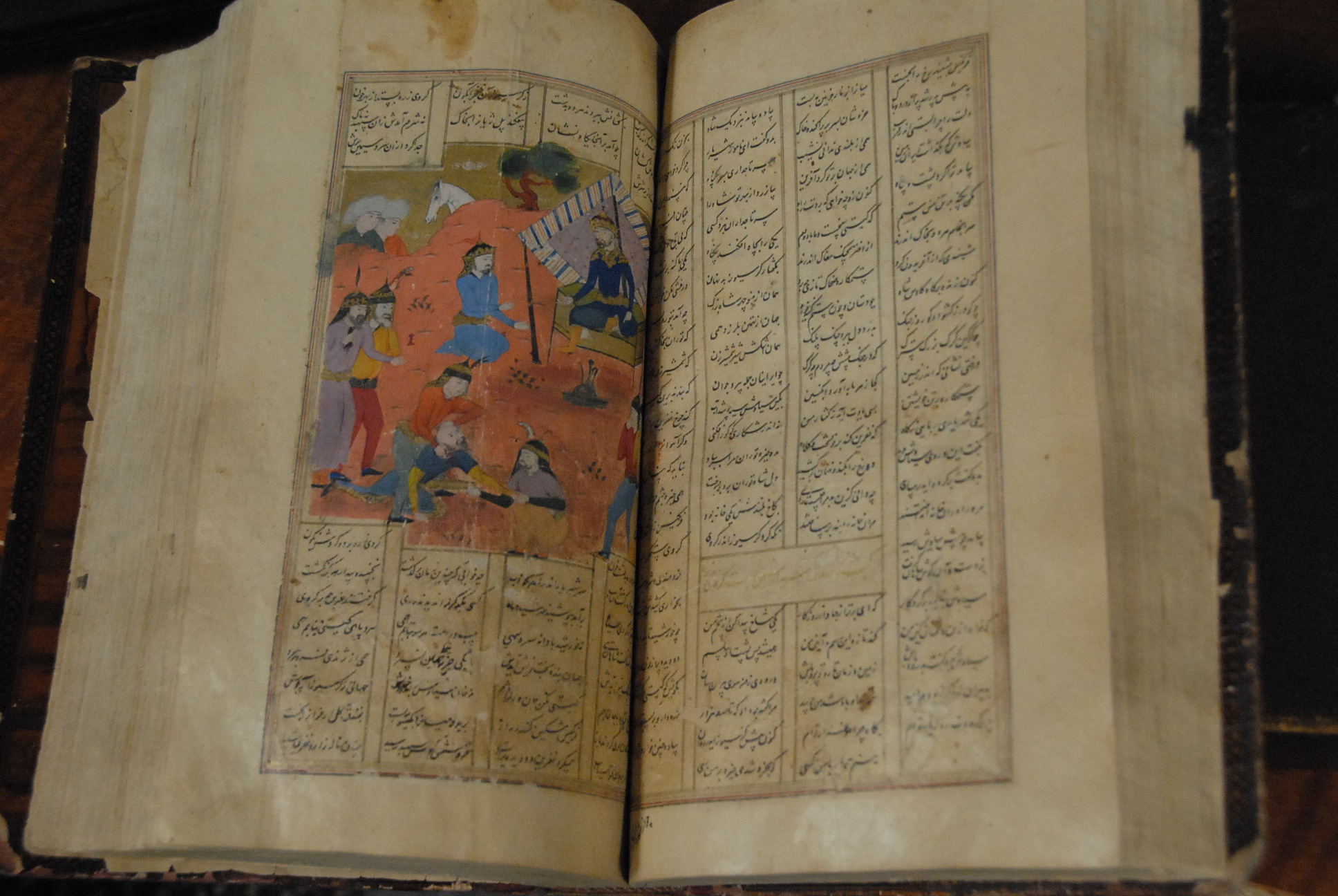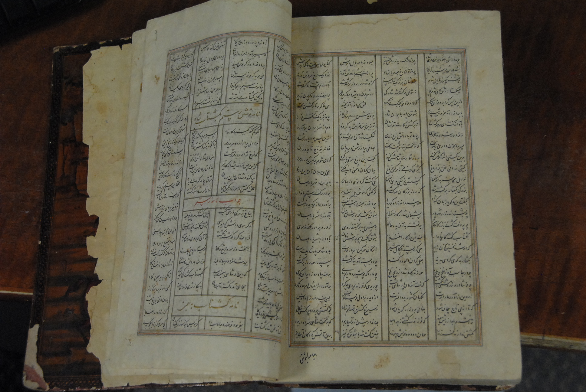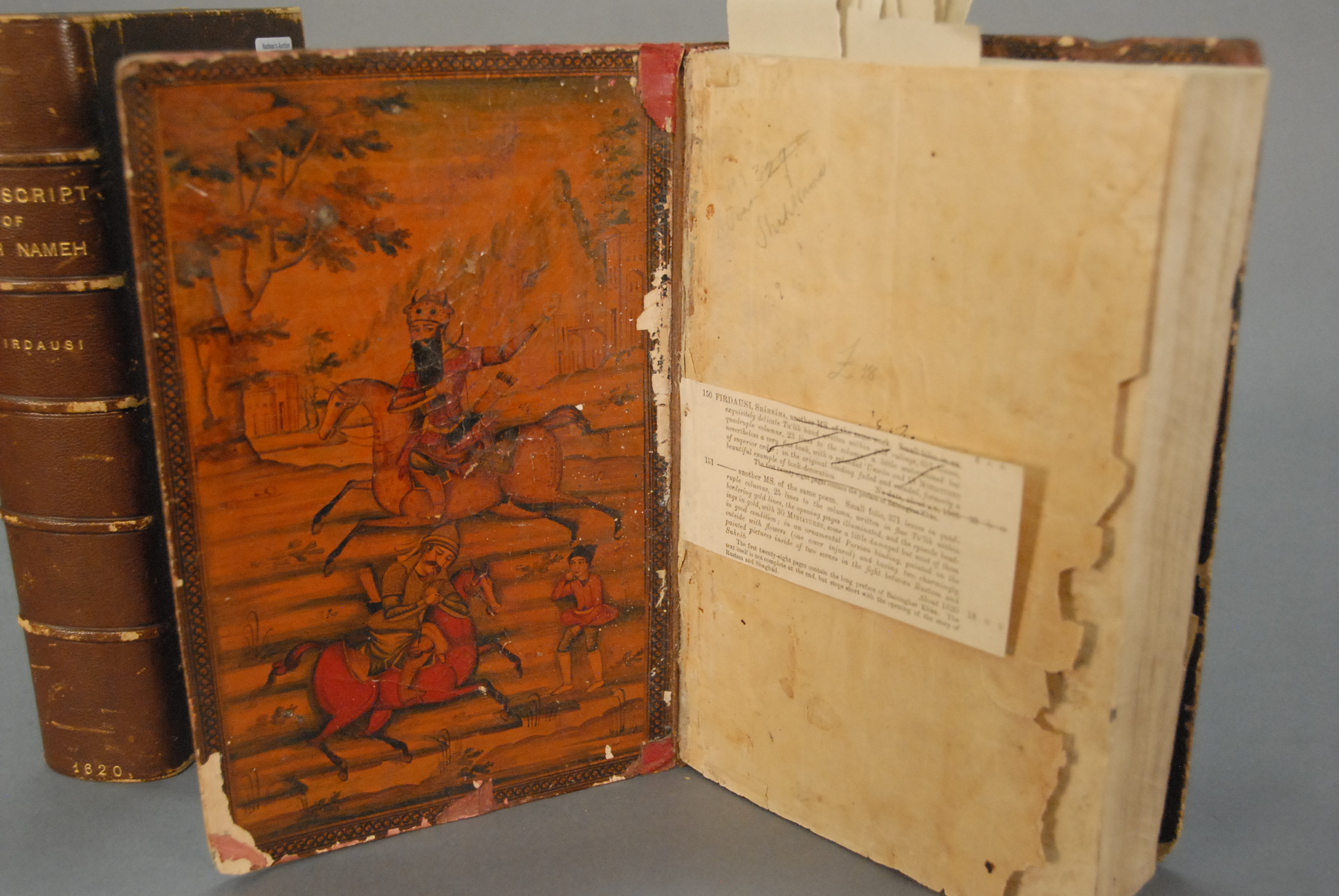 ABU AL-QASIM FIRDAWSI D. 1025AD: SHAHMAMA SAFAVID IRAN 17th Century. Twenty-Five lines of black nasta’liq script written in four columns, margins in blue, red, black and gold, 32 painted miniatures, headings in red. Front cover with imperfections, back cover in need of restoration, now in fitted leather box. From the library of Theodore Weicker. 11 x 7 Shah Nameh Firdausi