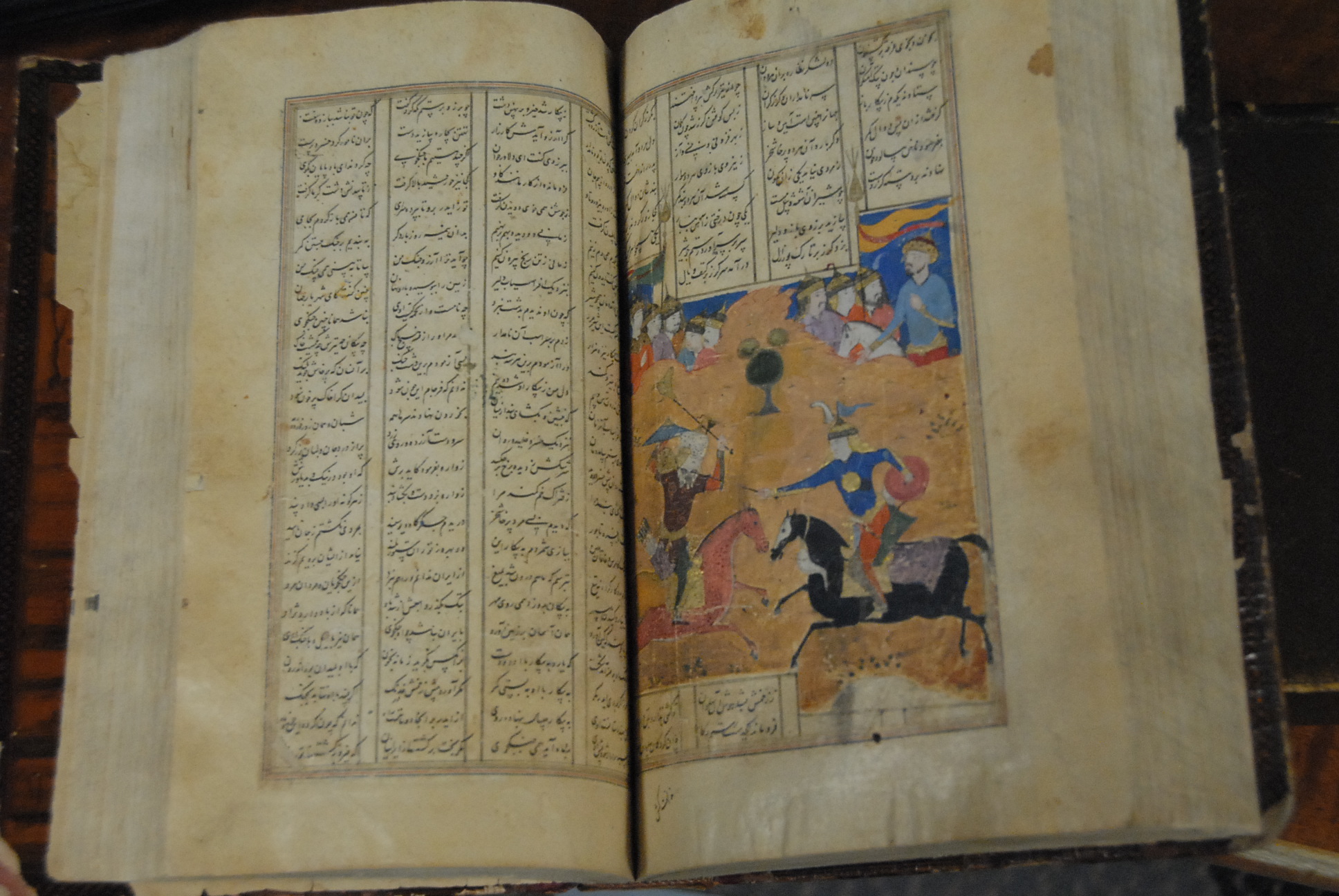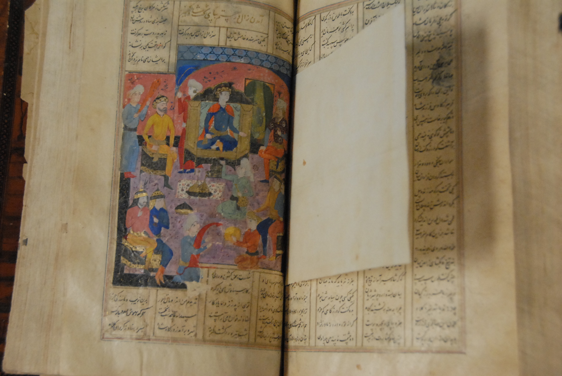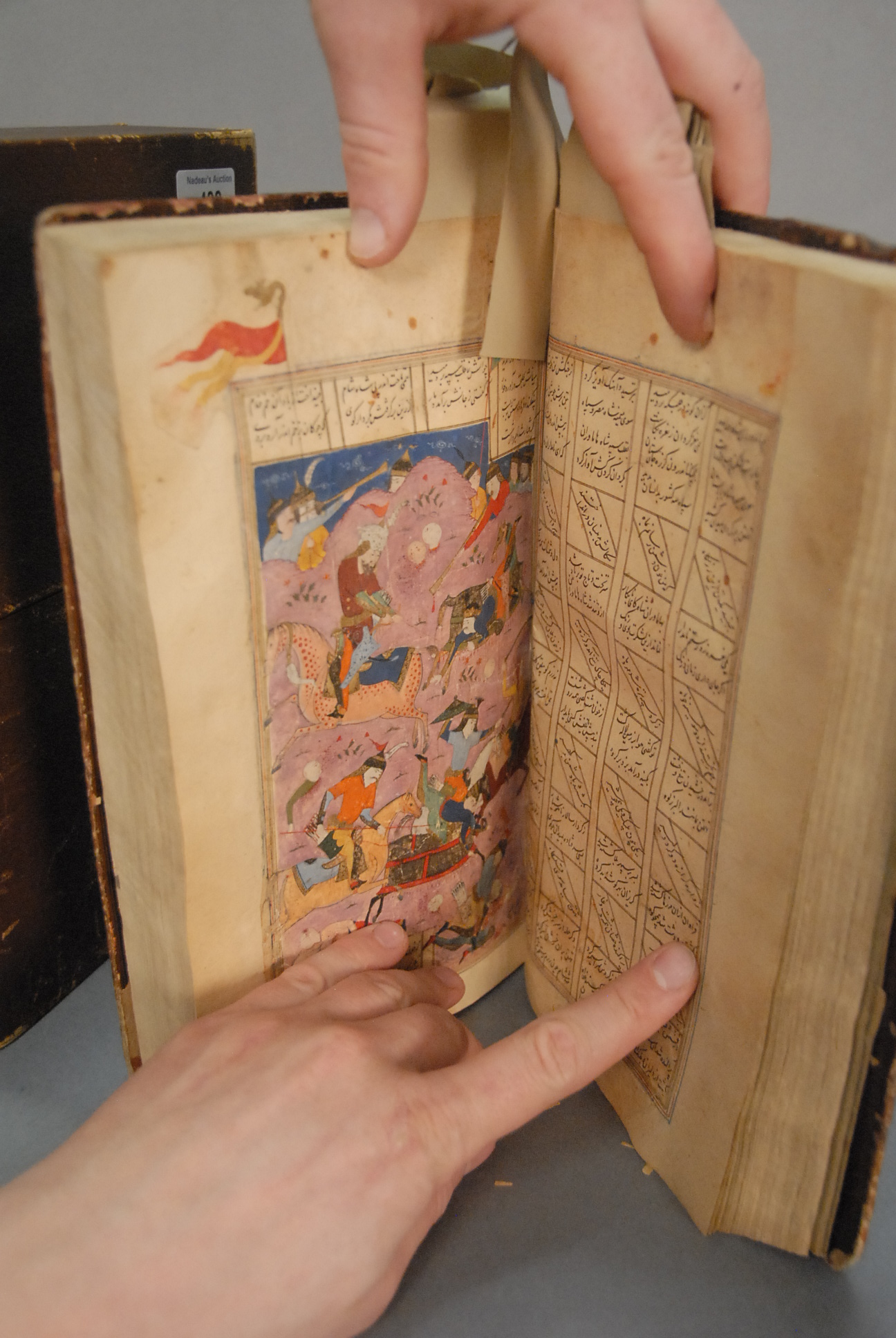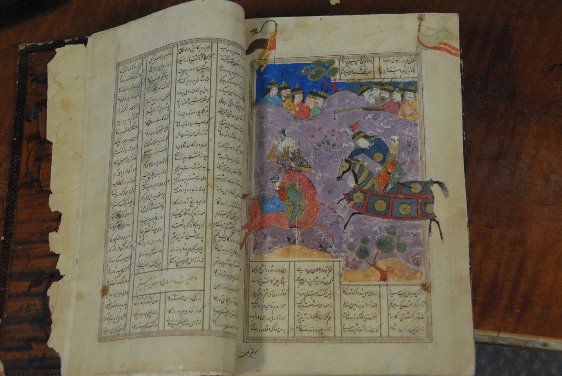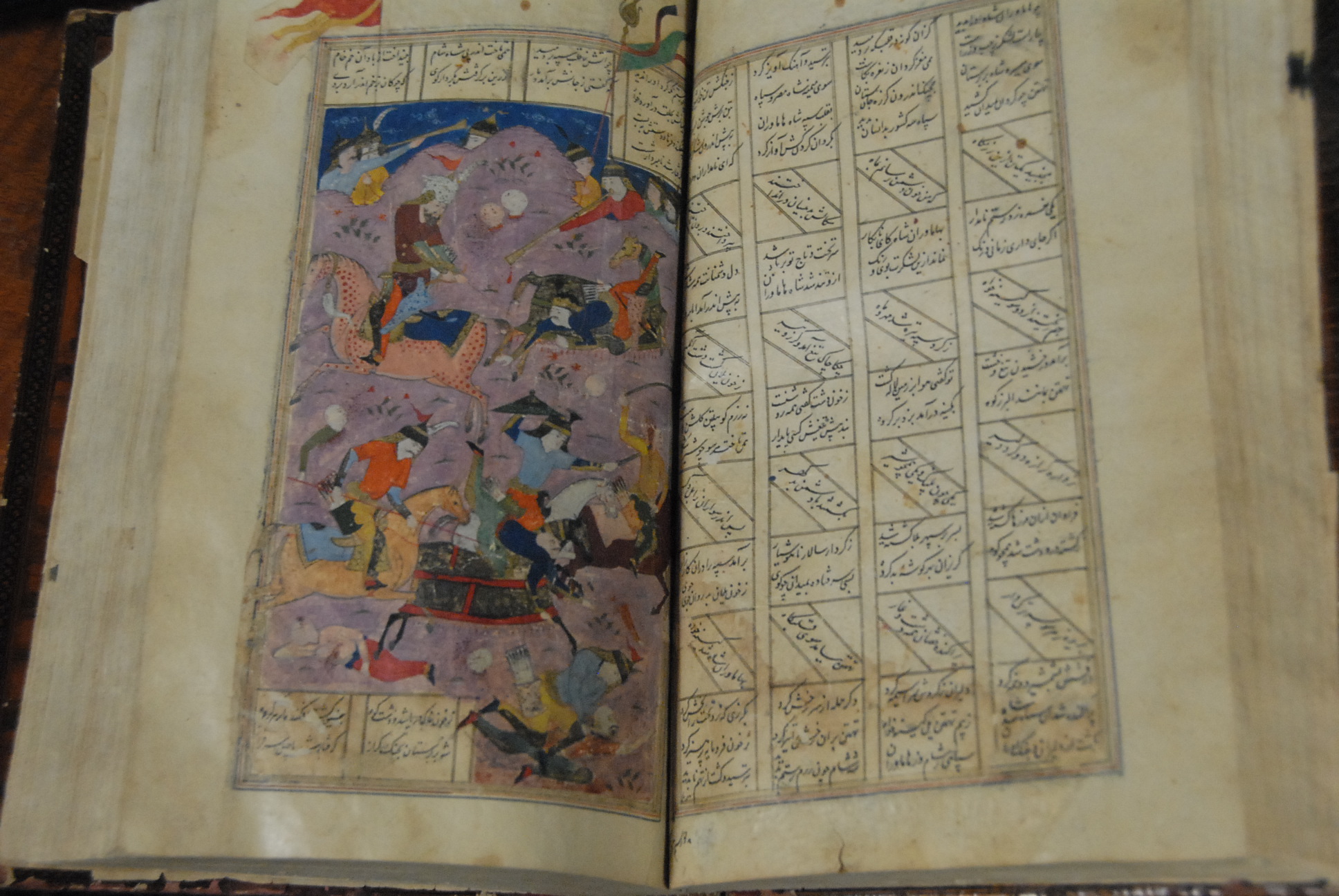 ABU AL-QASIM FIRDAWSI D. 1025AD: SHAHMAMA SAFAVID IRAN 17th Century. Twenty-Five lines of black nasta’liq script written in four columns, margins in blue, red, black and gold, 32 painted miniatures, headings in red. Front cover with imperfections, back cover in need of restoration, now in fitted leather box. From the library of Theodore Weicker. 11 x 7 Shah Nameh Firdausi