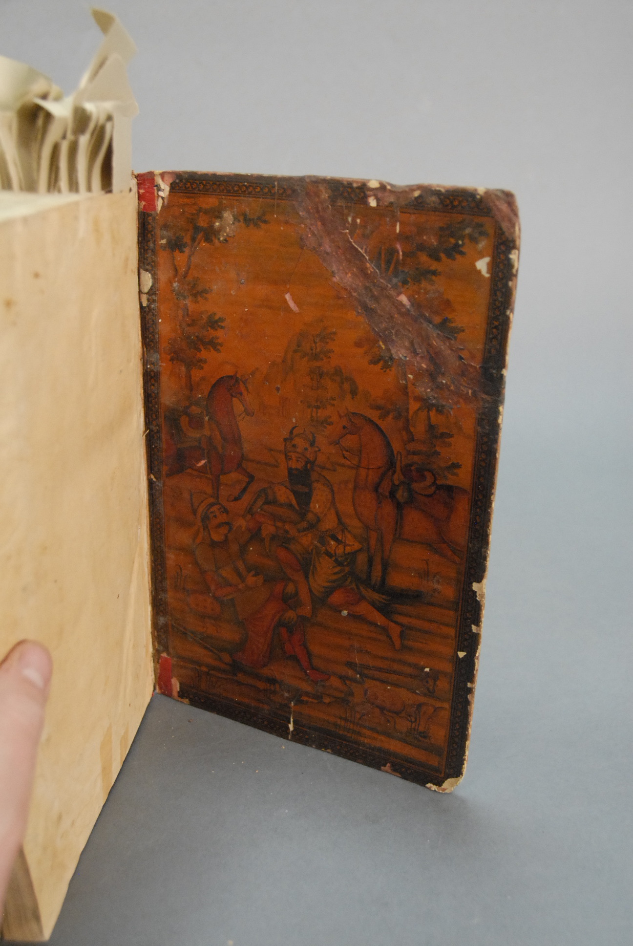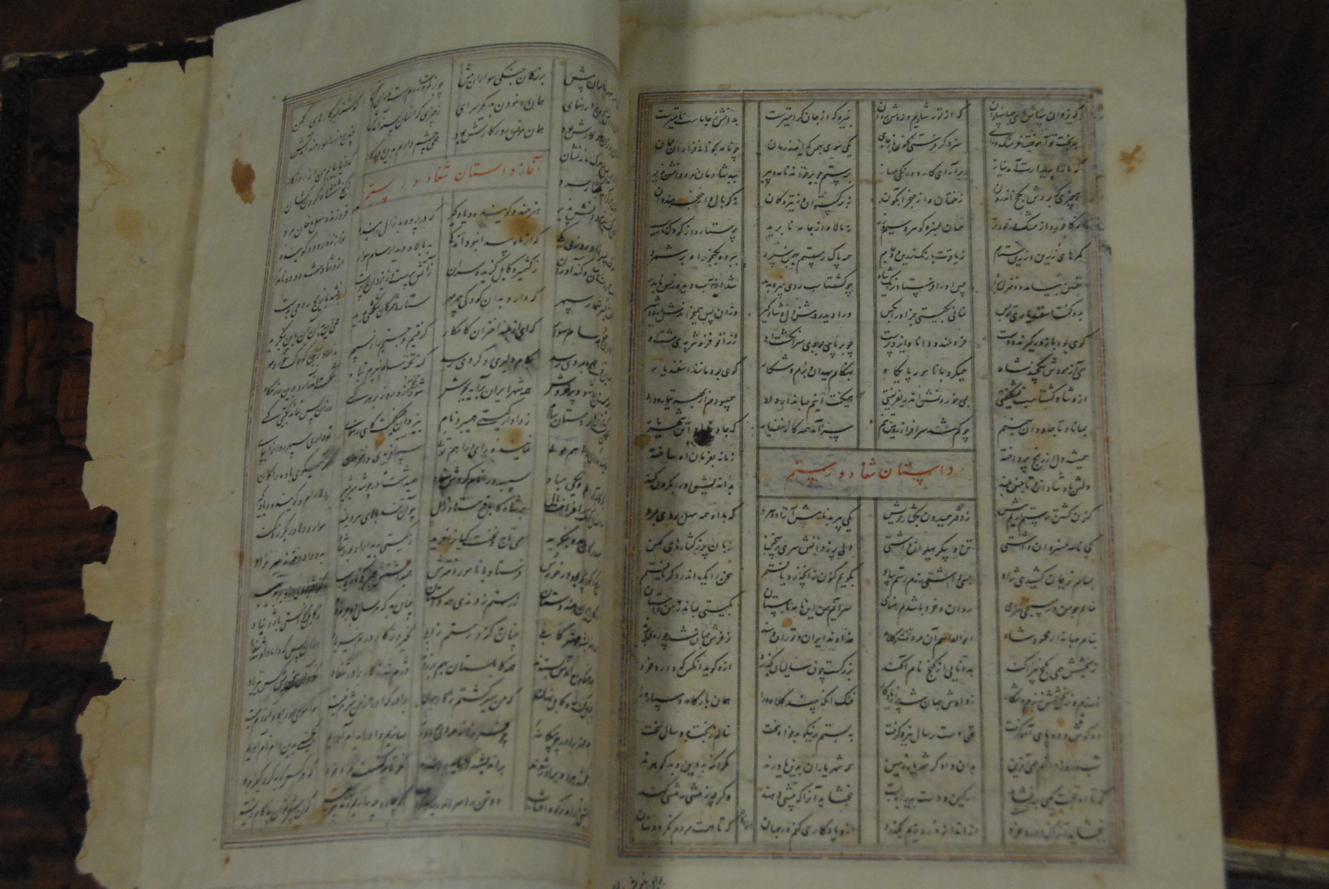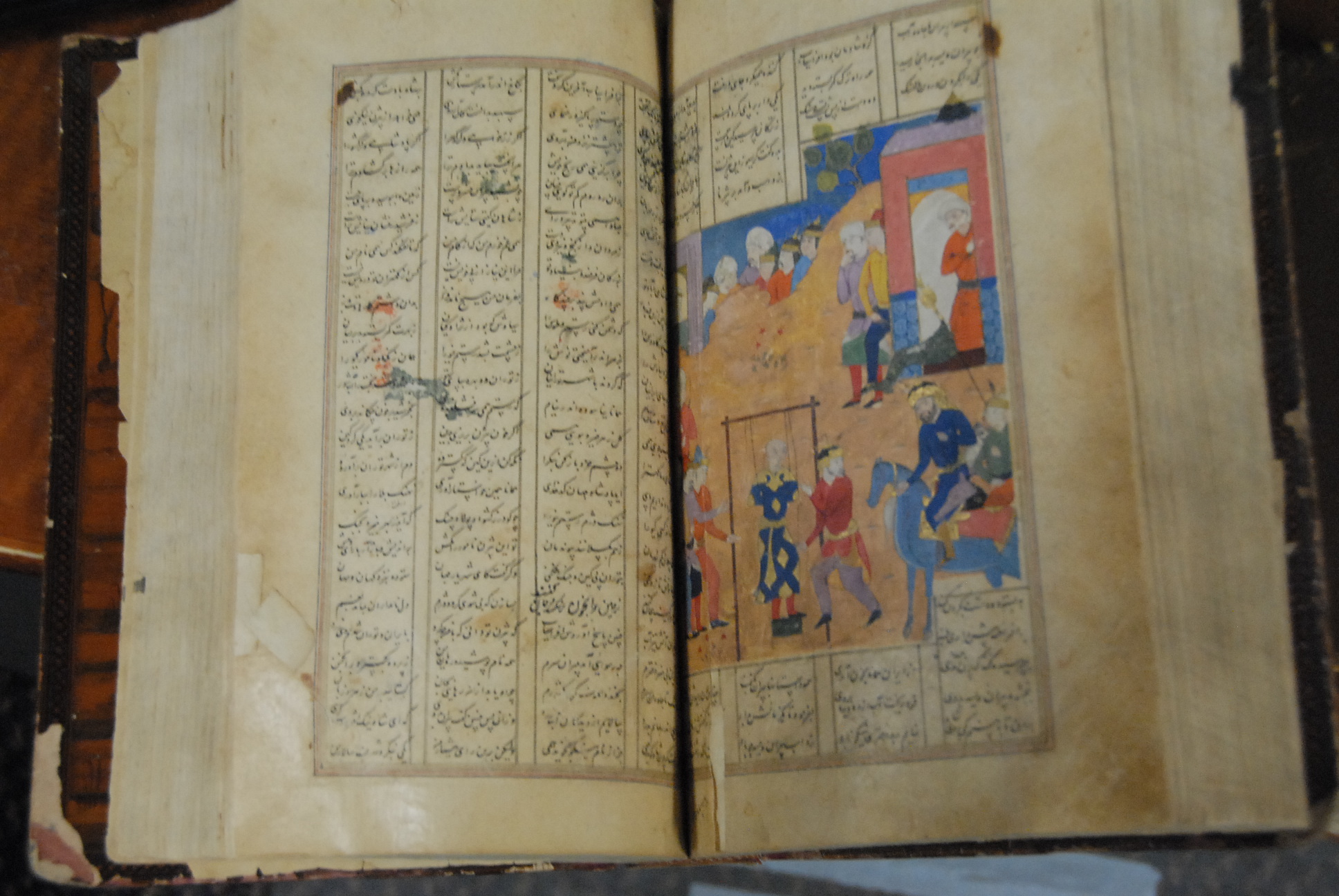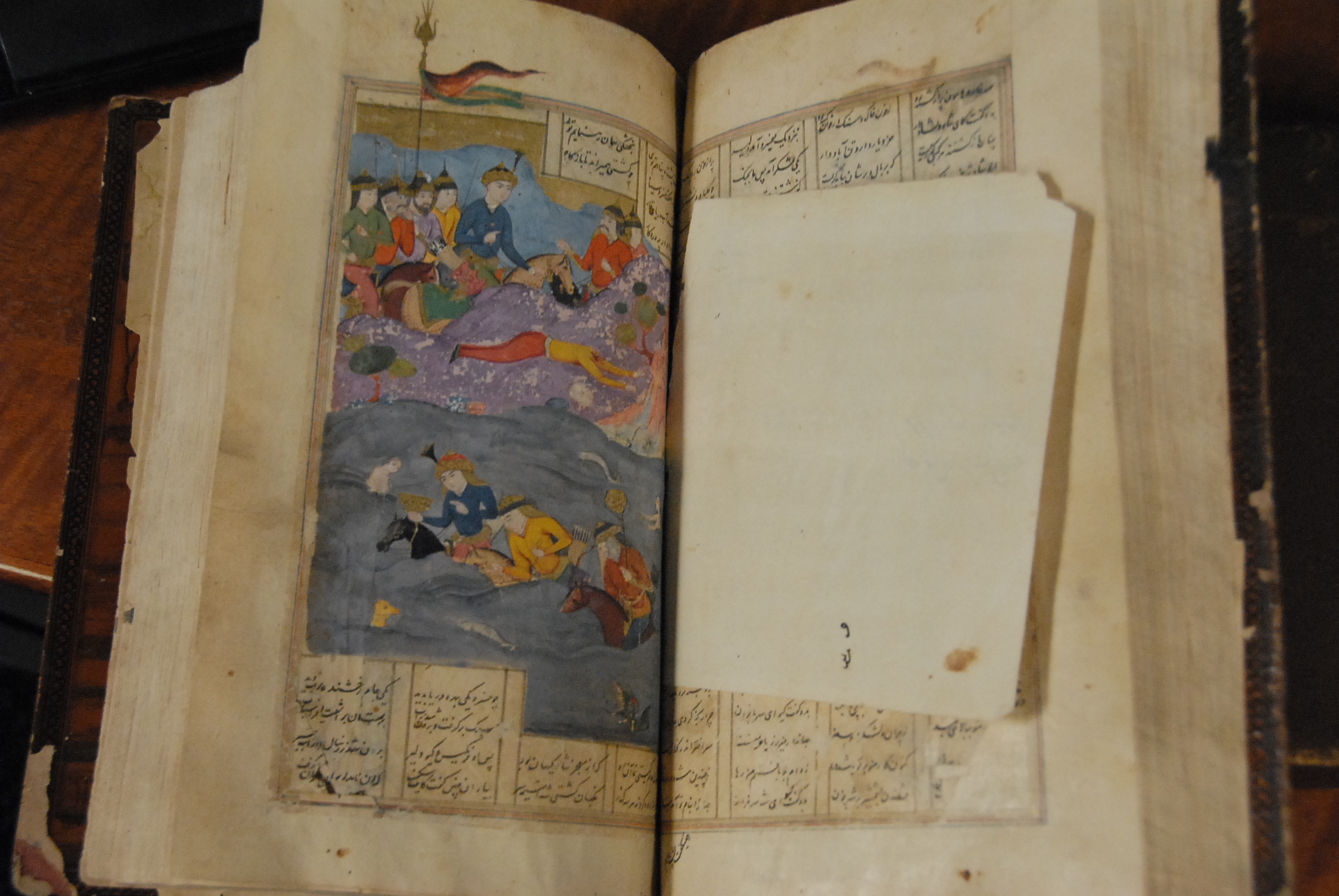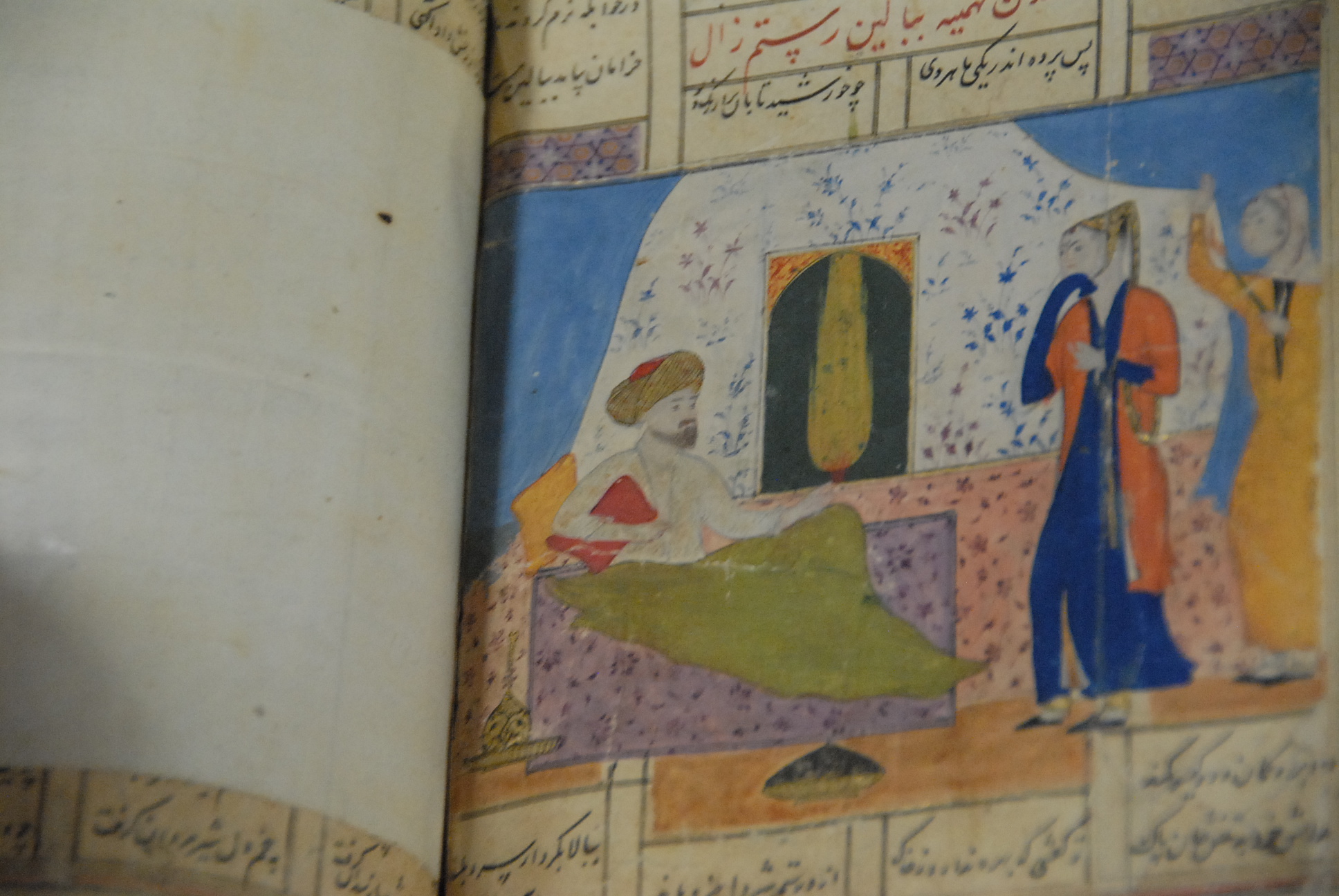 ABU AL-QASIM FIRDAWSI D. 1025AD: SHAHMAMA SAFAVID IRAN 17th Century. Twenty-Five lines of black nasta’liq script written in four columns, margins in blue, red, black and gold, 32 painted miniatures, headings in red. Front cover with imperfections, back cover in need of restoration, now in fitted leather box. From the library of Theodore Weicker. 11 x 7 Shah Nameh Firdausi