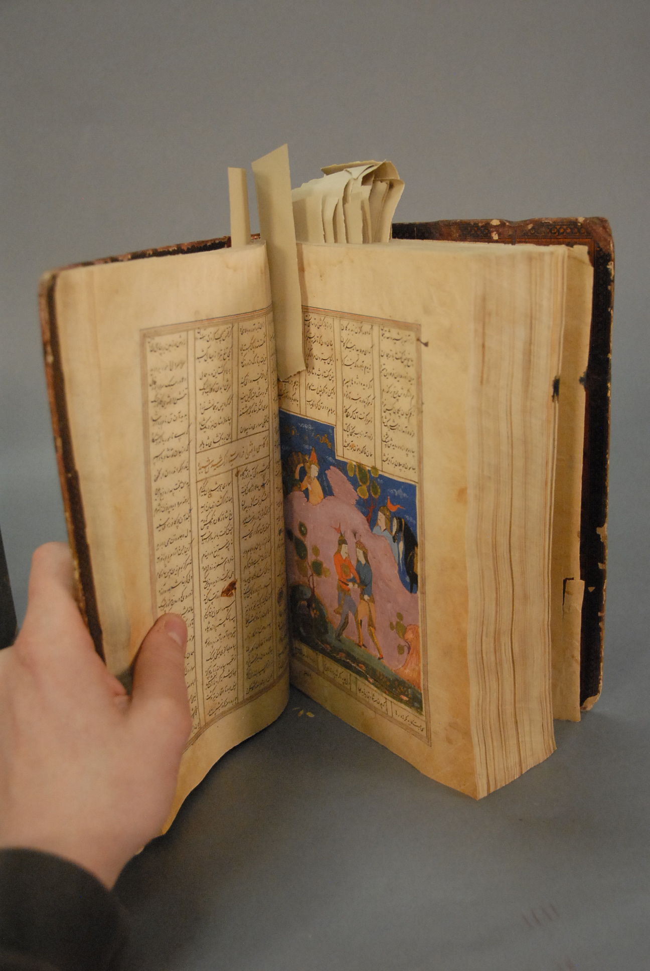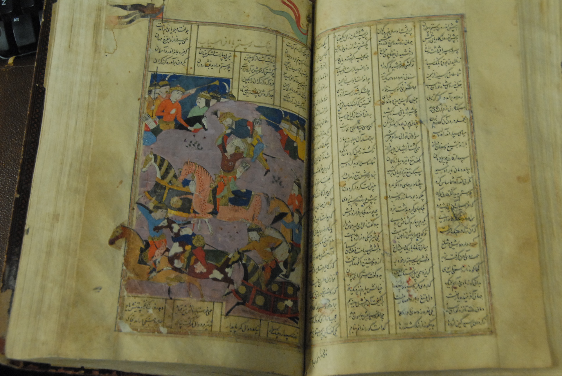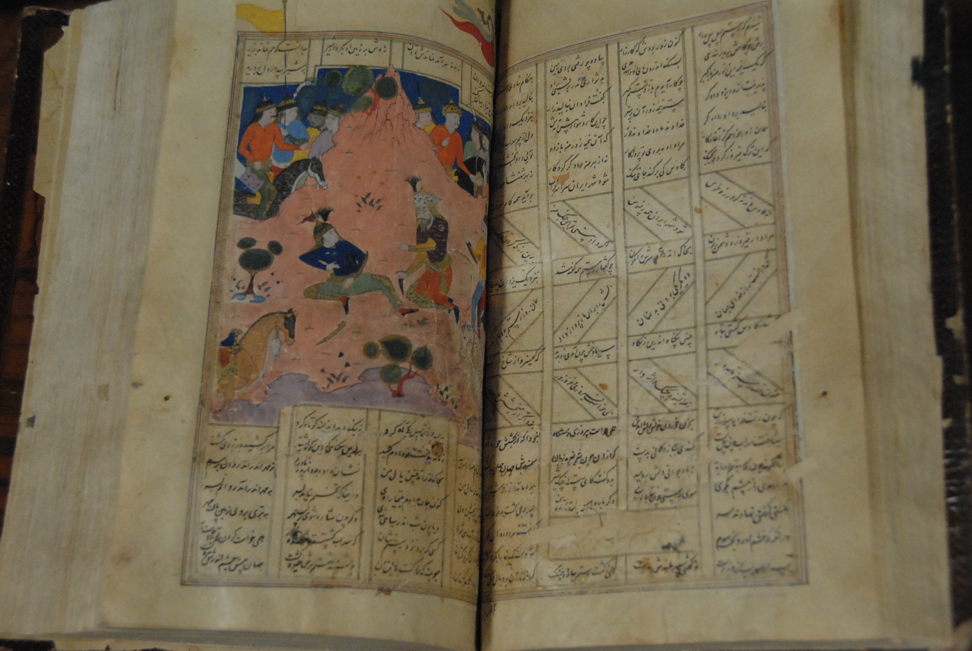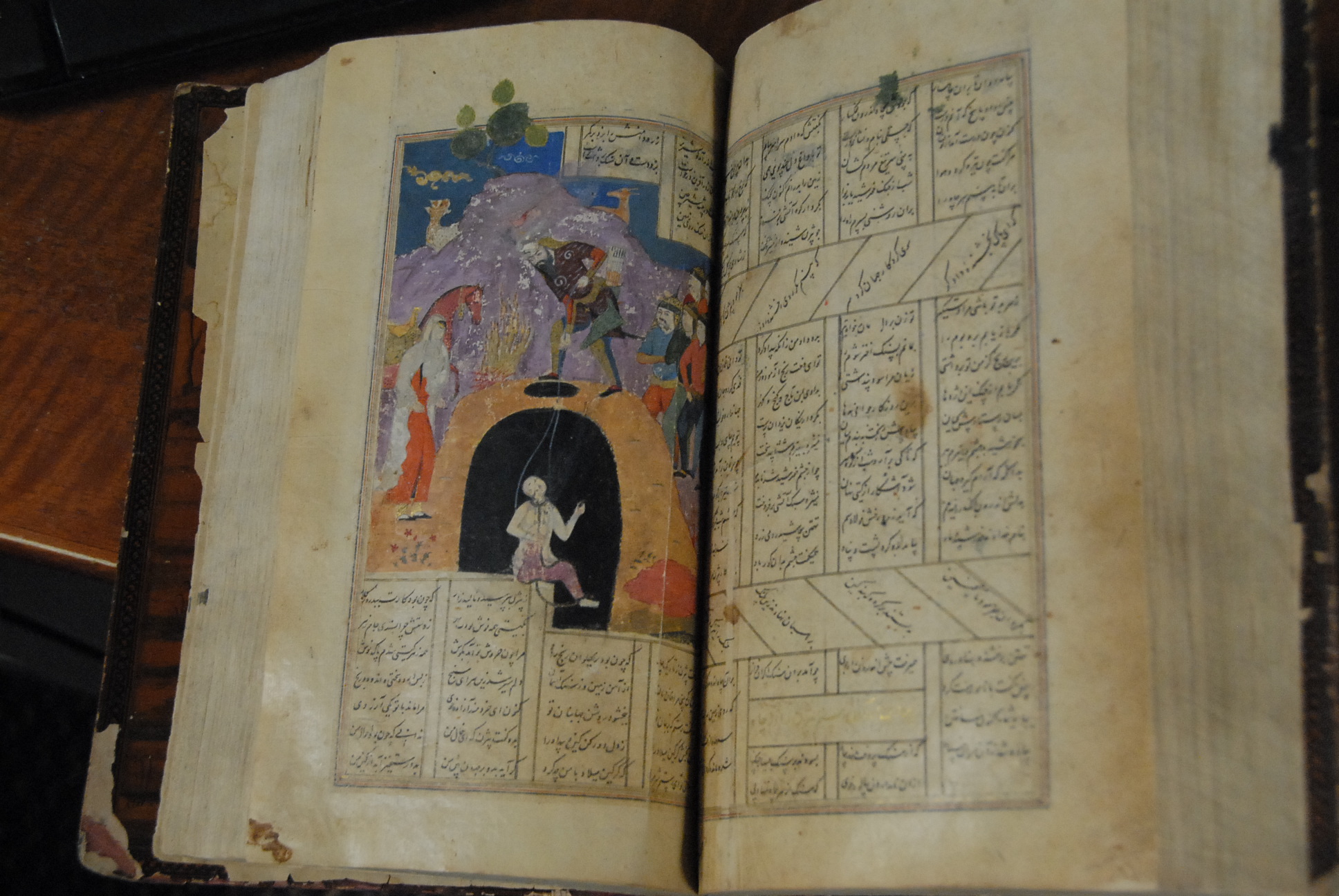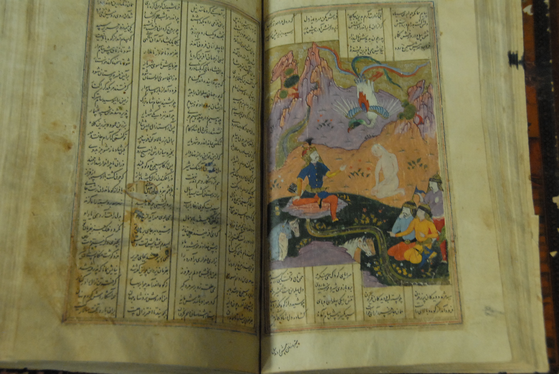 ABU AL-QASIM FIRDAWSI D. 1025AD: SHAHMAMA SAFAVID IRAN 17th Century. Twenty-Five lines of black nasta’liq script written in four columns, margins in blue, red, black and gold, 32 painted miniatures, headings in red. Front cover with imperfections, back cover in need of restoration, now in fitted leather box. From the library of Theodore Weicker. 11 x 7 Shah Nameh Firdausi