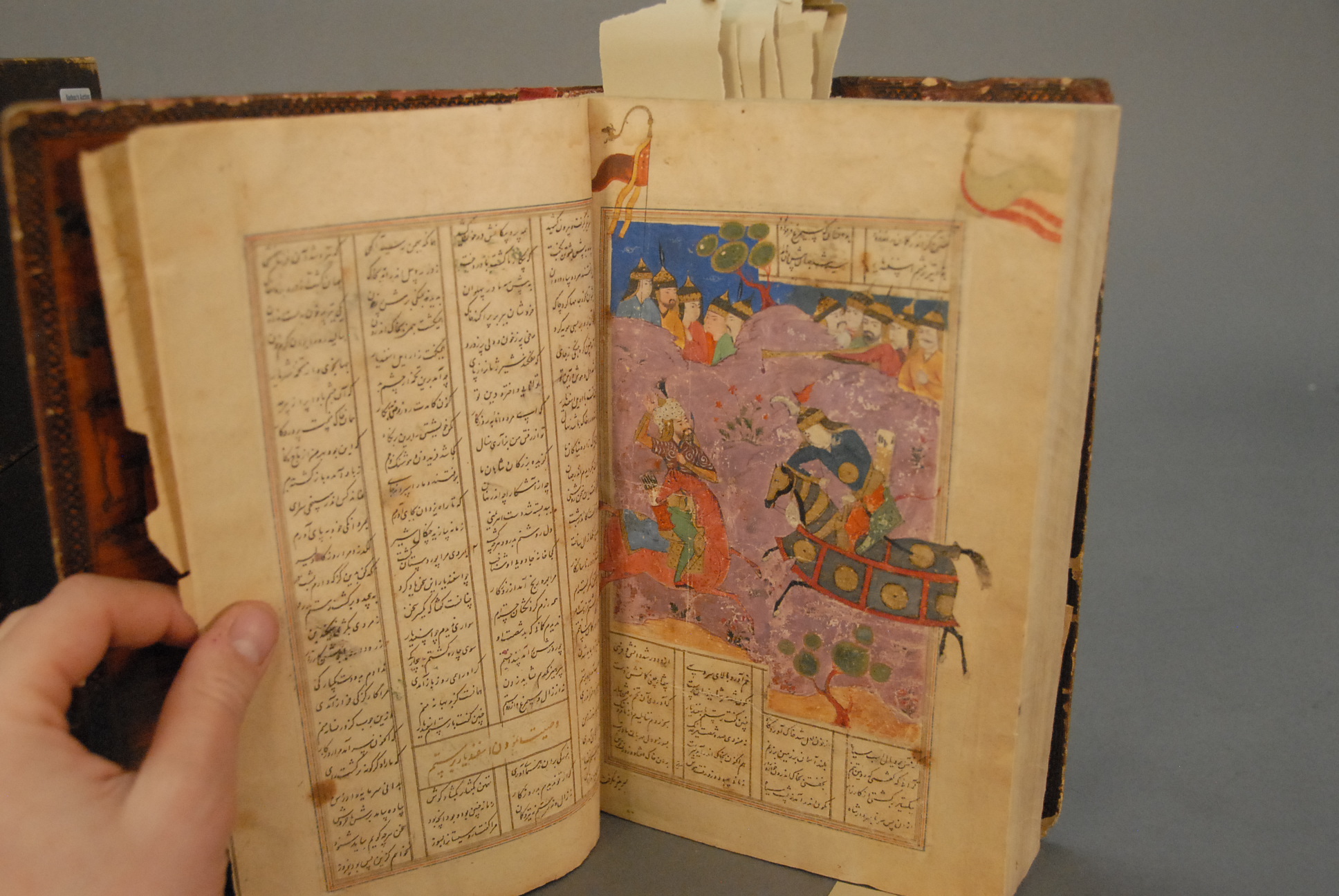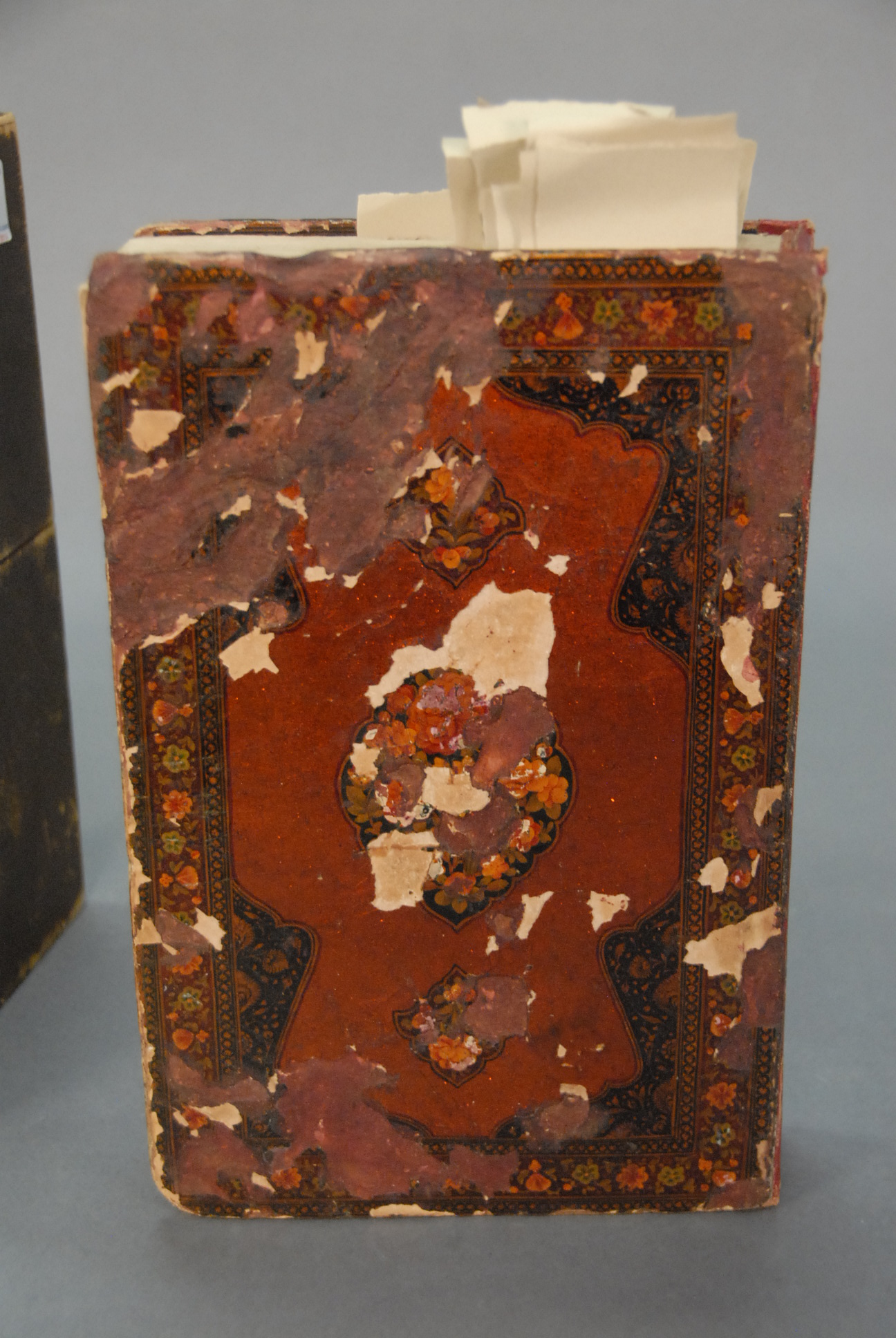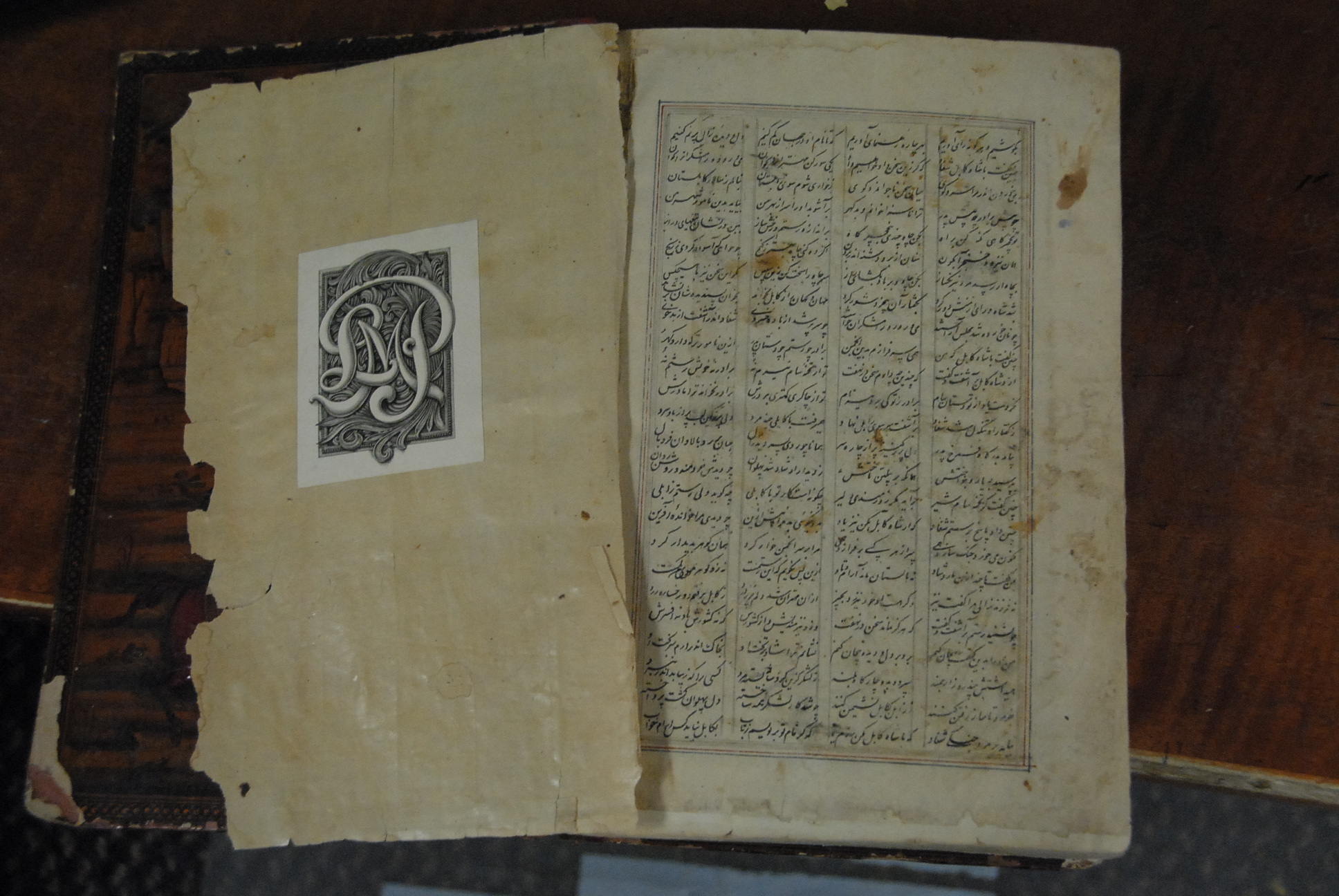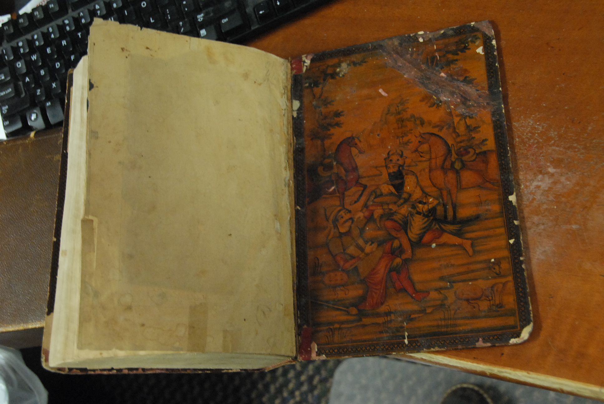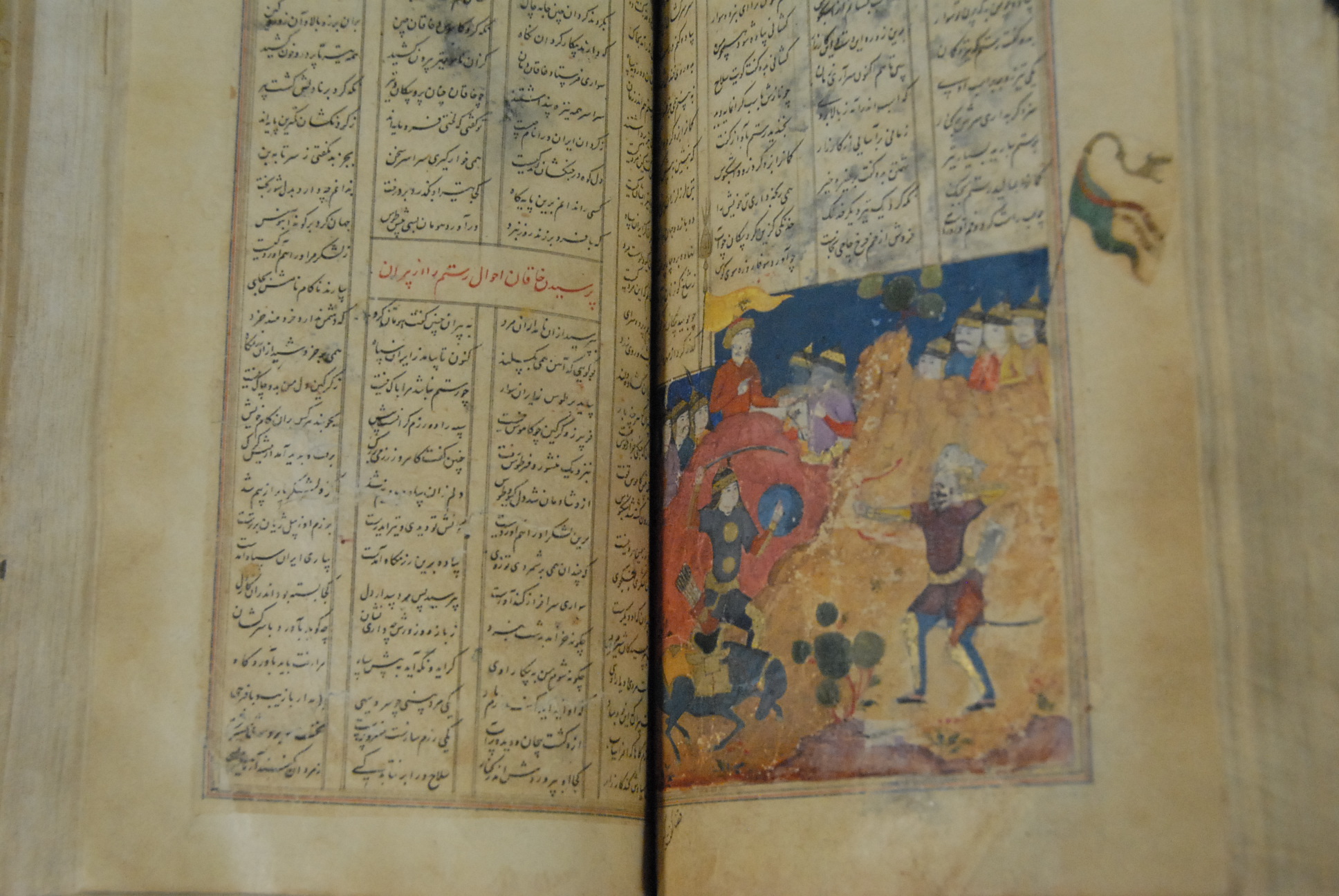ABU AL-QASIM FIRDAWSI D. 1025AD: SHAHMAMA SAFAVID IRAN 17th Century. Twenty-Five lines of black nasta’liq script written in four columns, margins in blue, red, black and gold, 32 painted miniatures, headings in red. Front cover with imperfections, back cover in need of restoration, now in fitted leather box. From the library of Theodore Weicker. 11 x 7 Shah Nameh Firdausi