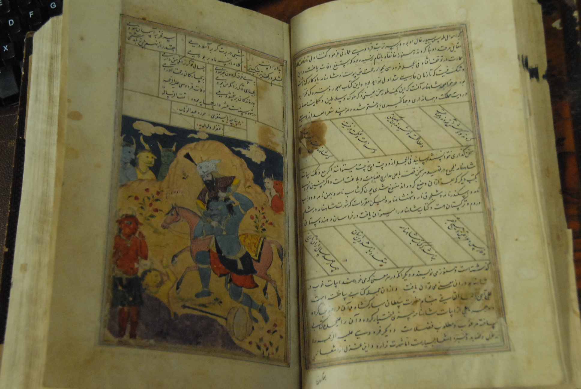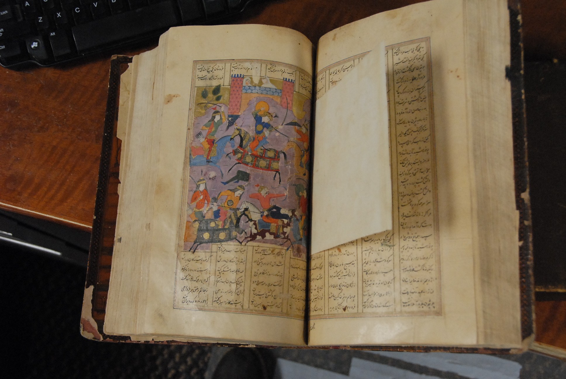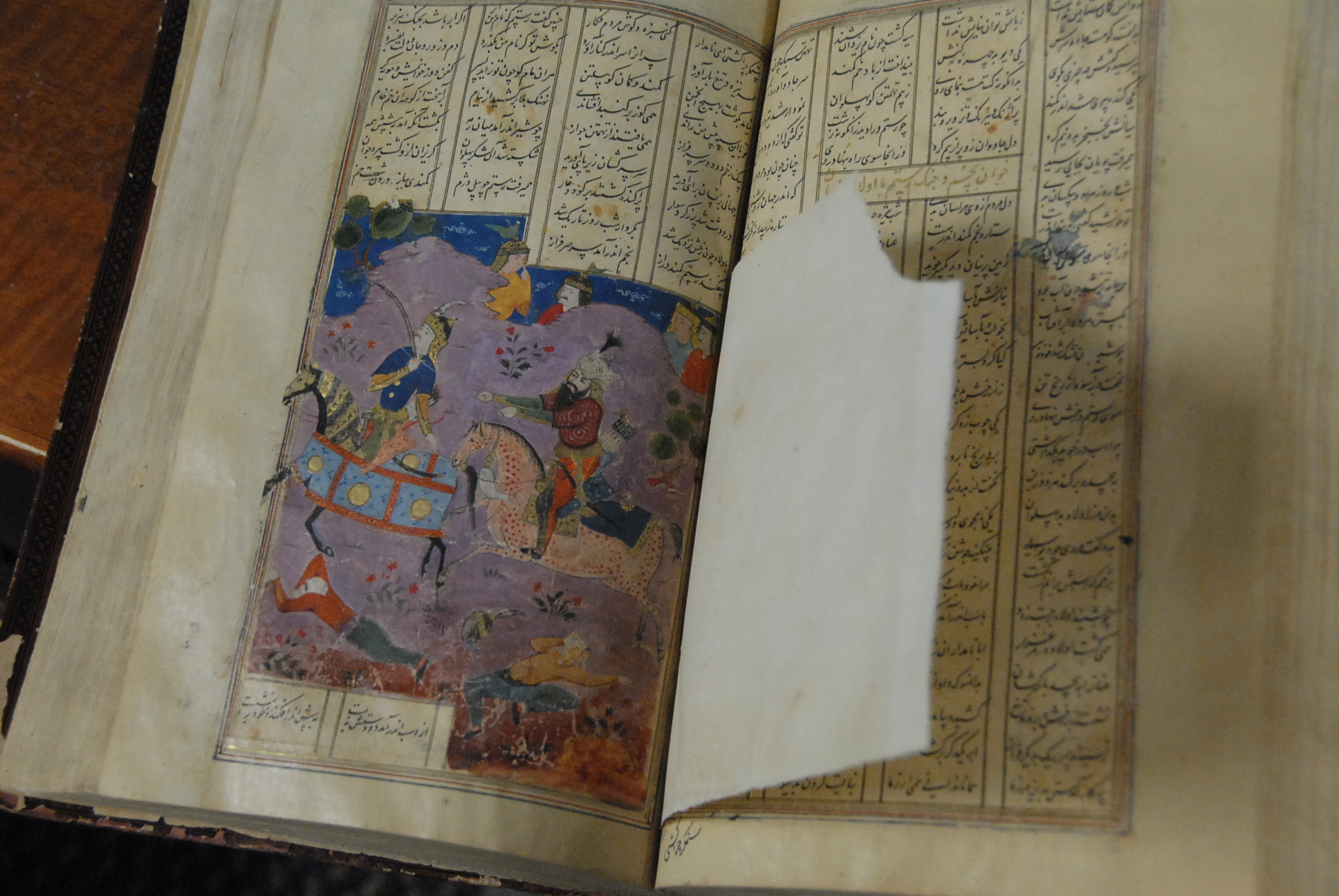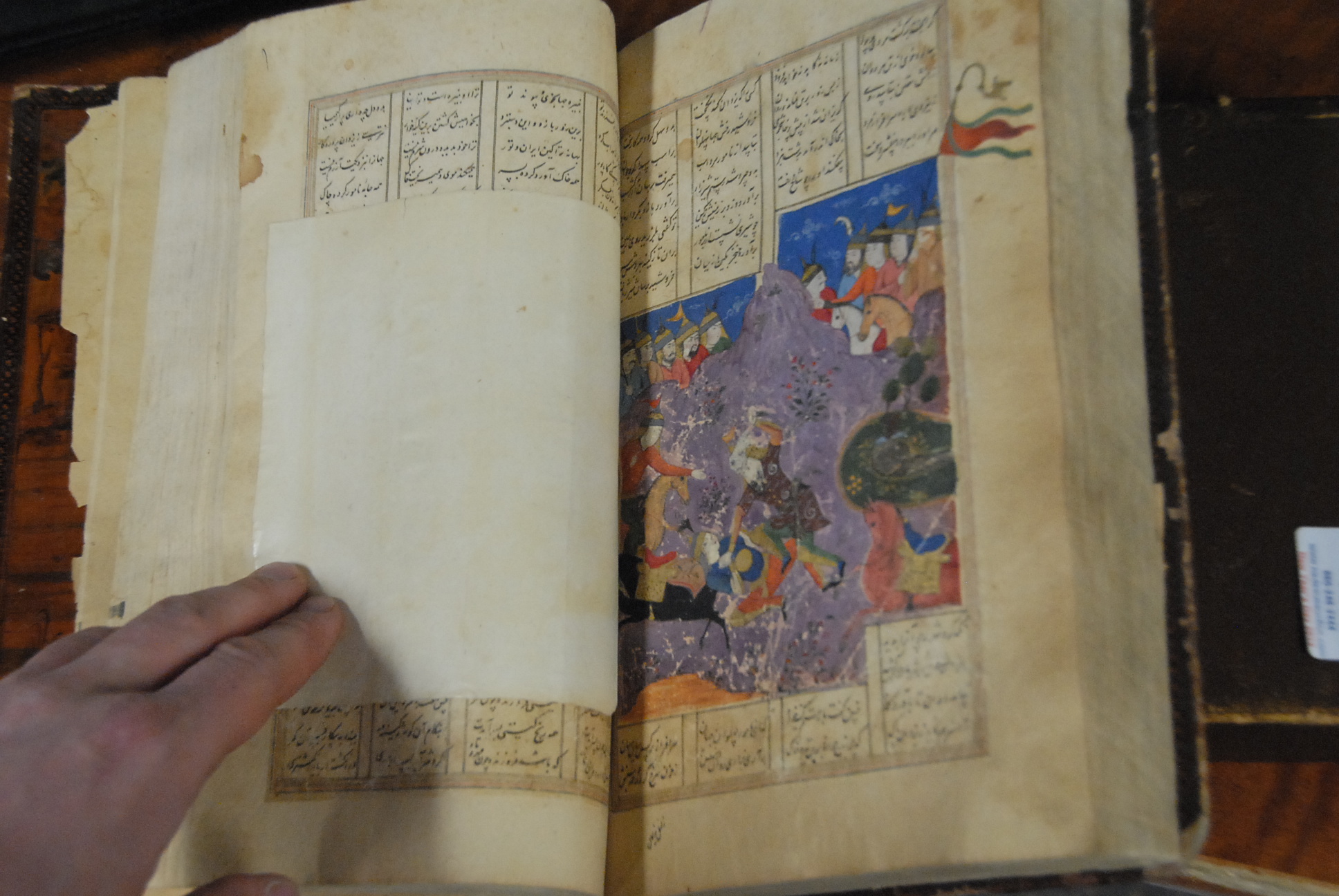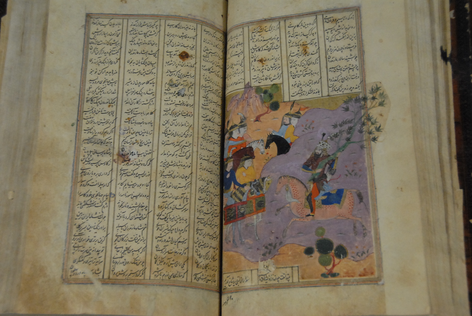 ABU AL-QASIM FIRDAWSI D. 1025AD: SHAHMAMA SAFAVID IRAN 17th Century. Twenty-Five lines of black nasta’liq script written in four columns, margins in blue, red, black and gold, 32 painted miniatures, headings in red. Front cover with imperfections, back cover in need of restoration, now in fitted leather box. From the library of Theodore Weicker. 11 x 7 Shah Nameh Firdausi