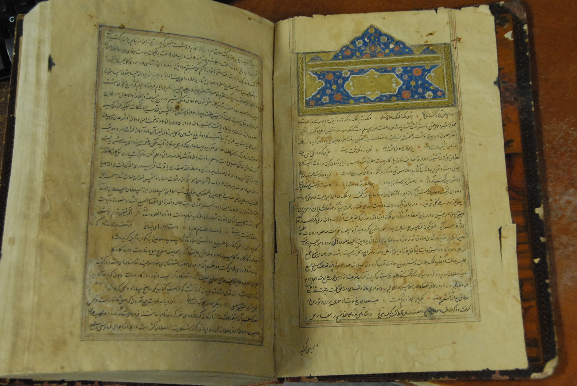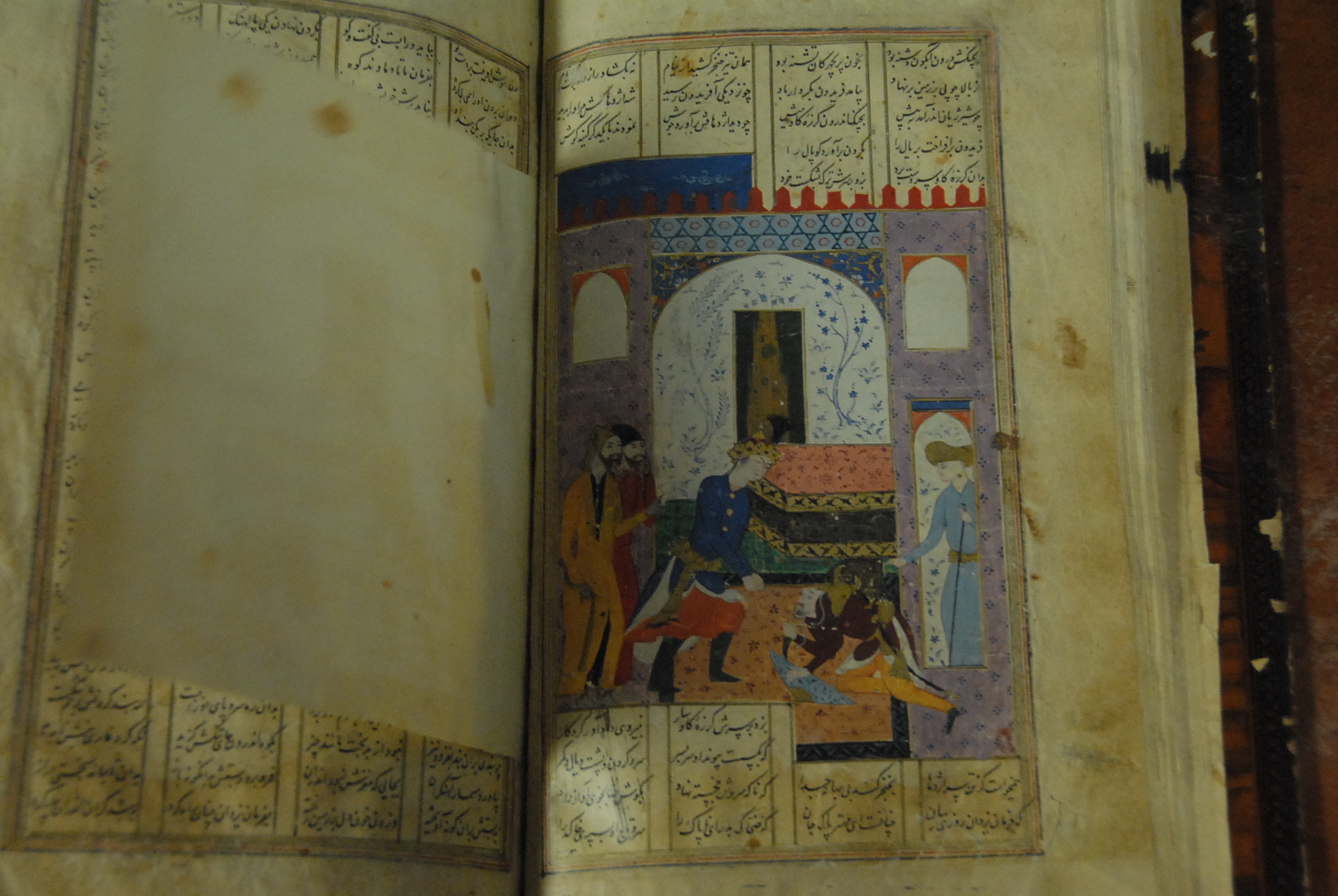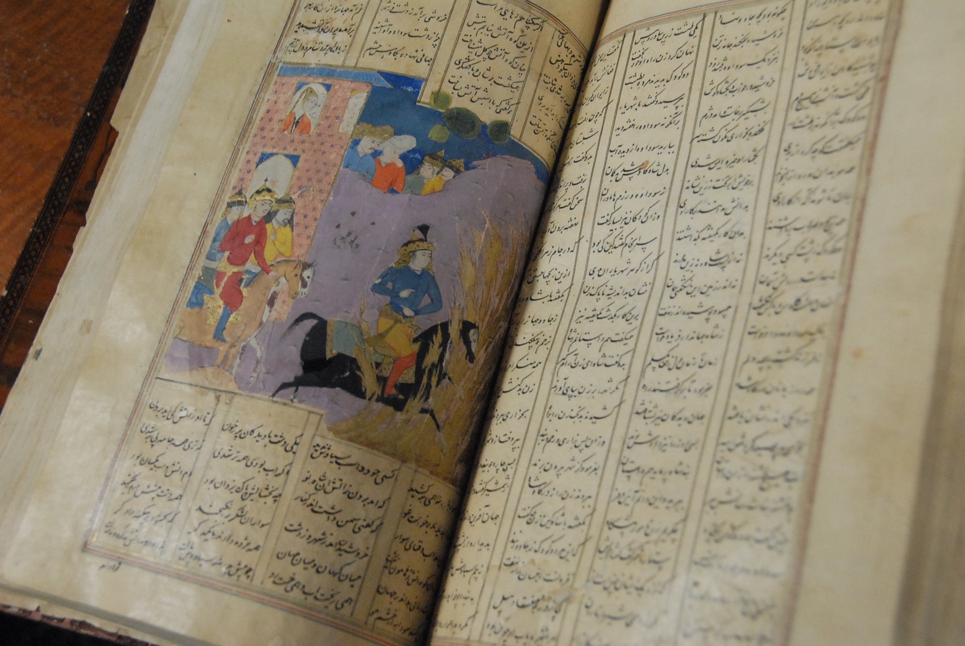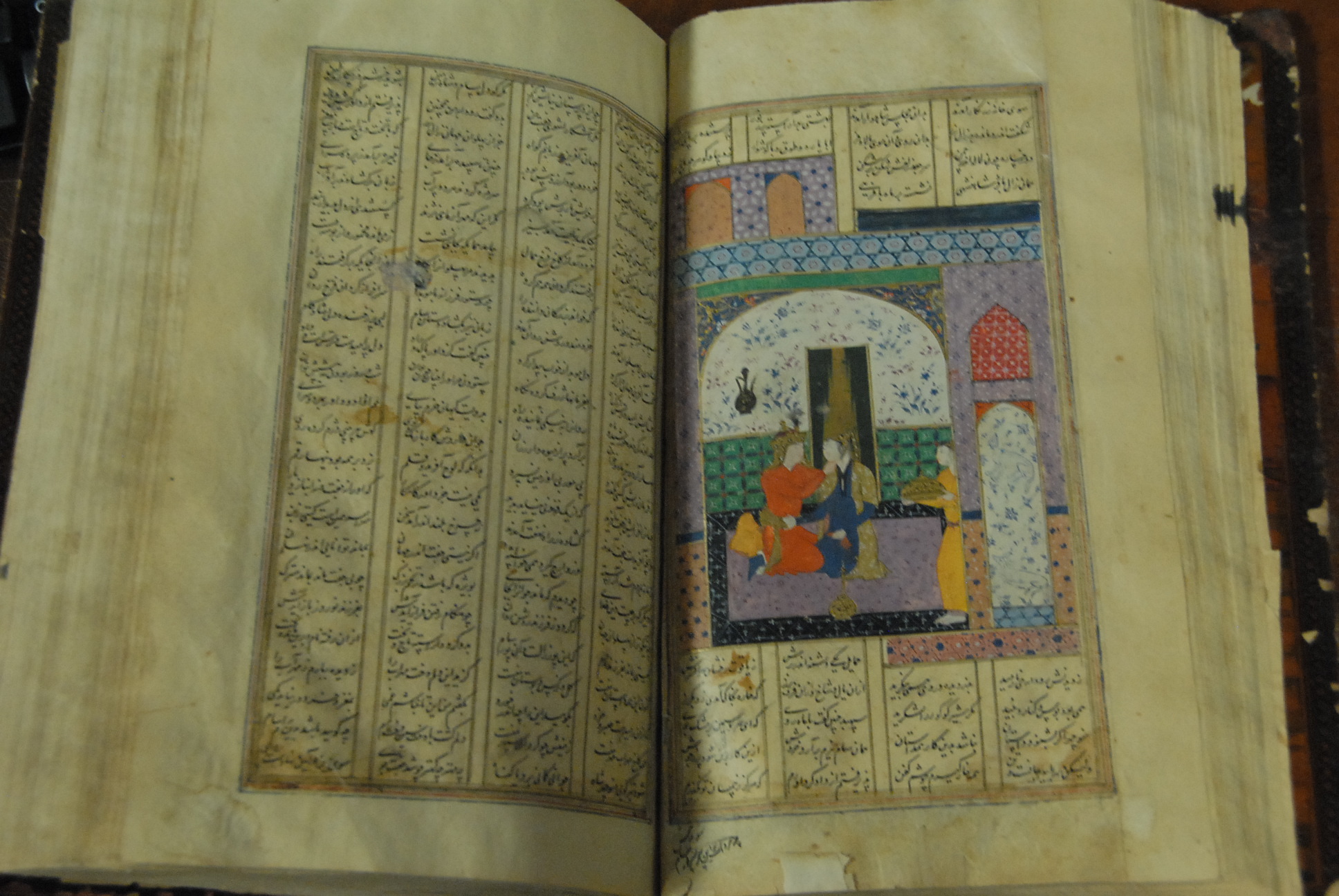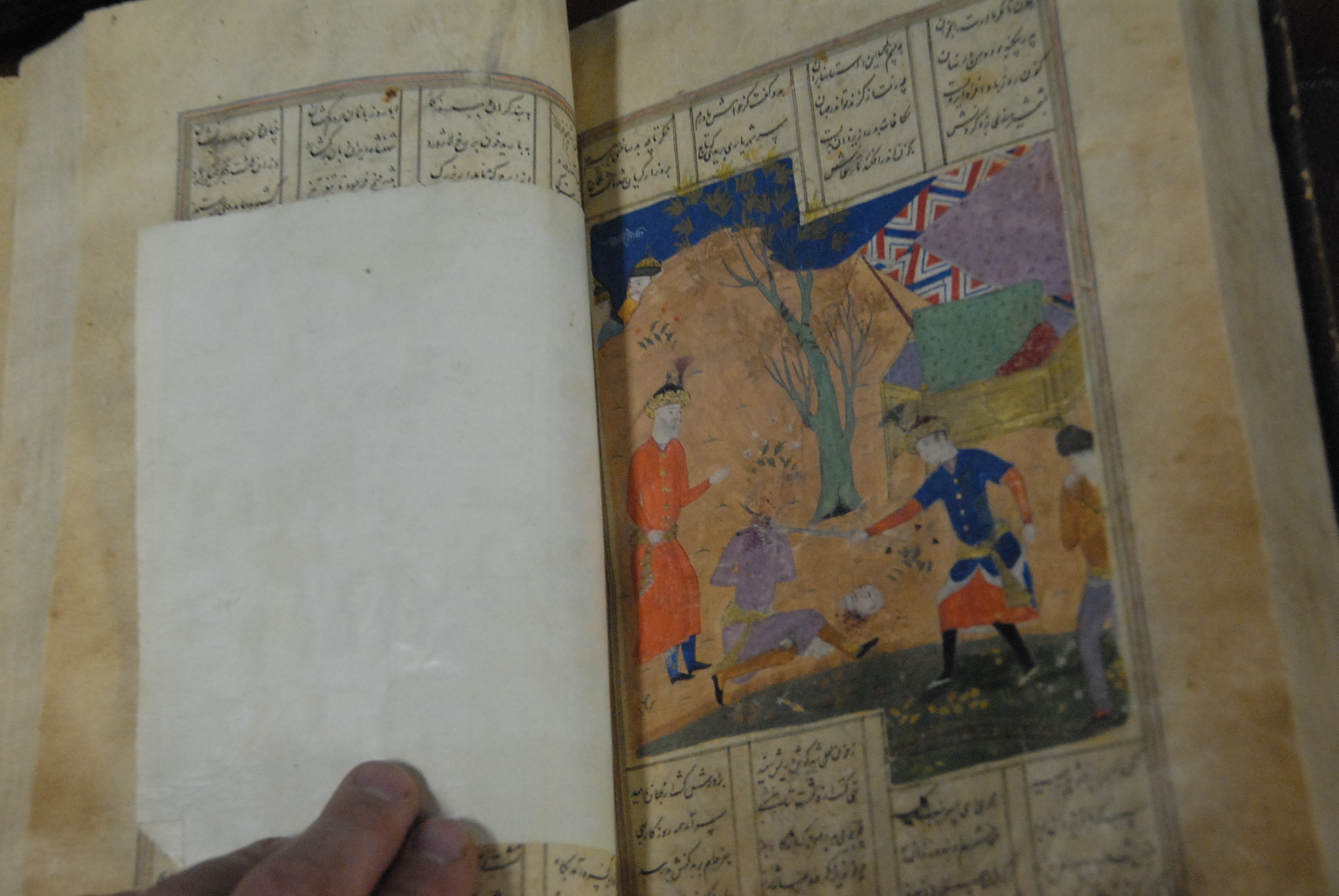 ABU AL-QASIM FIRDAWSI D. 1025AD: SHAHMAMA SAFAVID IRAN 17th Century. Twenty-Five lines of black nasta’liq script written in four columns, margins in blue, red, black and gold, 32 painted miniatures, headings in red. Front cover with imperfections, back cover in need of restoration, now in fitted leather box. From the library of Theodore Weicker. 11 x 7 Shah Nameh Firdausi