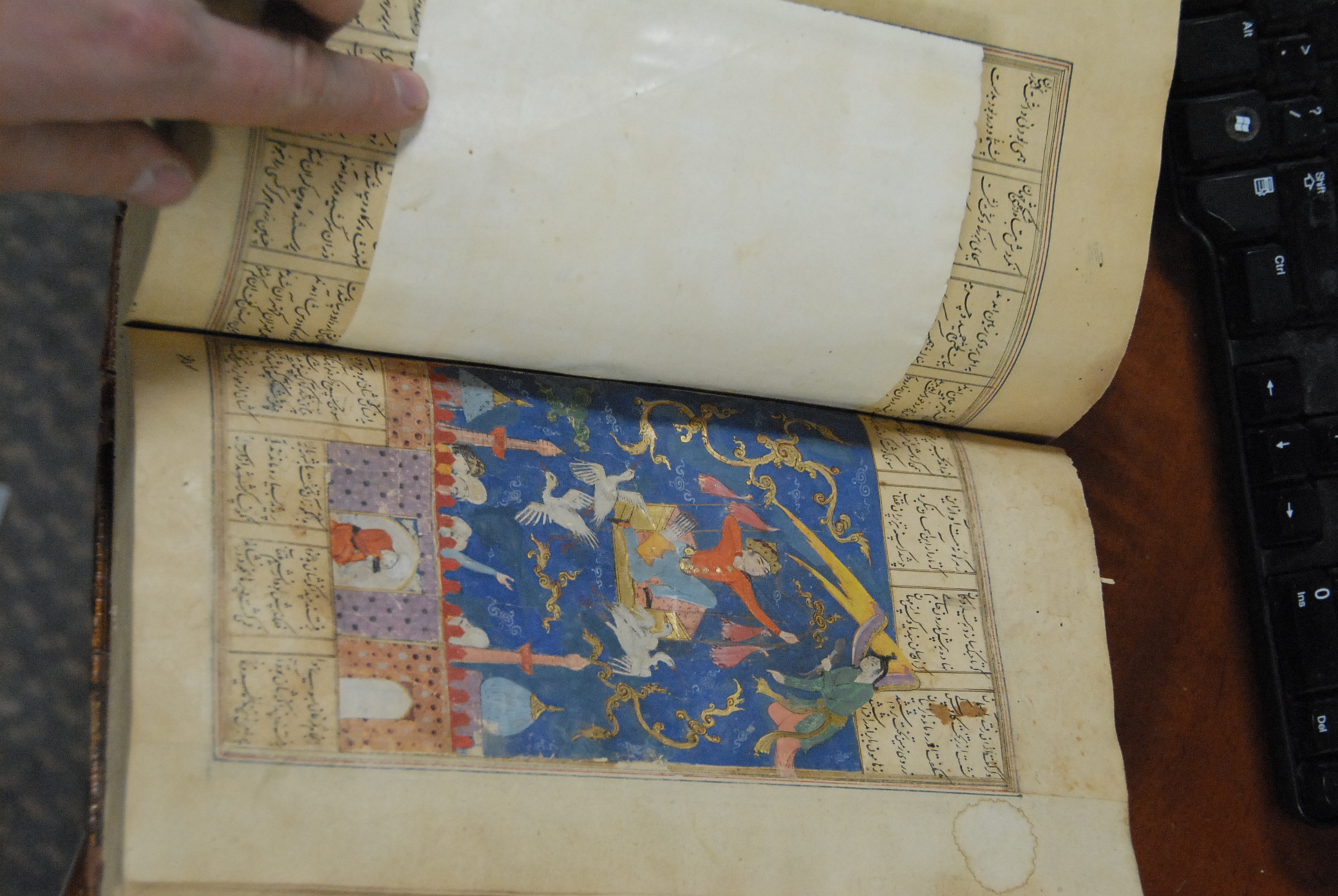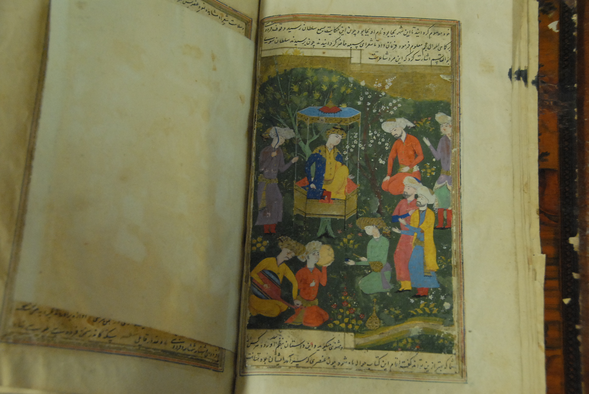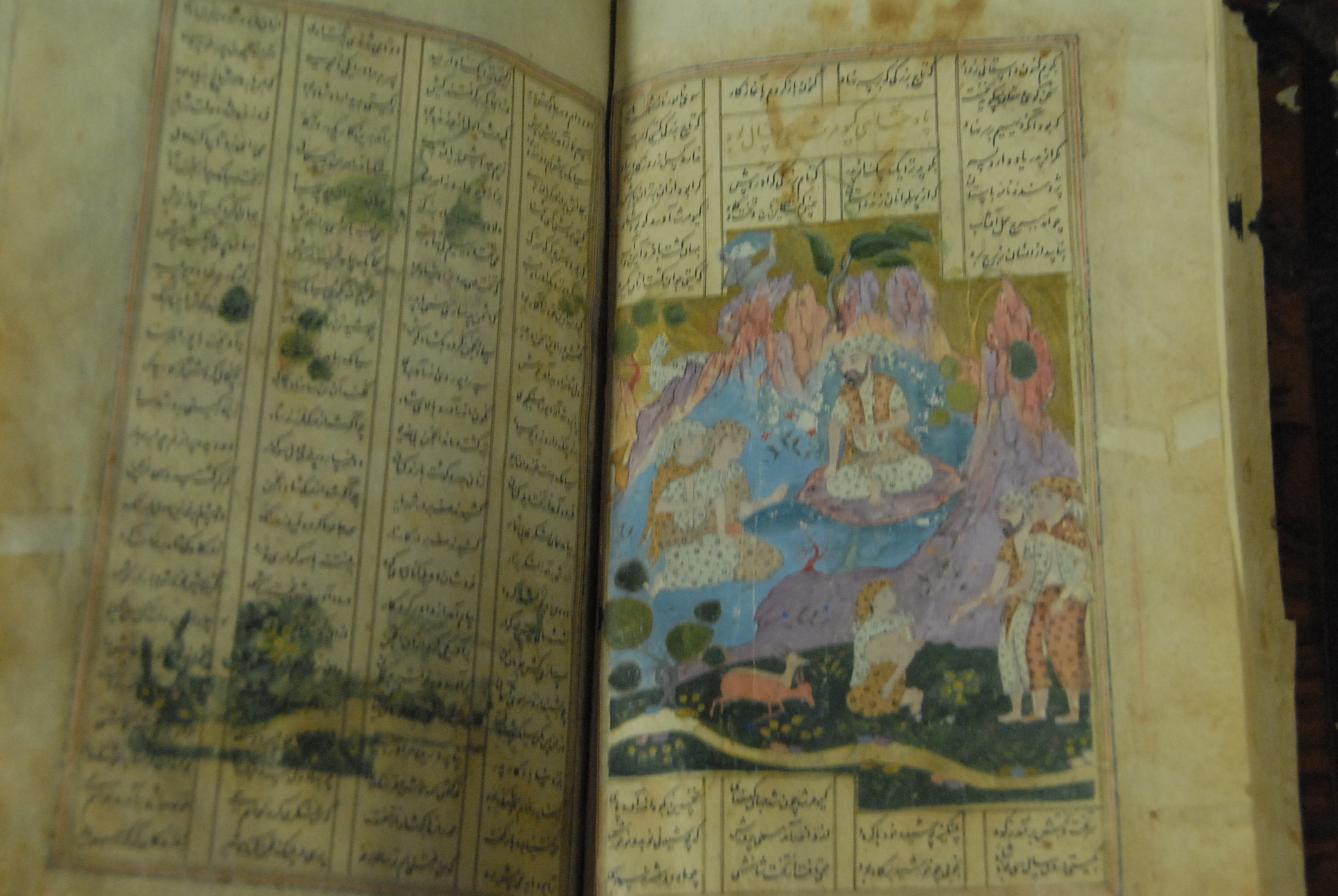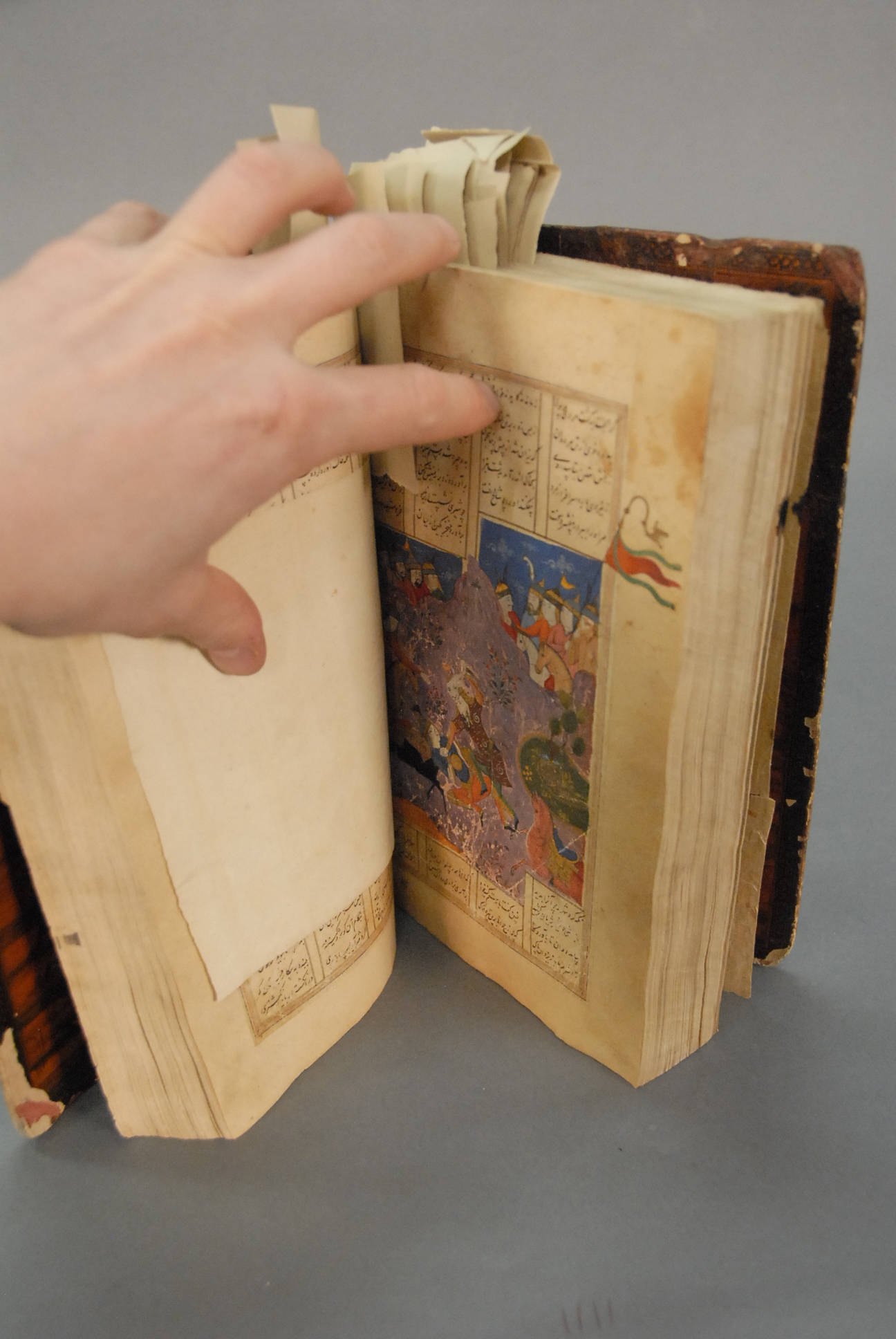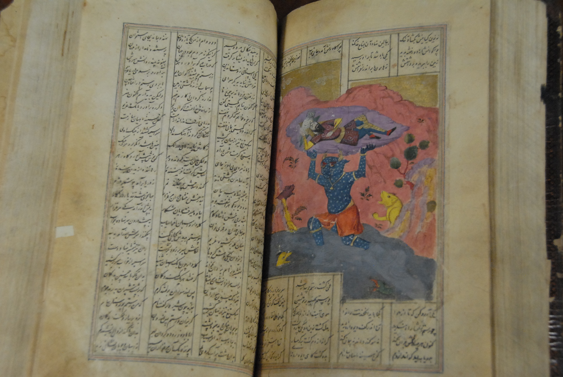 ABU AL-QASIM FIRDAWSI D. 1025AD: SHAHMAMA SAFAVID IRAN 17th Century. Twenty-Five lines of black nasta’liq script written in four columns, margins in blue, red, black and gold, 32 painted miniatures, headings in red. Front cover with imperfections, back cover in need of restoration, now in fitted leather box. From the library of Theodore Weicker. 11 x 7 Shah Nameh Firdausi