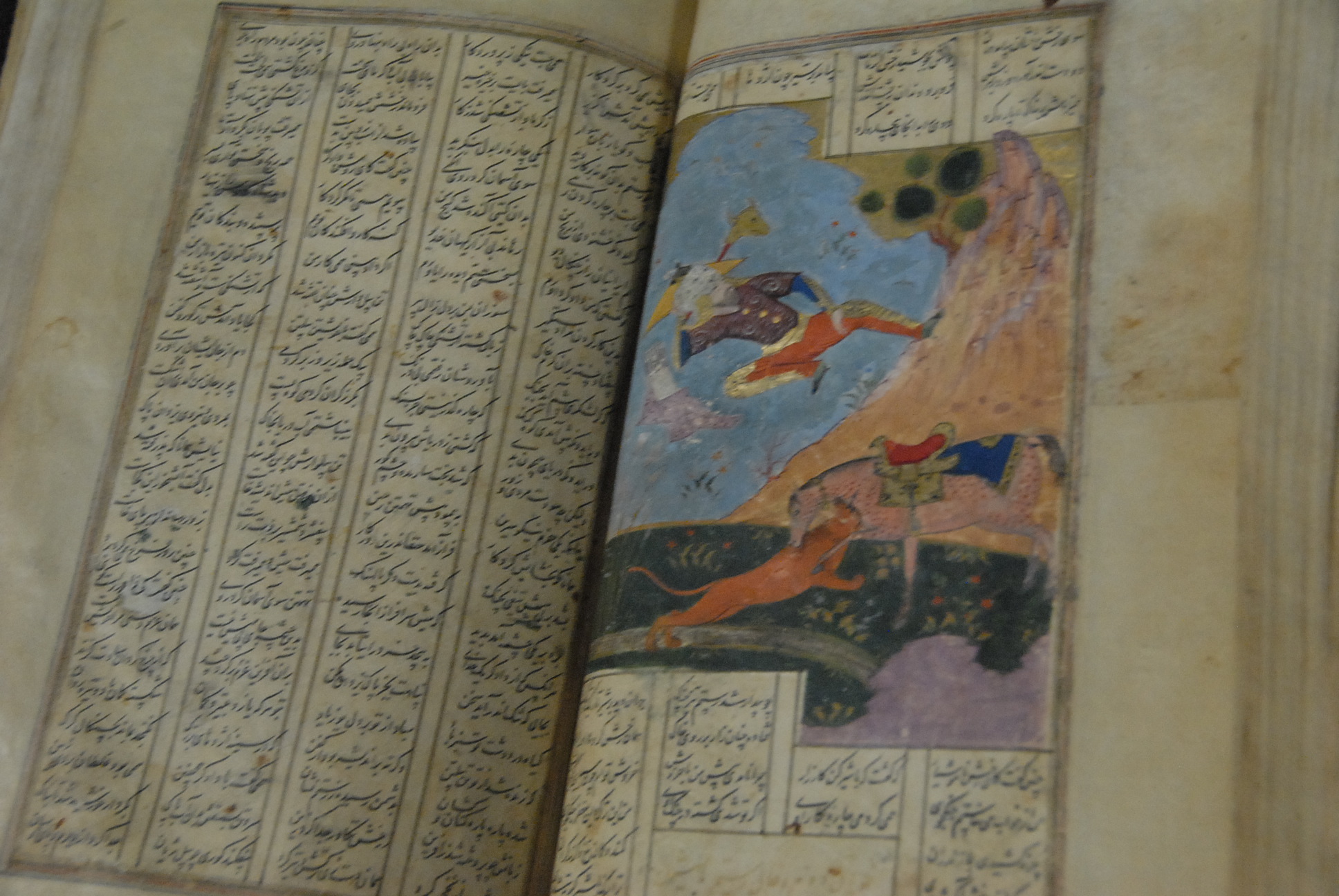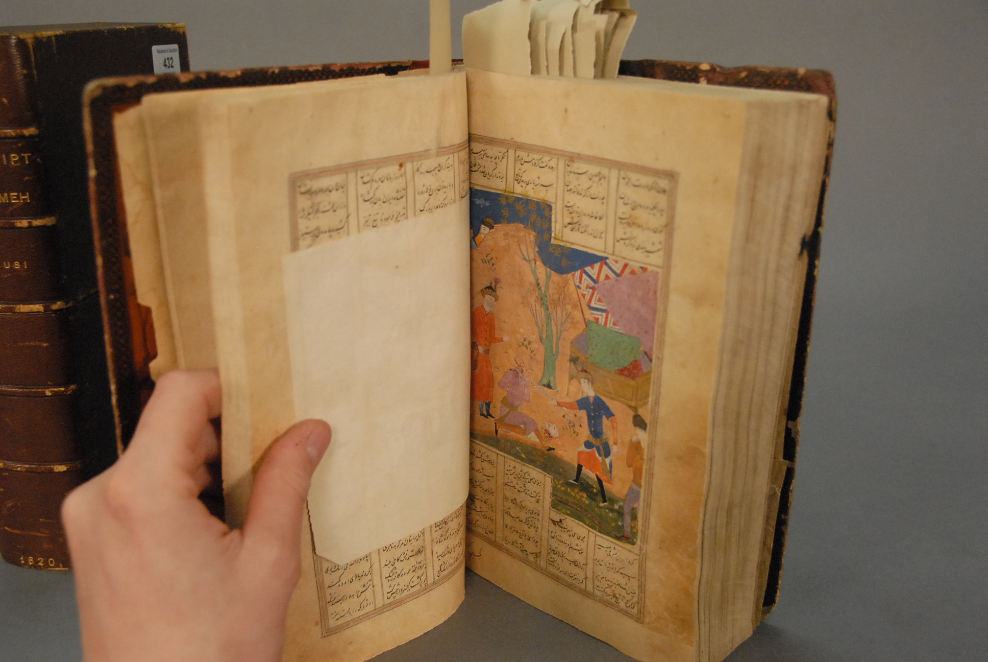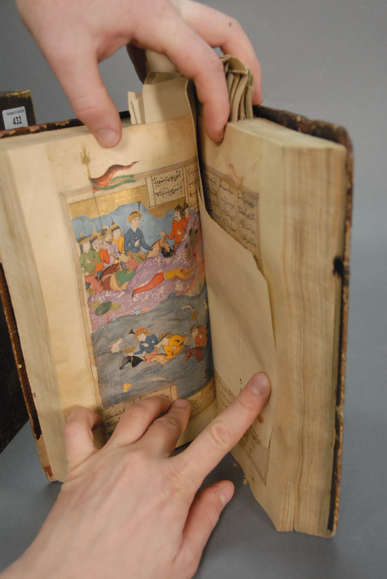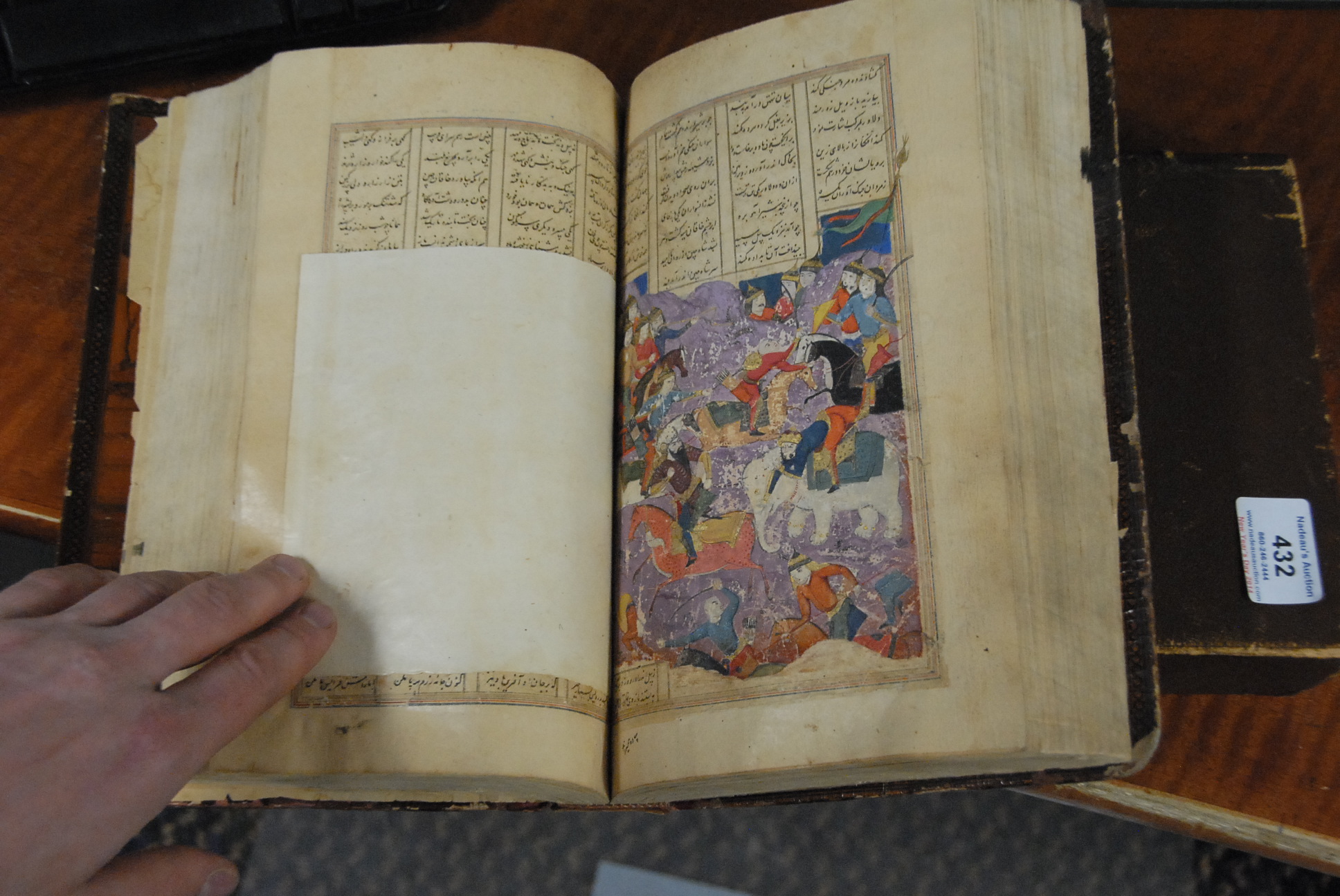 Lot 432: ABU AL-QASIM FIRDAWSI D. 1025AD: SHAHMAMA SAFAVID IRAN 17th Century. Twenty-Five lines of black nasta’liq script written in four columns, margins in blue, red, black and gold, 32 painted miniatures, headings in red. Front cov