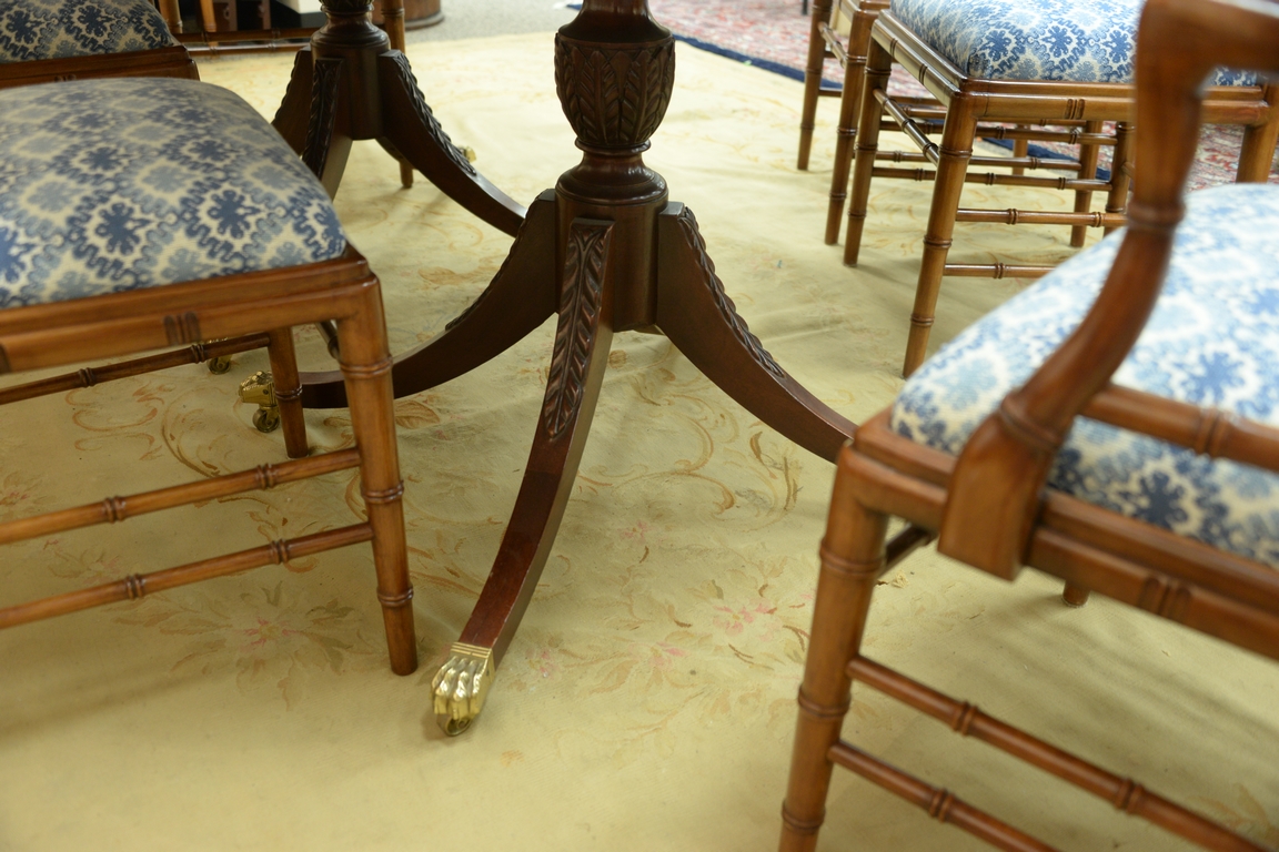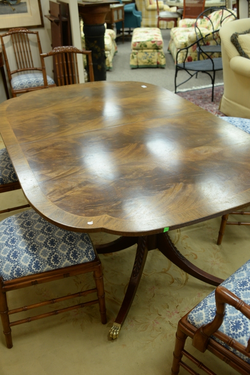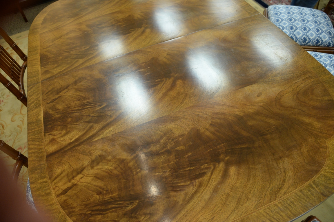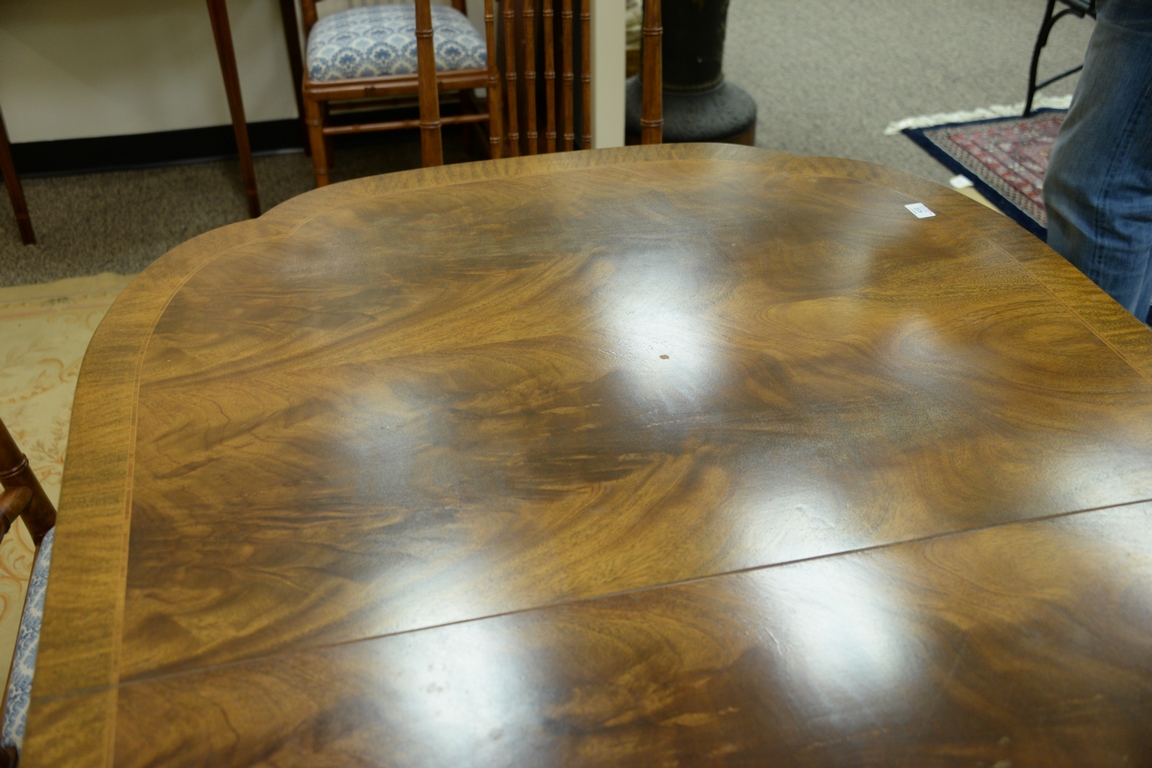 Lot 432: Baker Historic Charleston Collection mahogany dining table having shaped banded inlaid top on double pedestal base, plus two leaves….
