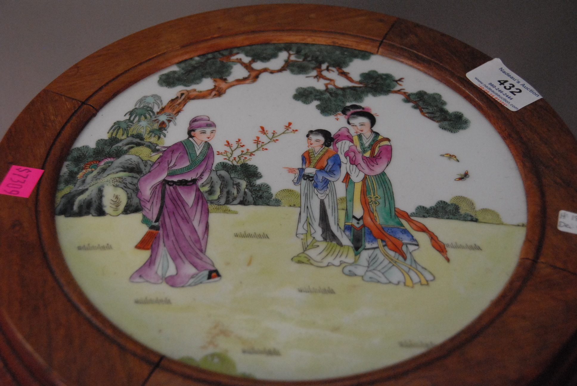 Chinese stand with painted porcelain top. ht. 18 in. porcelain dia. 9 1/2 in.