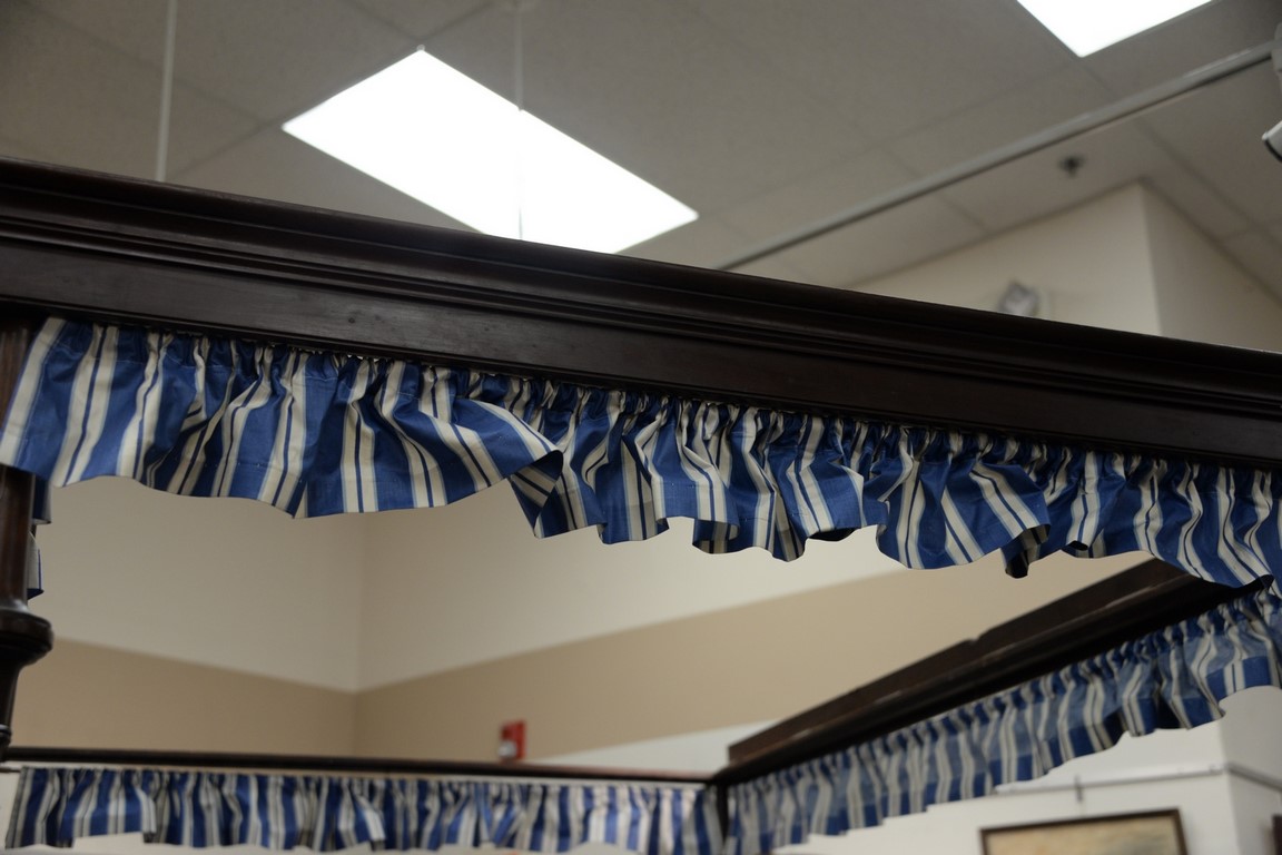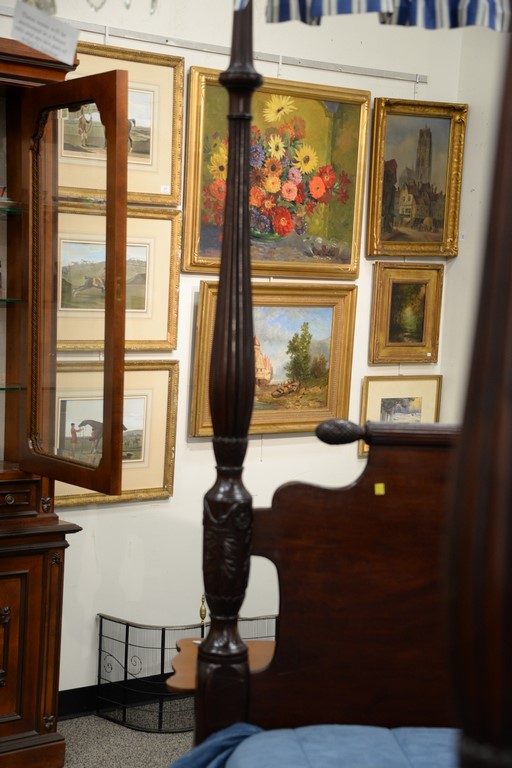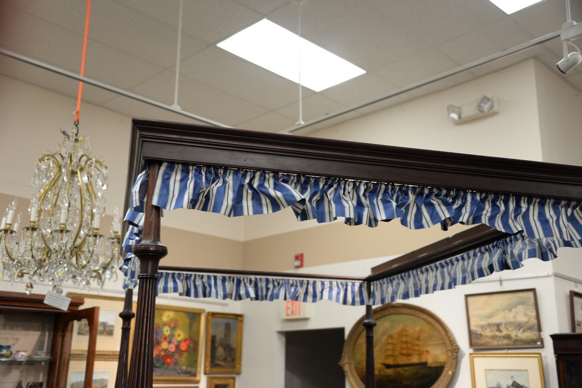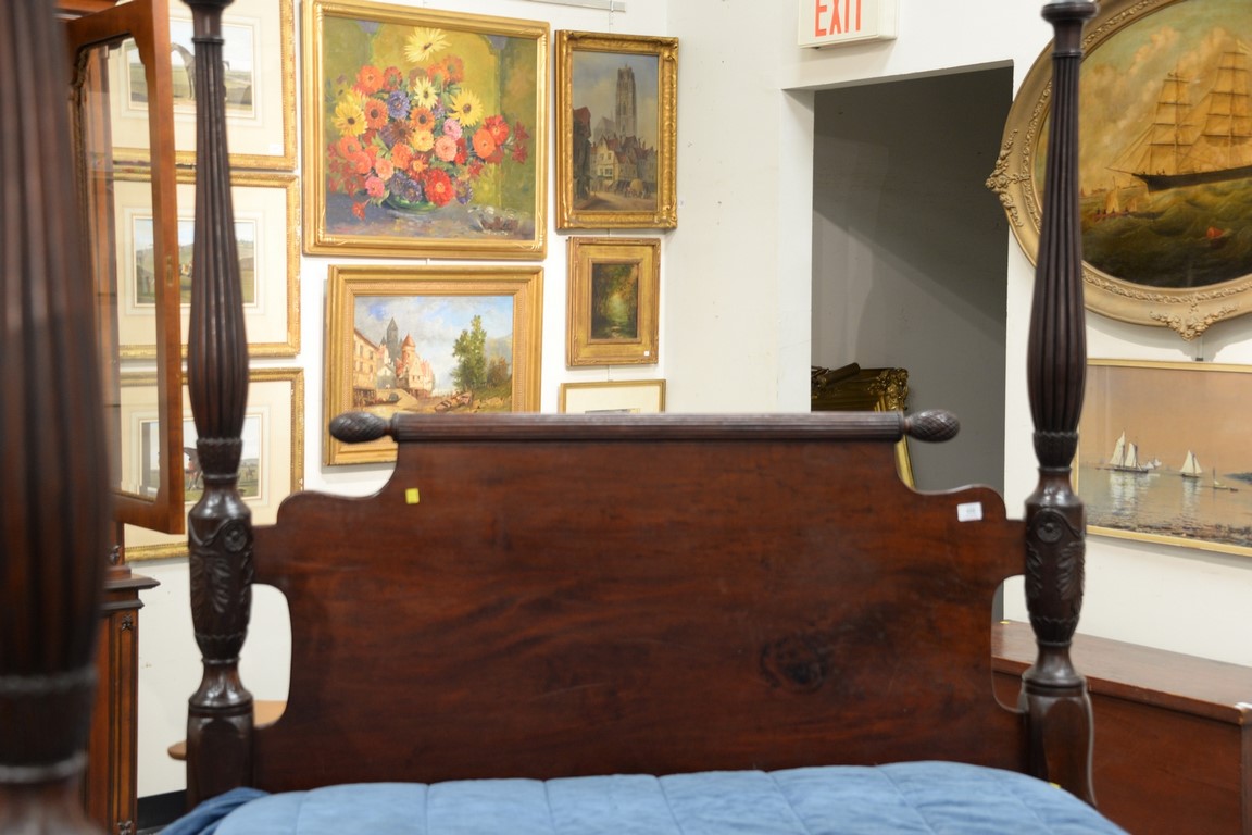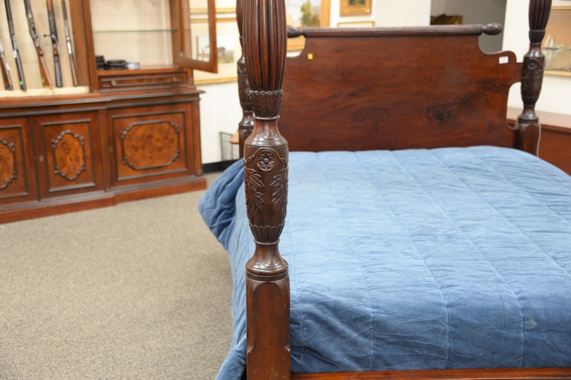 Lot 432: Federal mahogany canopy bed with carved and fluted posts having flat canopy frame. ht. 89in., total lg. 82in., wd. 60in.