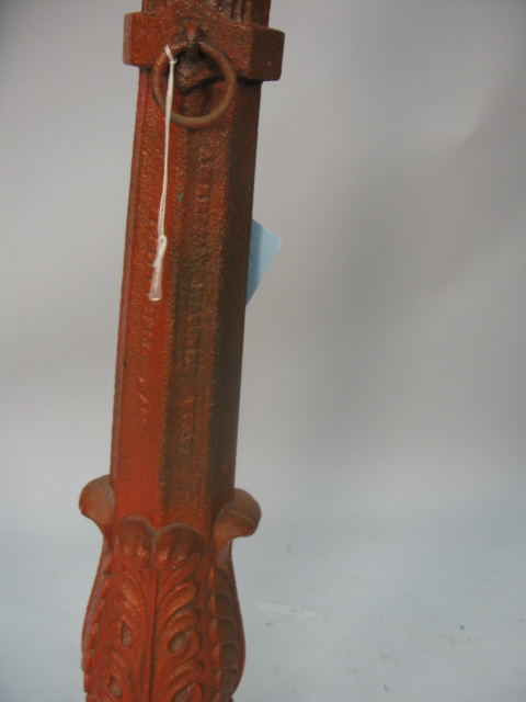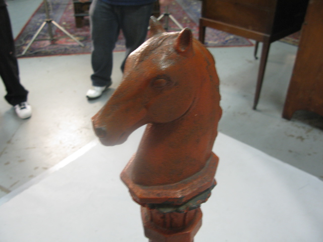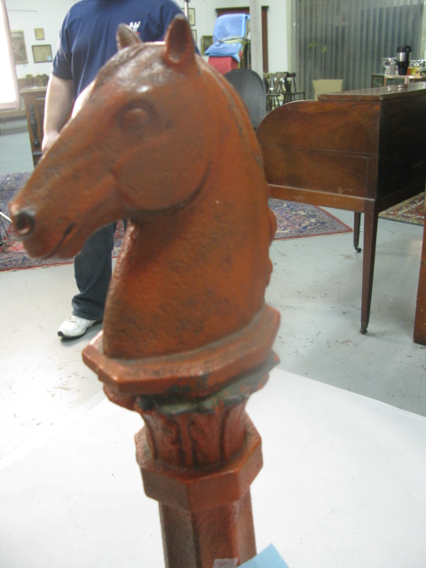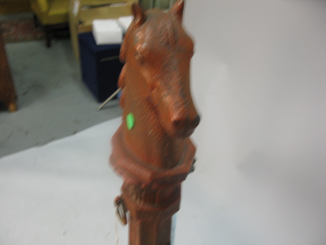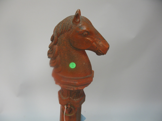 Iron house hitching post signed American Machine Works with typical horse head top.
