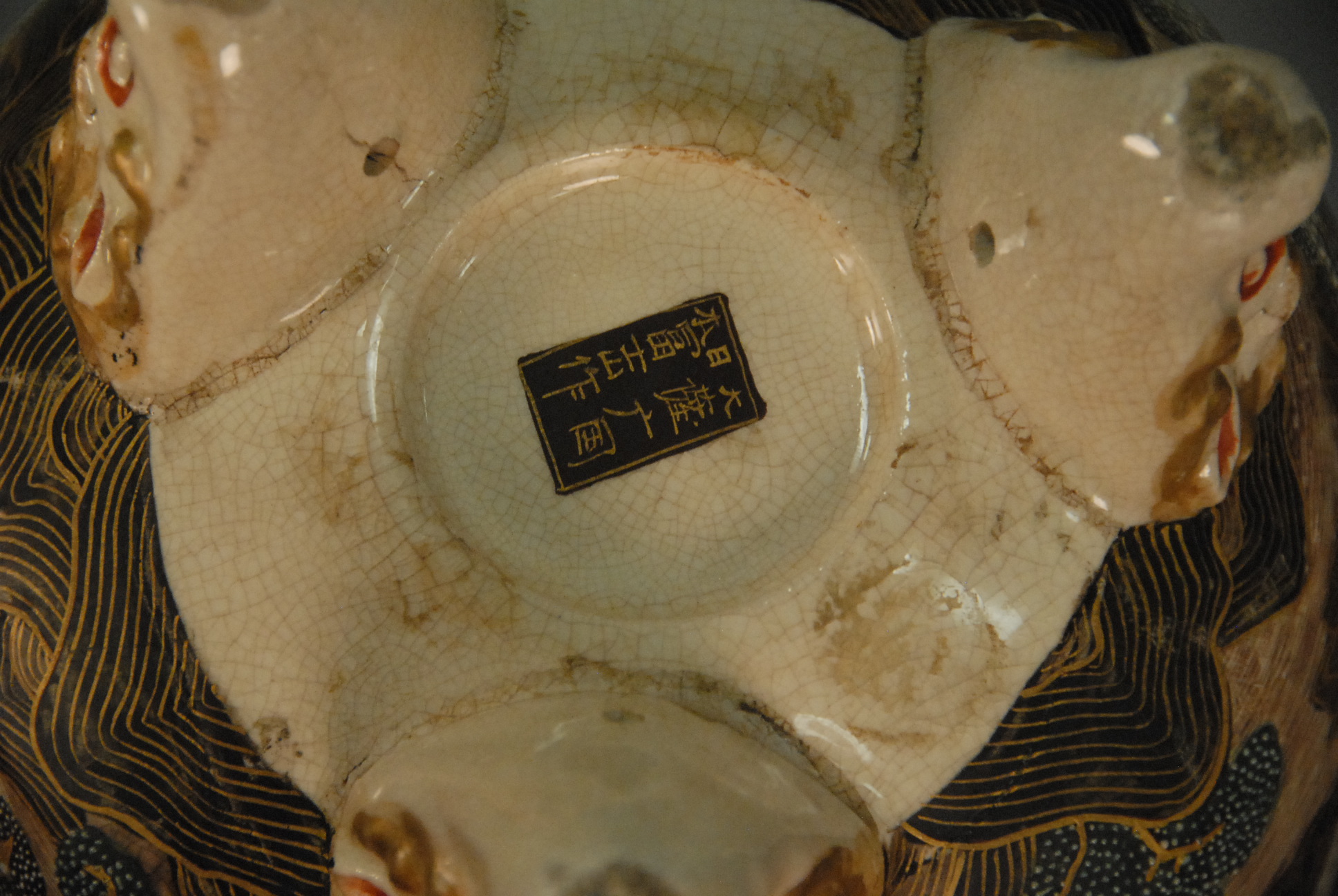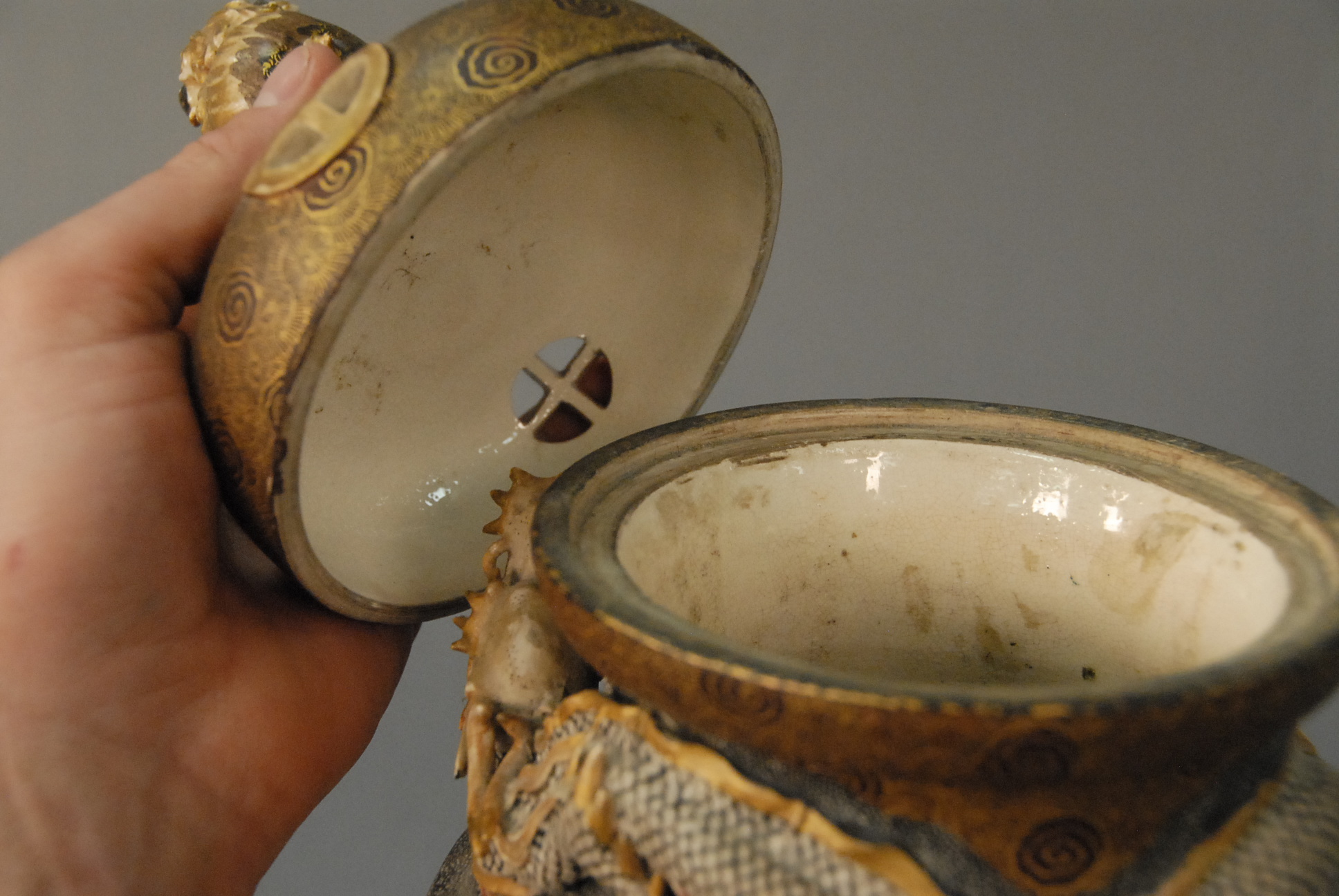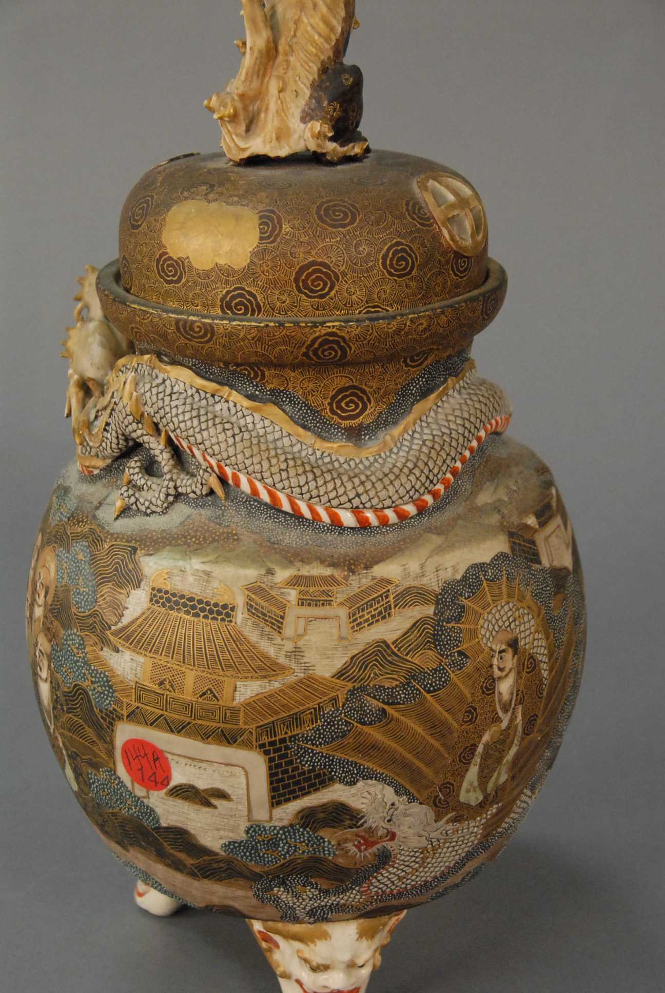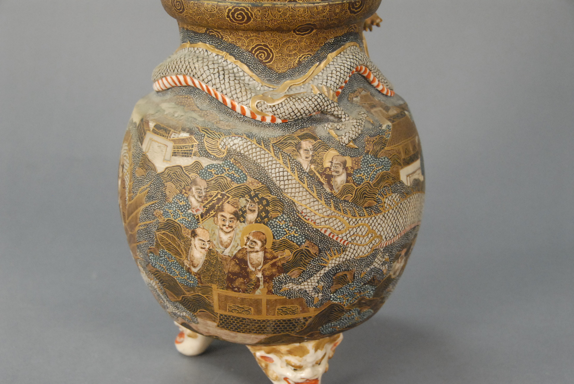 Lot 432: Kyoto Satsuma Tripod Koro with high relief dragon circling neck, raised on demon-form feet. Body decorated with white dragon and Rakhans. Detailed Shishi finial on pierced cover, Japan, 19th century. ht. 16in.