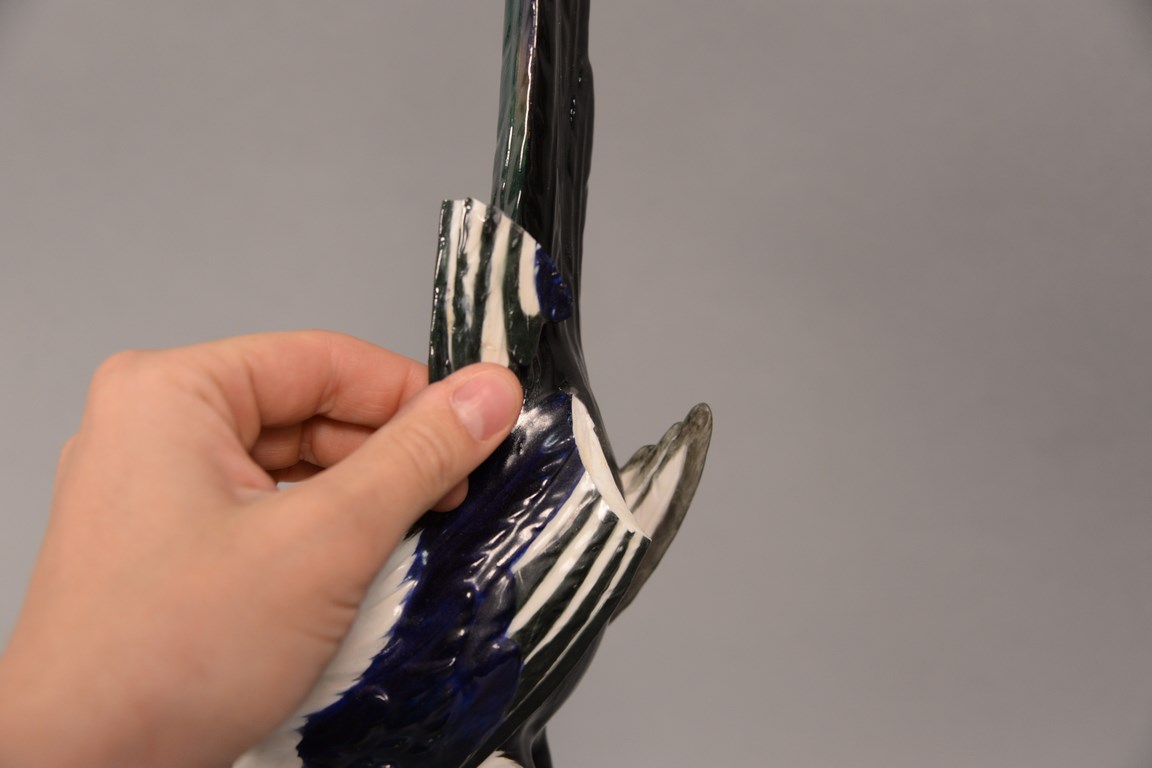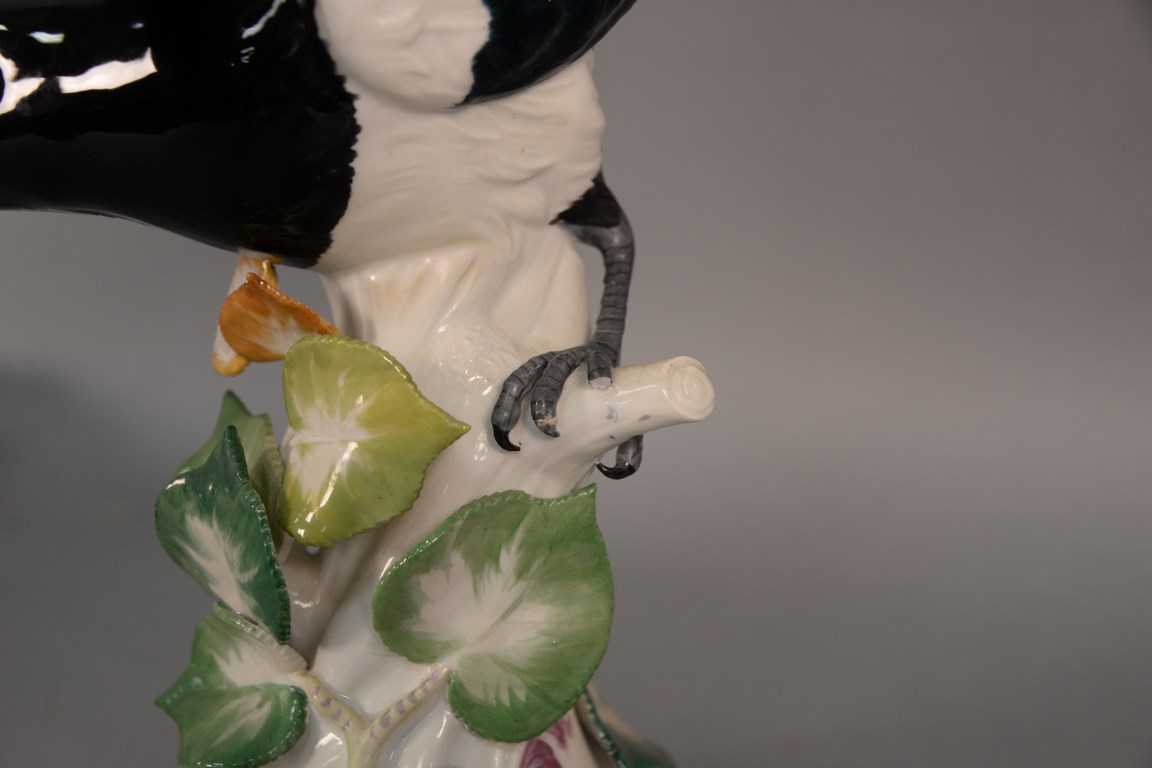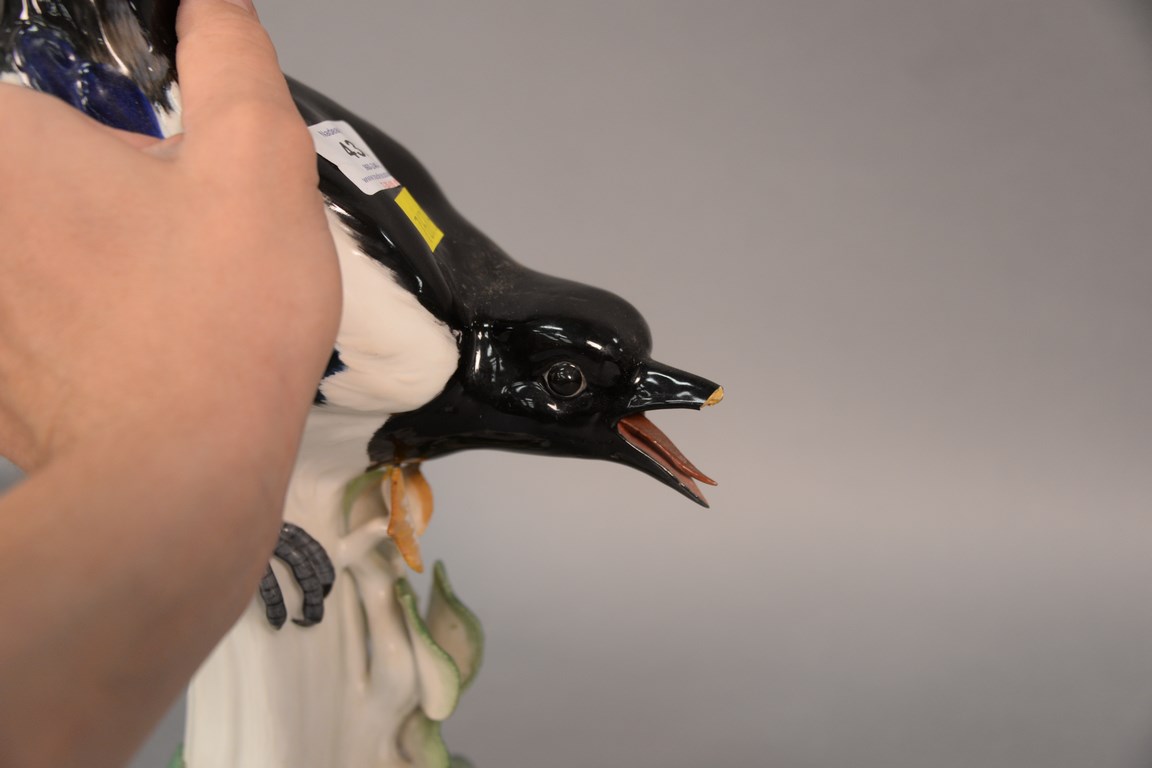 Large Meissen bird perched on tree nose and wing broke. ht. 21 in.
