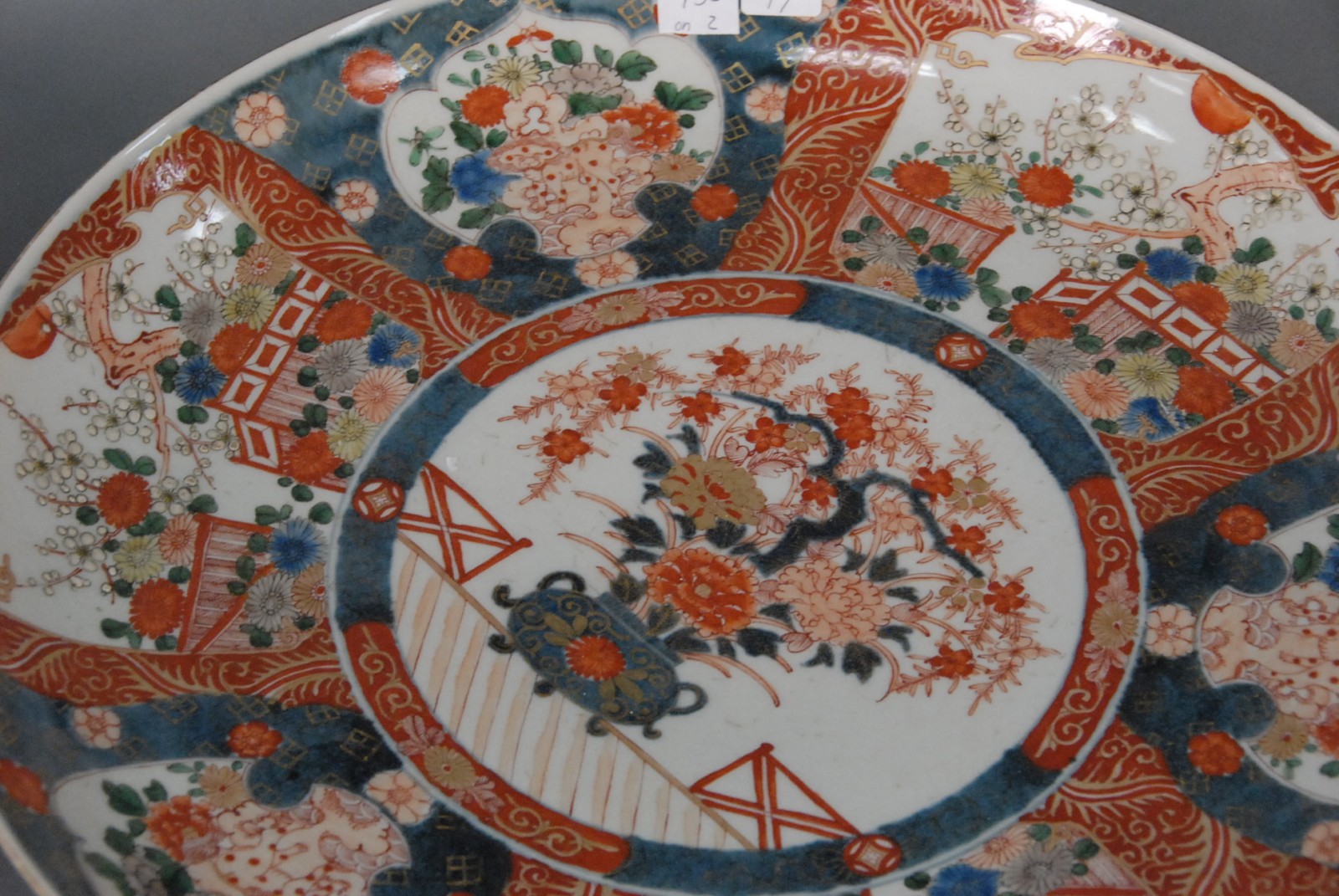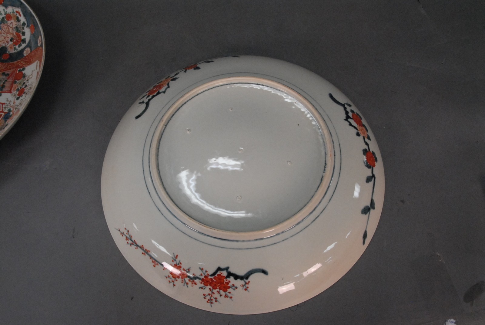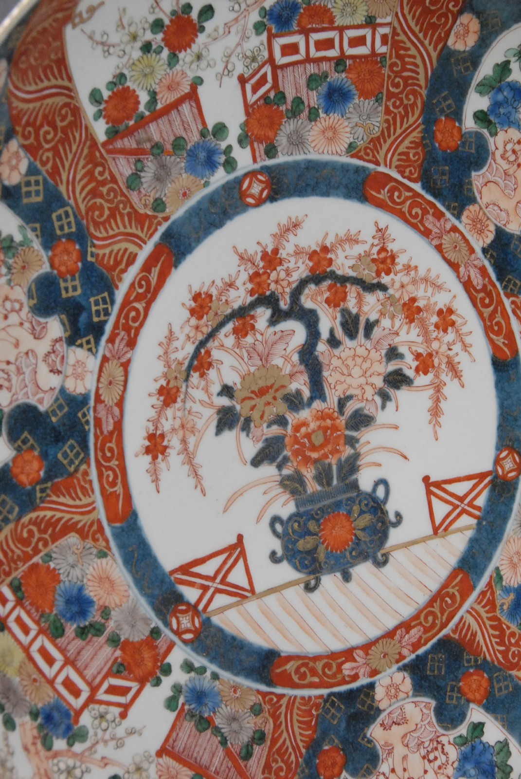 Large pair of Japanese Imari chargers with central floral basket, Mejia/Taisho period, early 20th century.