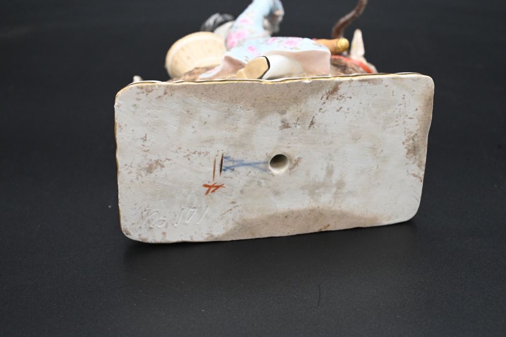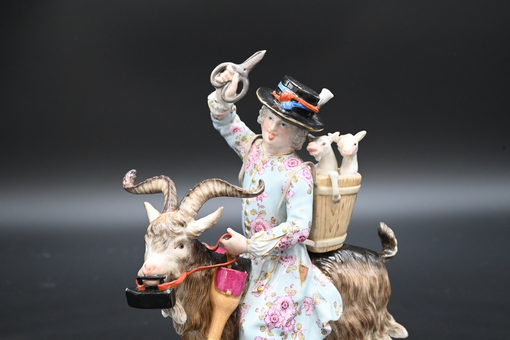Lot 432: Meissen Porcelain Figure, “Count Bruhl’s Tailor”, modeled as a tailor riding a goat and holding a basket with a lamb; crossed blue s…