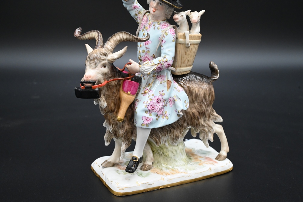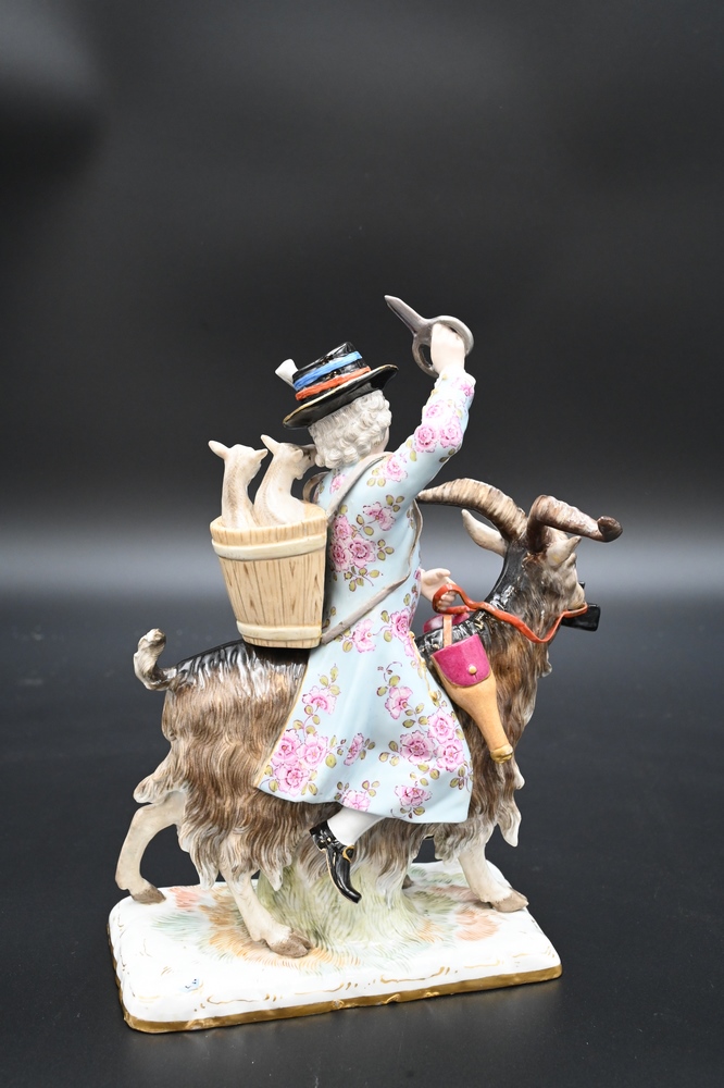 Meissen Porcelain Figure, “Count Bruhl’s Tailor”, modeled as a tailor riding a goat and holding a basket with a lamb; crossed blue sword mark on bottom, height 8 3/4 inches, (chipped).
