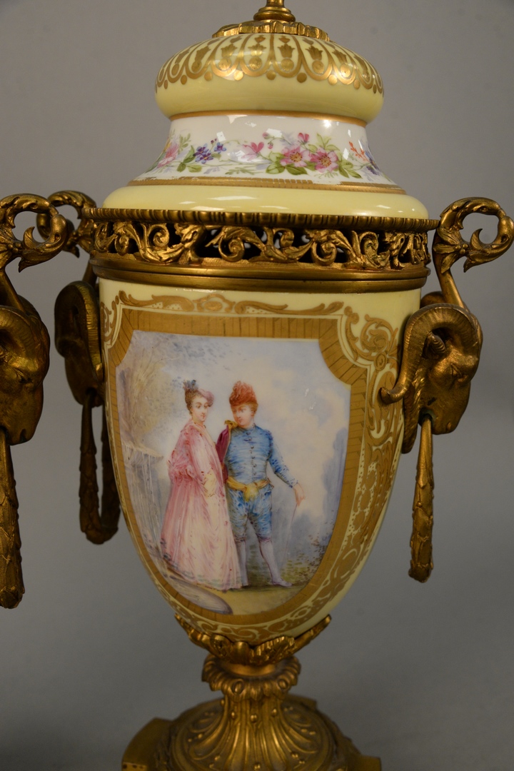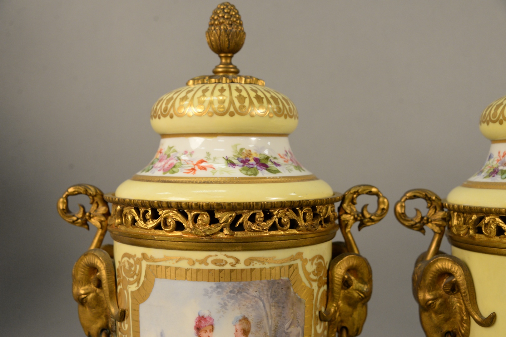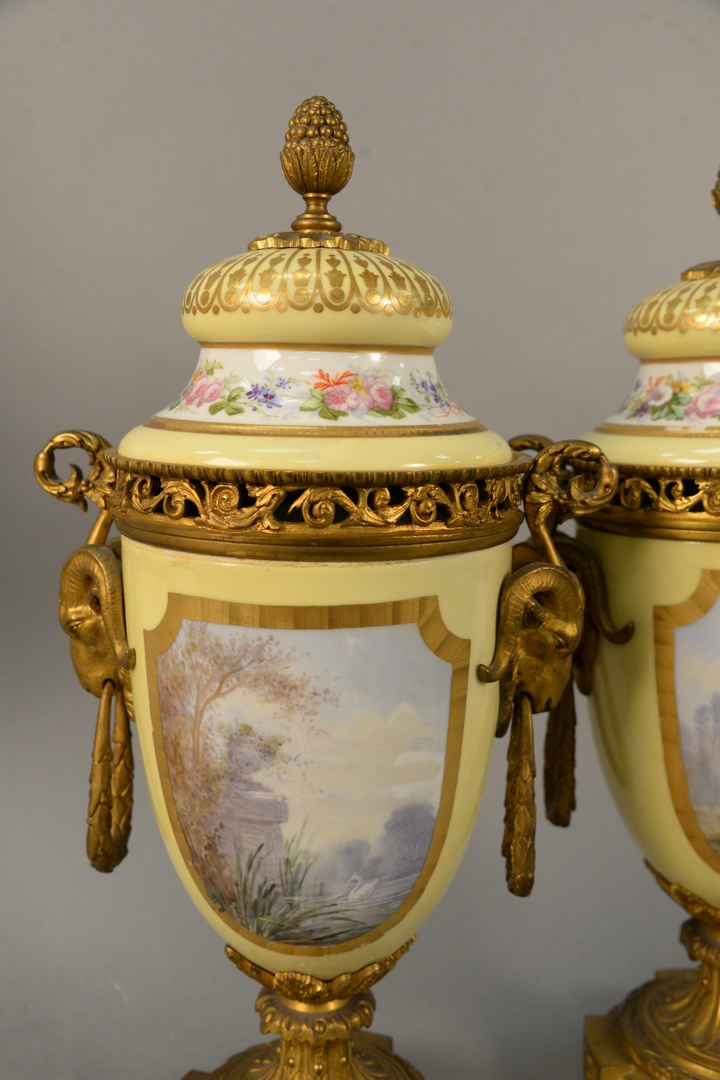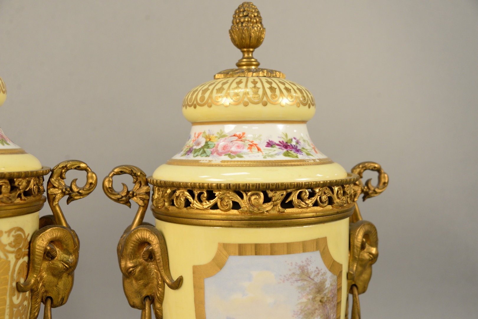 Pair of Sevres Porcelain and Gilt Bronze Urns yellow ground, with paint scenes on both sides, mounted with ram’s head and loop handles, on round bronze foot, both marked on inside of cover height 20 inches, width 10 inches Provenance: The Estate of Alina Roisen, Park Avenue, New York