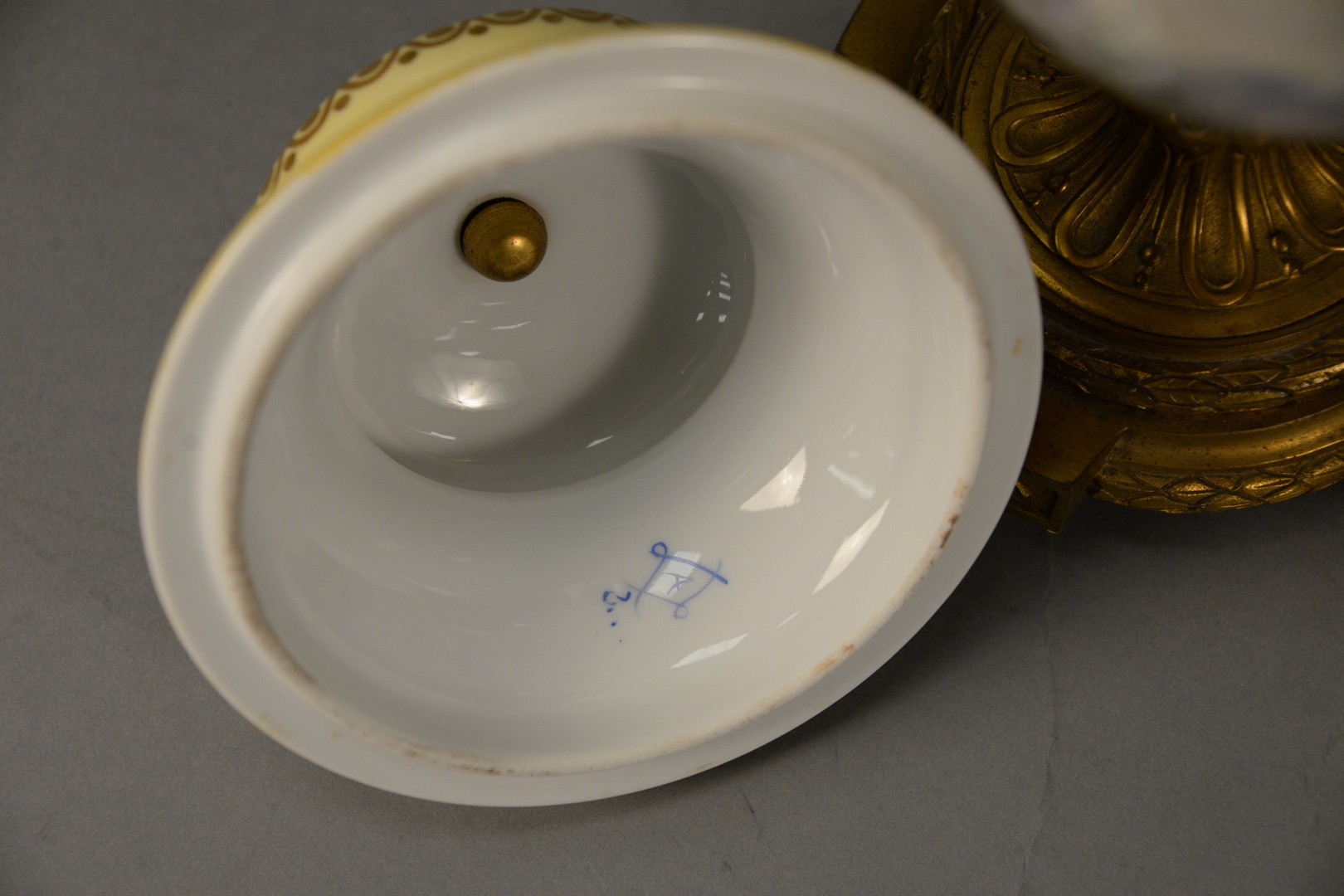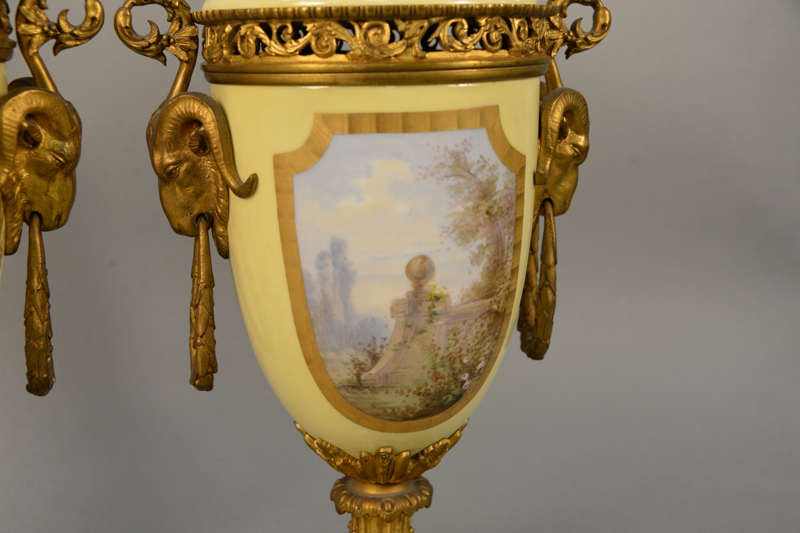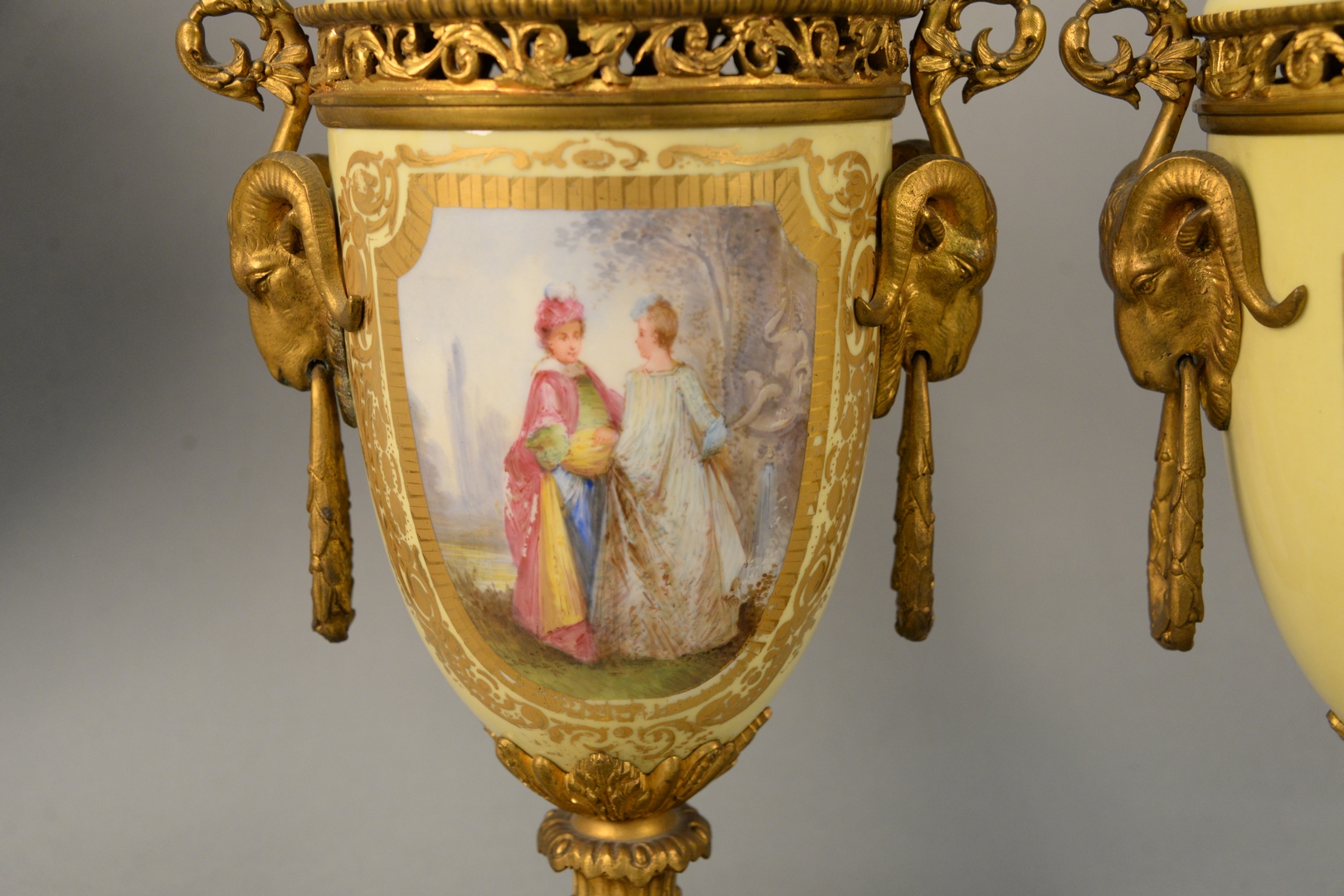 Pair of Sevres Porcelain and Gilt Bronze Urns yellow ground, with paint scenes on both sides, mounted with ram’s head and loop handles, on round bronze foot, both marked on inside of cover height 20 inches, width 10 inches Provenance: The Estate of Alina Roisen, Park Avenue, New York