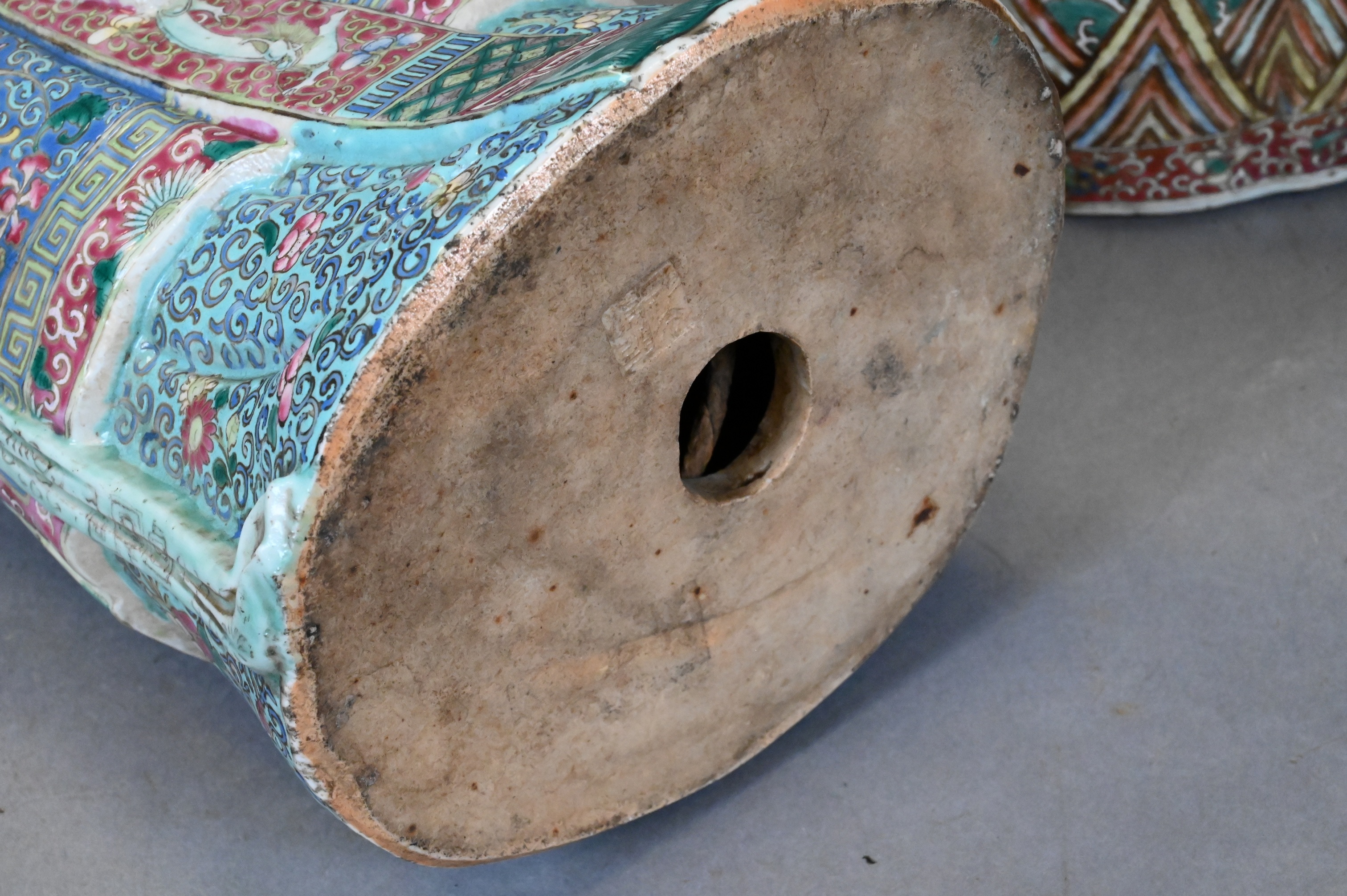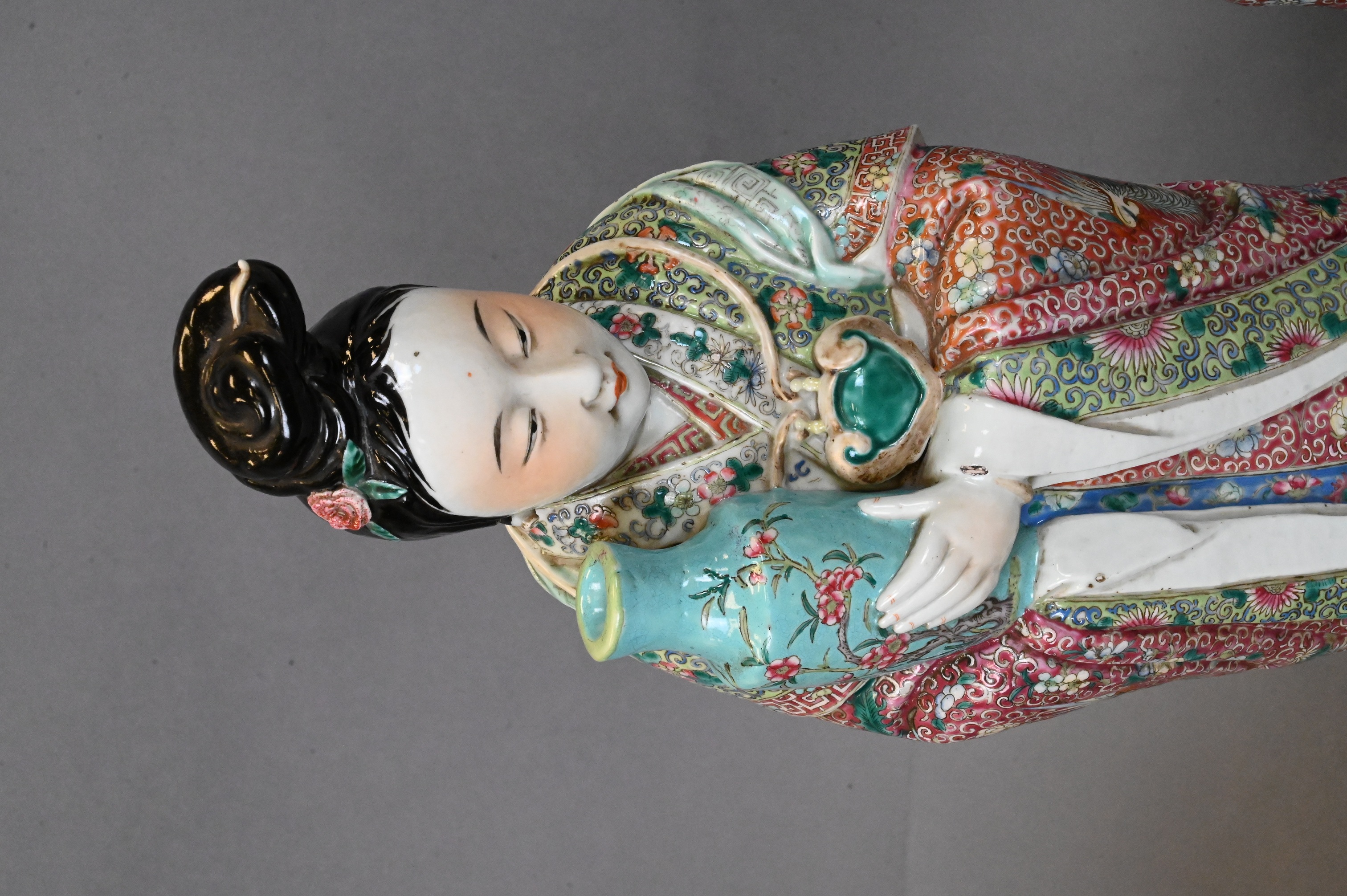 both female immortals, possibly He Xiangu, depicted carrying a basket of peaches, her robe richly decorated with multicolored floral and geometric patterns on a turquoise-ground along with figure holding a turquoise-glazed vase. Her hair is swept up into a high coiffure, adorned with a flower