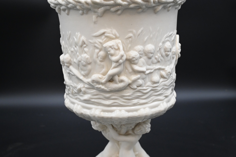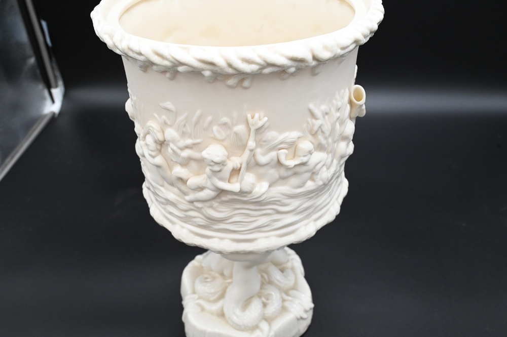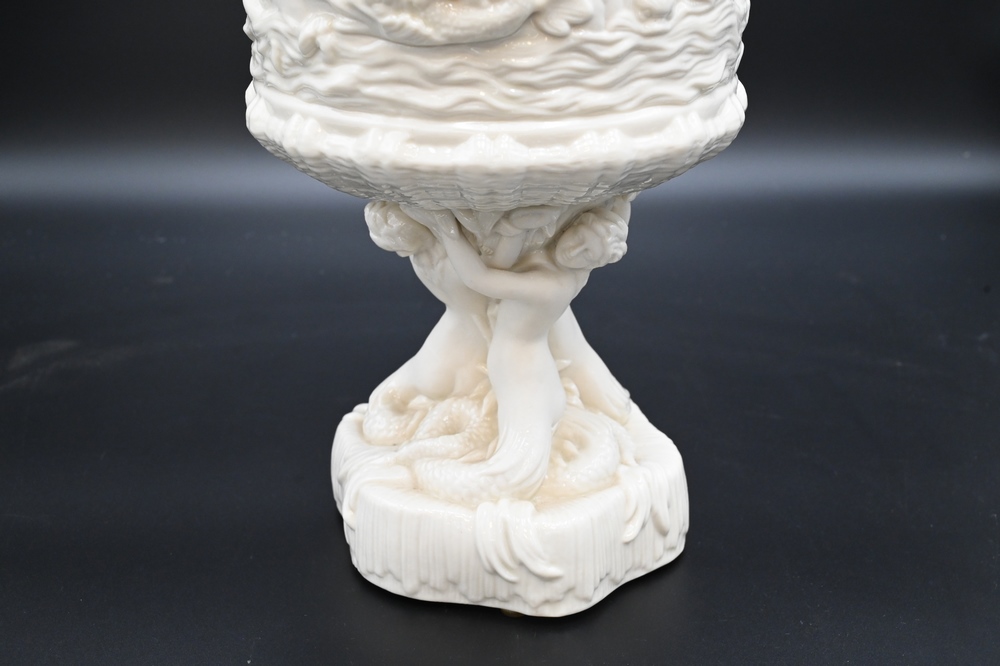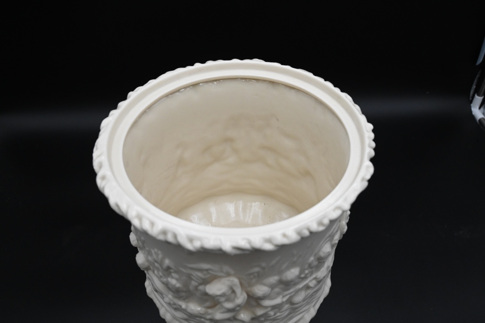 Belleek Covered Porcelain Ice Pail, having Prince of Wales pattern with green mark on bottom, height 18 1/2 inches.